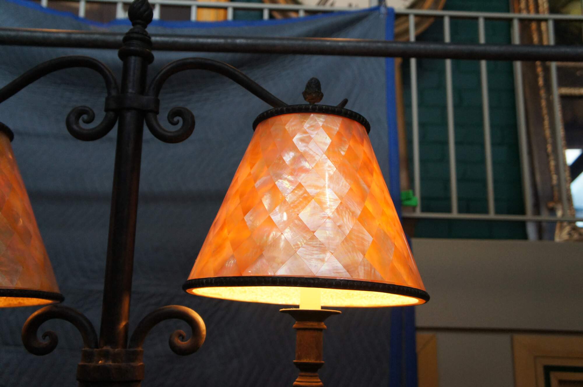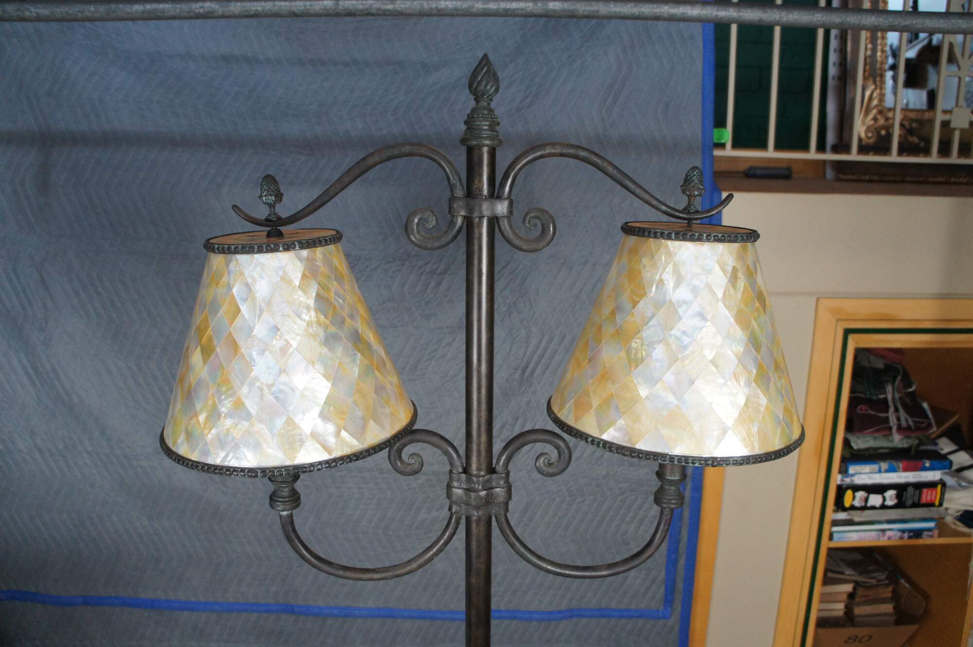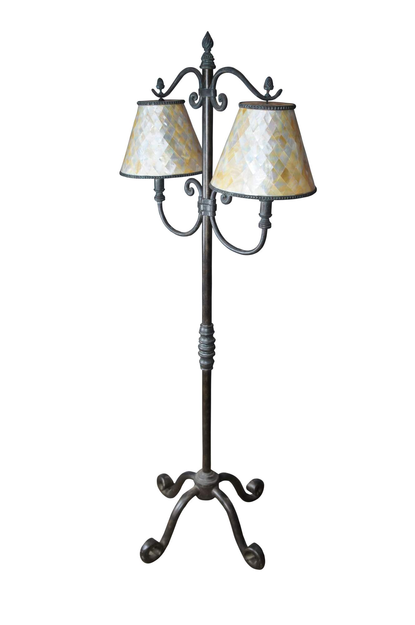 An impressive Iron Floor Lamp Handmade by Maitland Smtih. Features a rich patinated finish with scrolled accents and two Mother of Pearl hanging shades with Tessellated Harlequin pattern. Finial is twisted in a torchiere shape. The lamp is supported by a four legged base