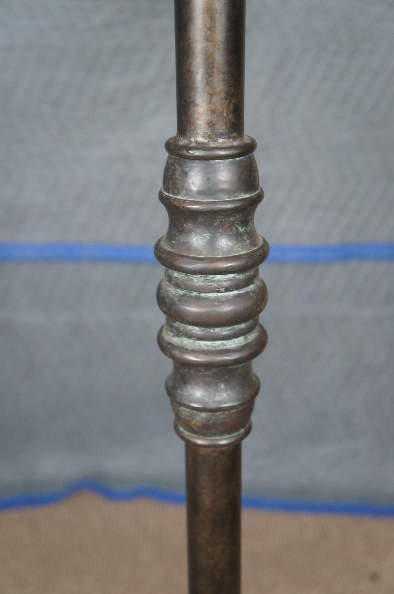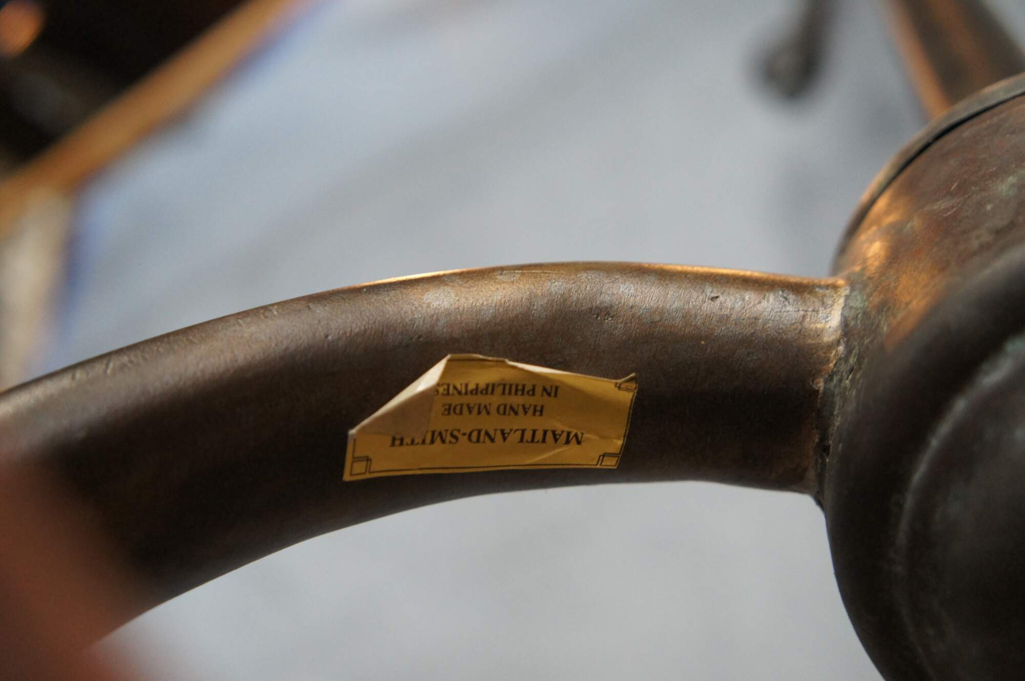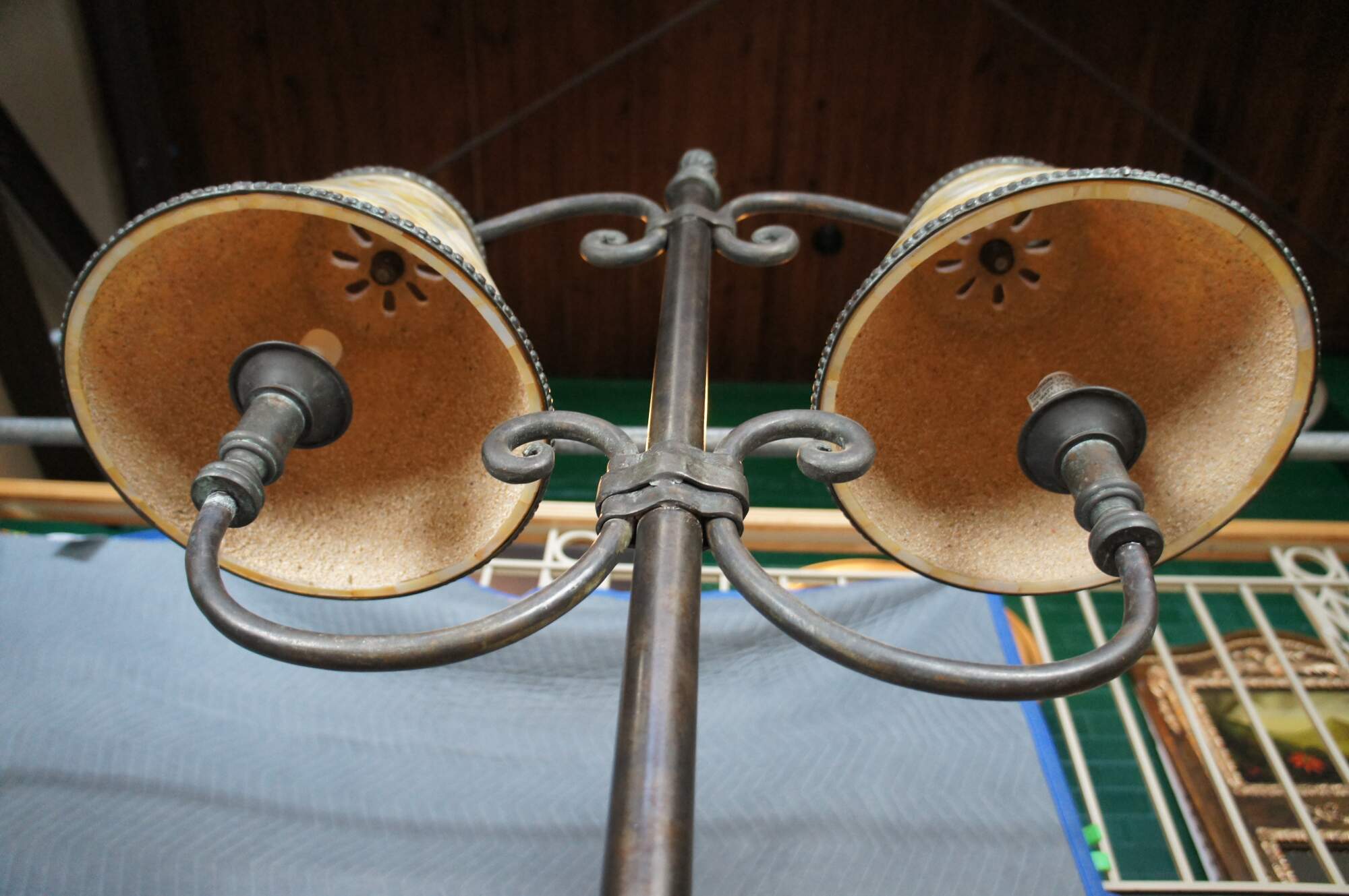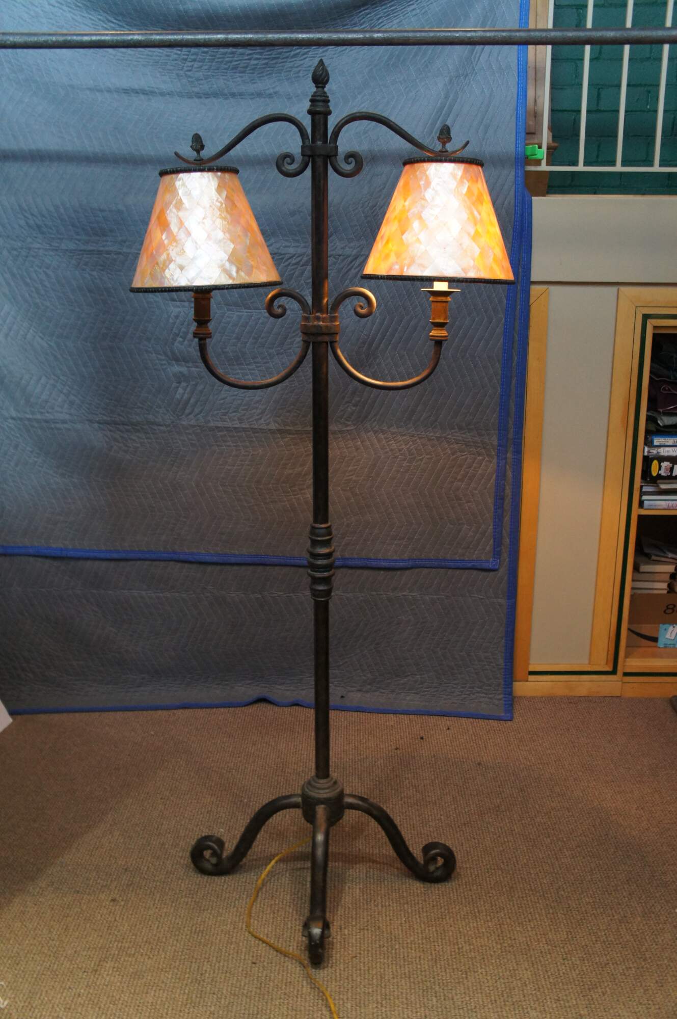 An impressive Iron Floor Lamp Handmade by Maitland Smtih. Features a rich patinated finish with scrolled accents and two Mother of Pearl hanging shades with Tessellated Harlequin pattern. Finial is twisted in a torchiere shape. The lamp is supported by a four legged base