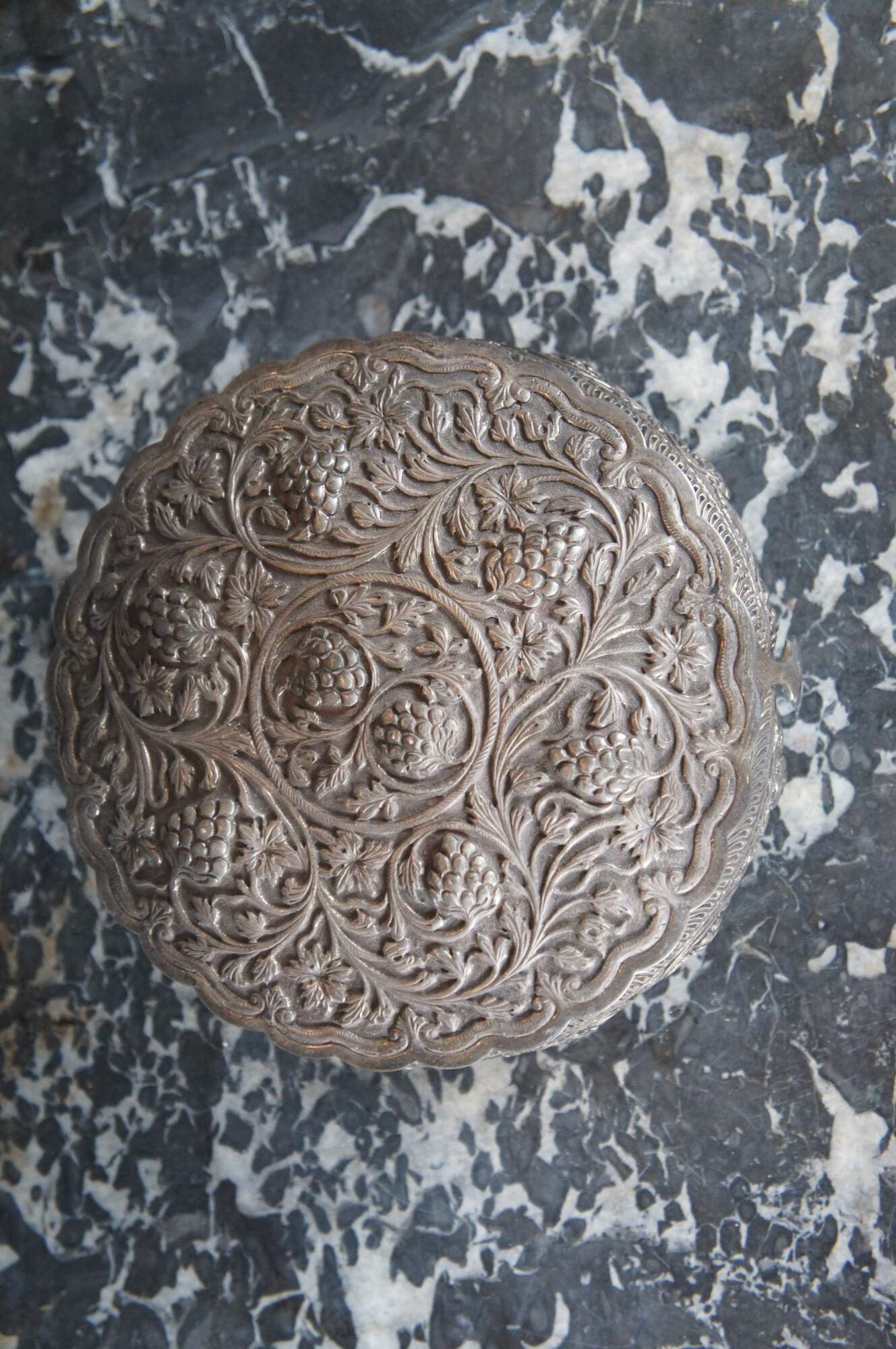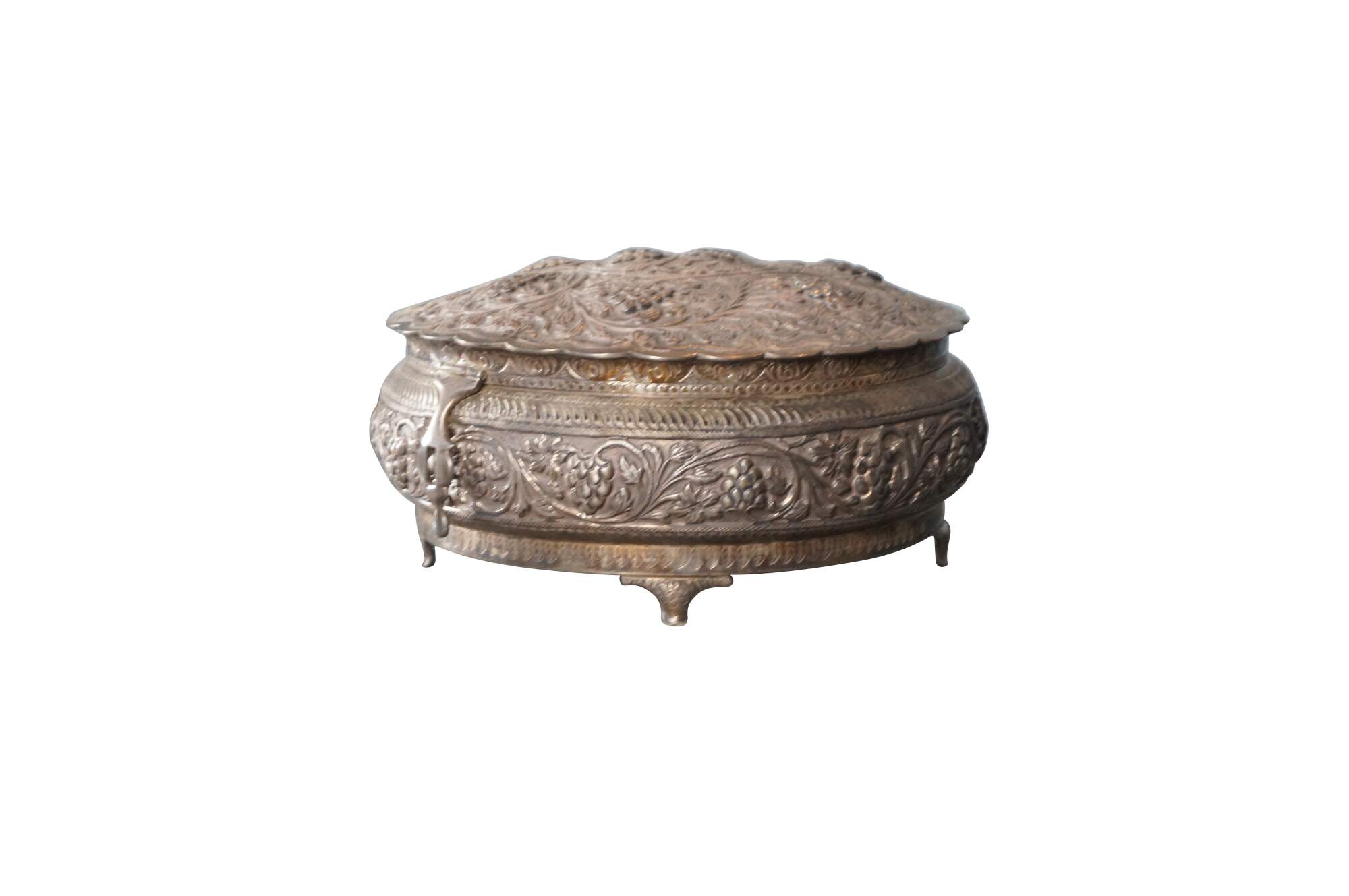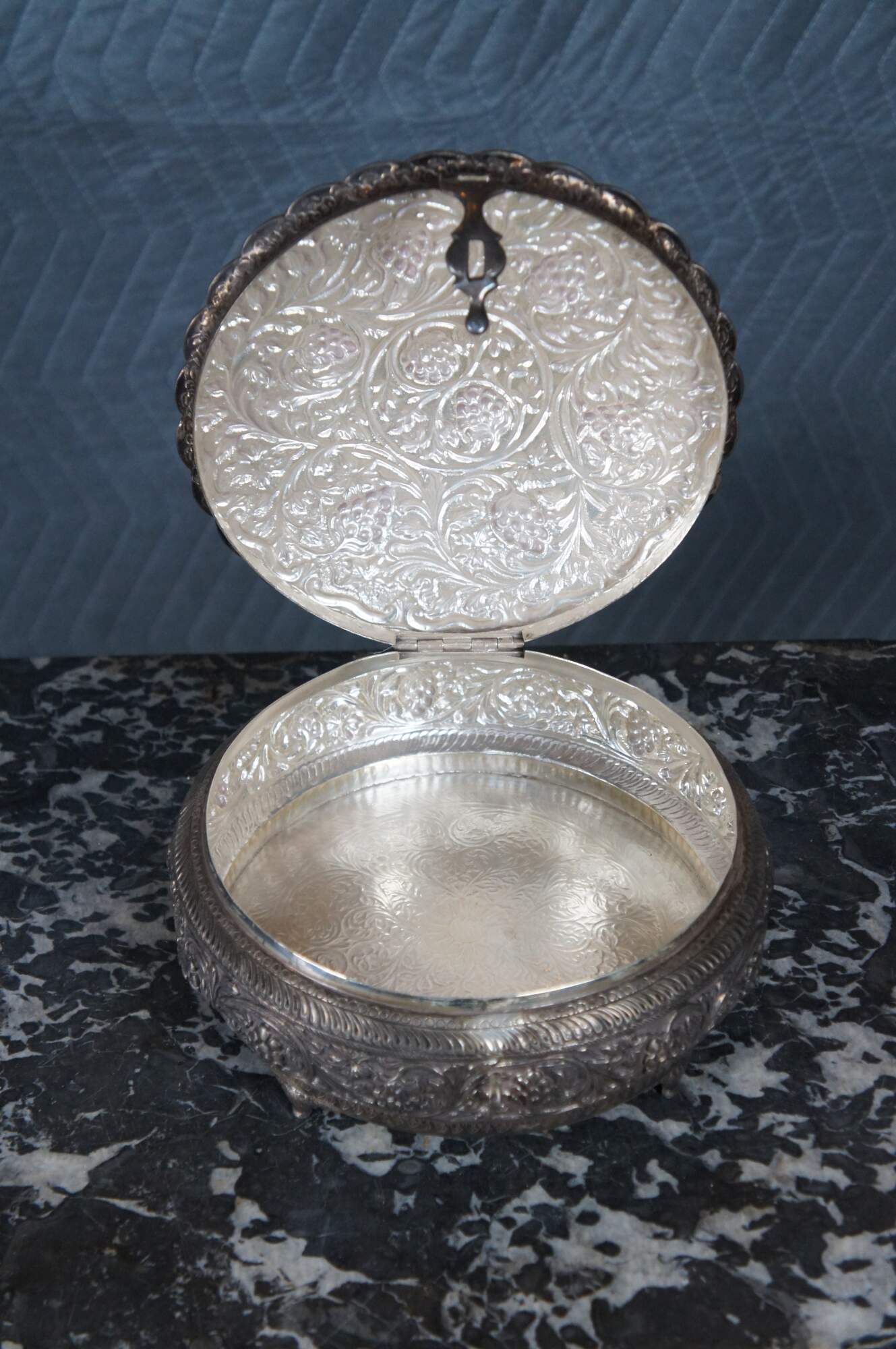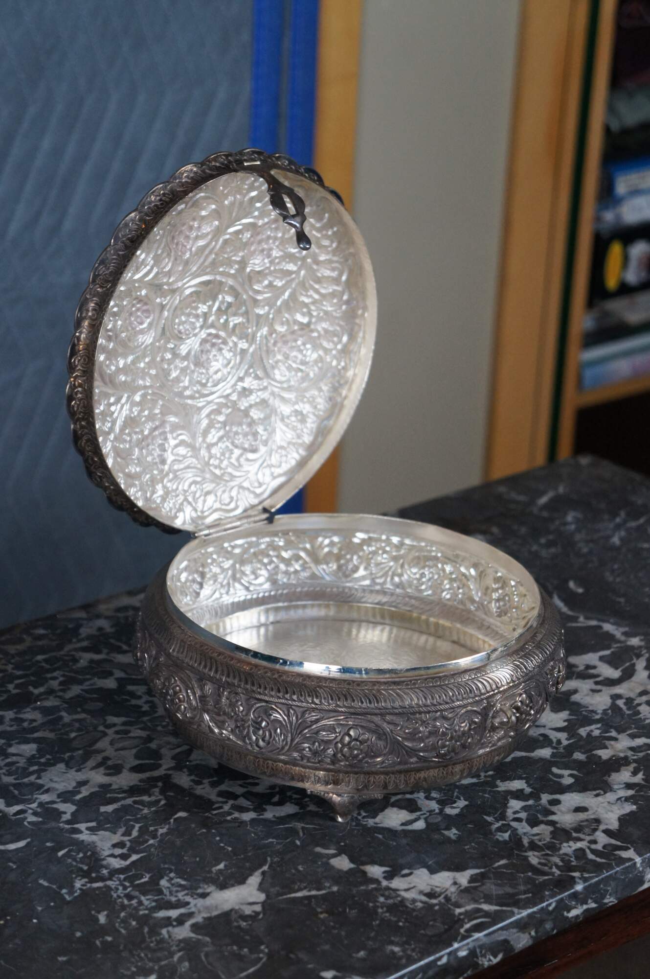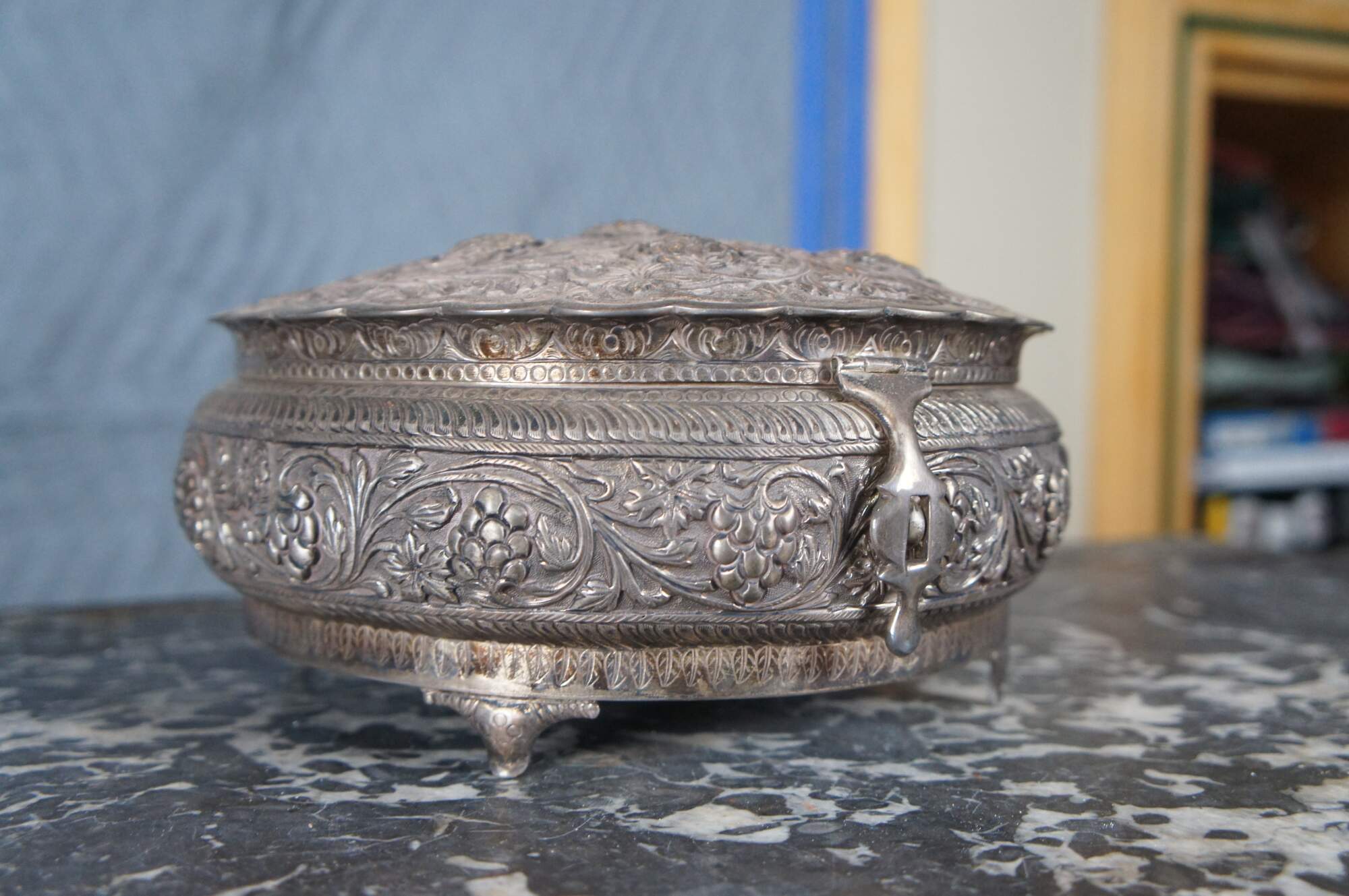 20th century round silverplate decorative box. Features a beautiful repousse pattern of berries a vines. The container is lidded with a latch for locking. The lid features a scalloped edge over decorative chasing and gadrooning. The box is on feet added splendor.