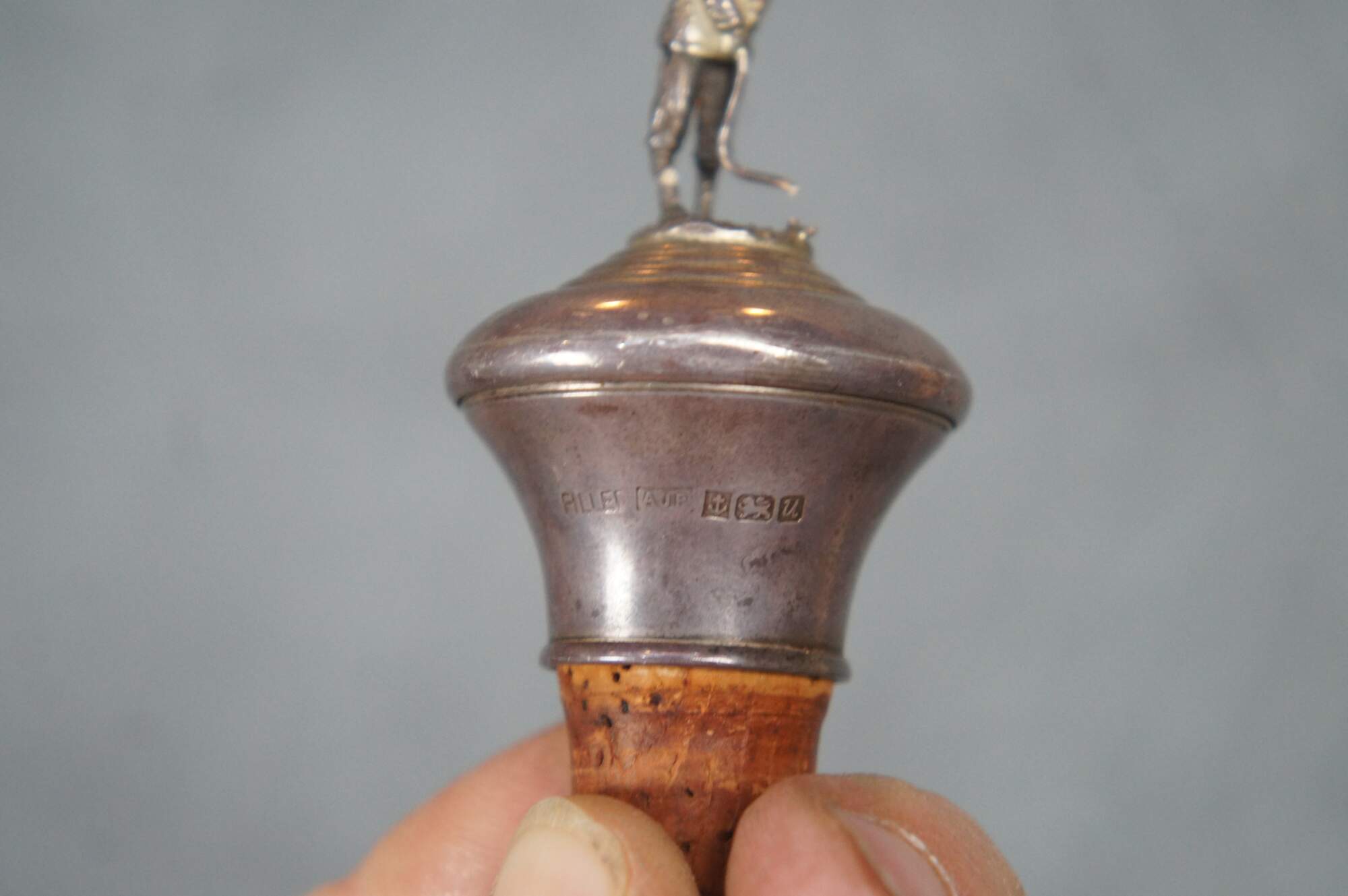 2 Birmingham Silver Co. Sterling Silver Decorative golf themed wine bottle stoppers. Features cross clubs and a man with club. Hallmarked along the side.