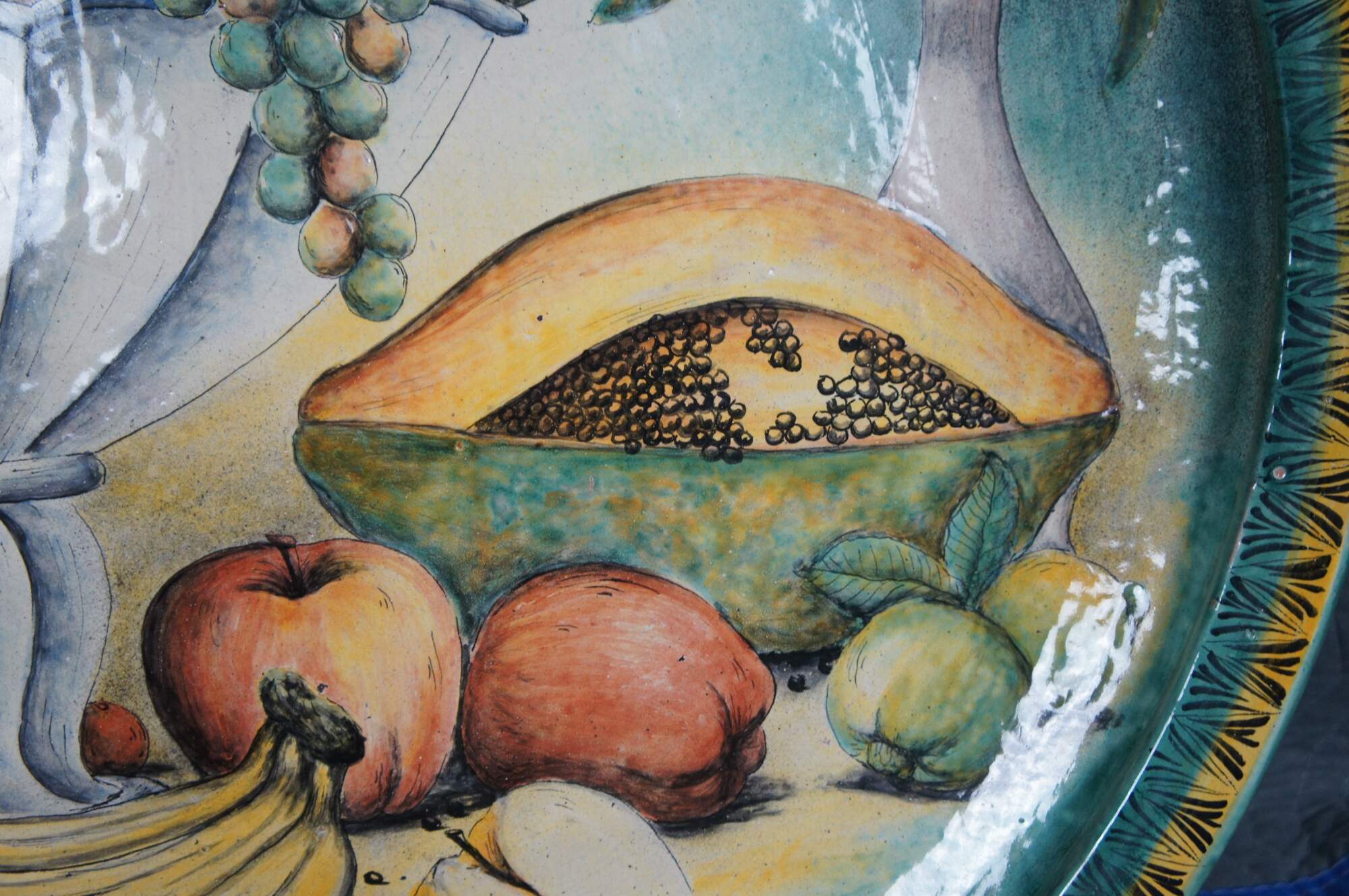 A beautiful 20th century Majolica Platter / Decorative Wall Plate. Made in Santa Rosa de Lima (Villagrán), Guanajuato. Features a hand painted still life of a compote with pears, grapefruit and a watermelon. A papaya, apples, bananas and more fruit are resting next to the compote. Towards the back right is a vase with yellow flower. The foreground of the plate is green with a yellow edge and black decorative pattern.Spanish-influenced Talavera and Italian Maiolica are sub-genres. Mexican Majolica primarily differs from traditional Talavera in the art form and use of colors. Traditional Talavera is known for its intricate pattern work whereas Majolica uses more free-form designs and artwork.