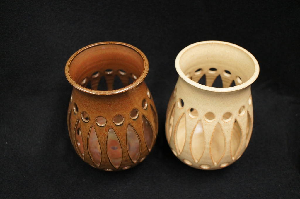 2 Small Tan & Brown Rare Art Deco Design Hand Signed 1986 Noveau Vases 6.25