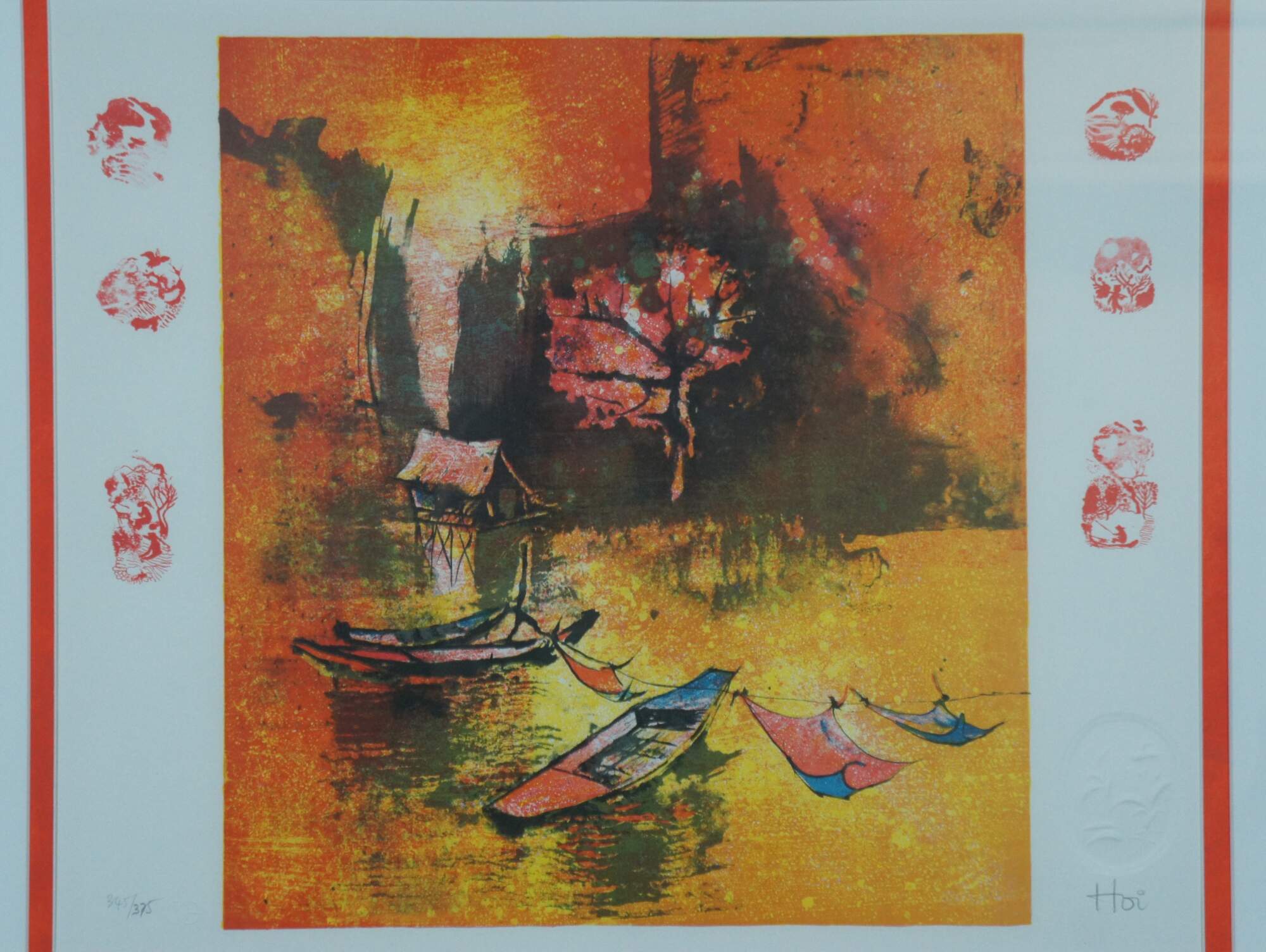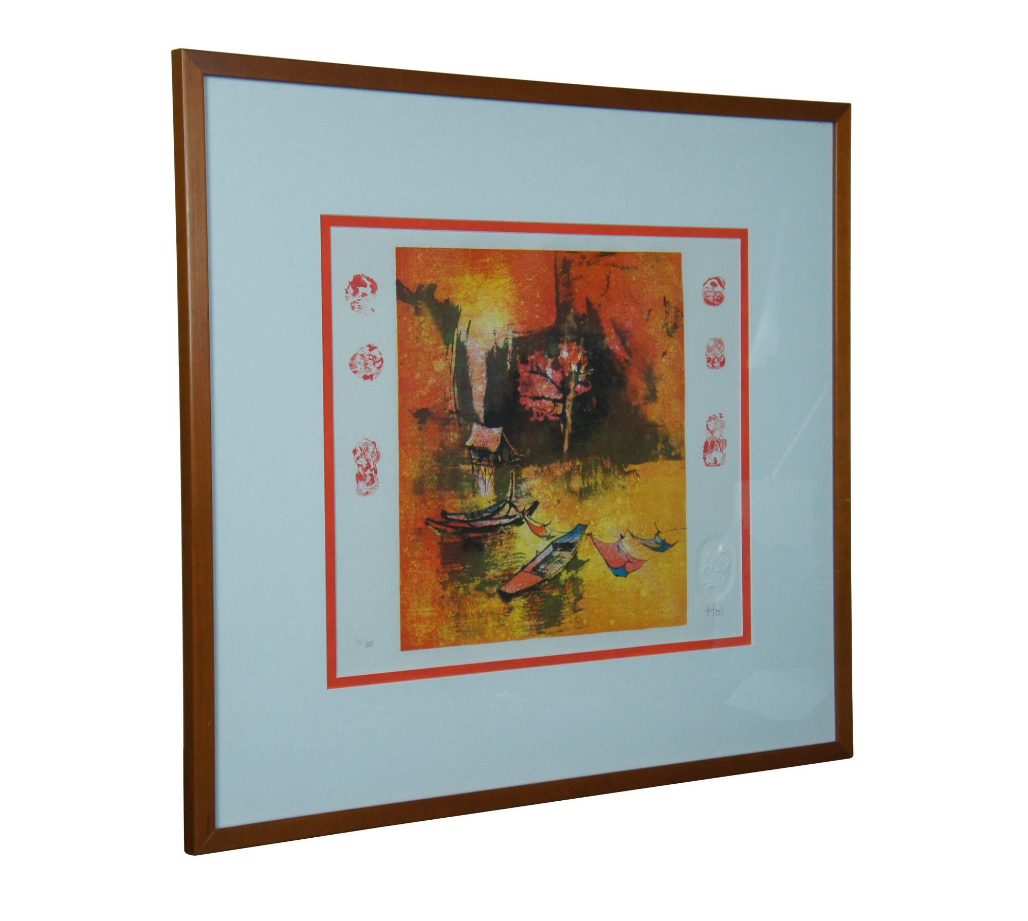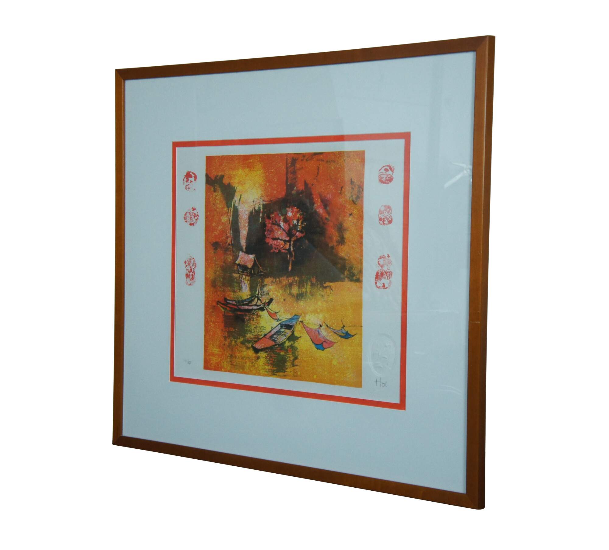 Mid century 1962 nautical Vietnamese waterway scene titled "Boat Clothesline. This lithograph print by Hoi Lebadang shows a semi abstract seascape in reds and oranges of boats and laundry strung over water, in front of a tree and a small cottage on stilts. The white space is stamped with six miniature landscape scenes and embossed CG and a floral design in opposite lower corners. Pencil signed Hoi (lower right) and numbered 345/375 (lower left). Plain wood frame; white and orange-red layered mat.