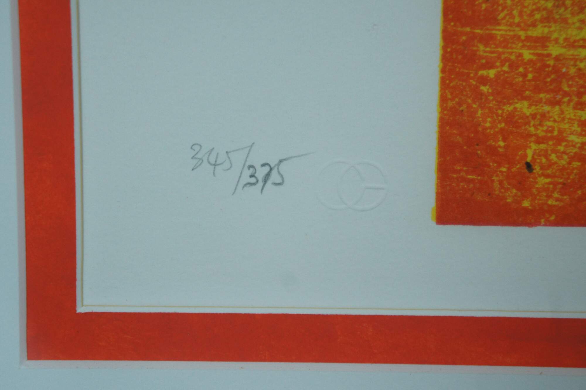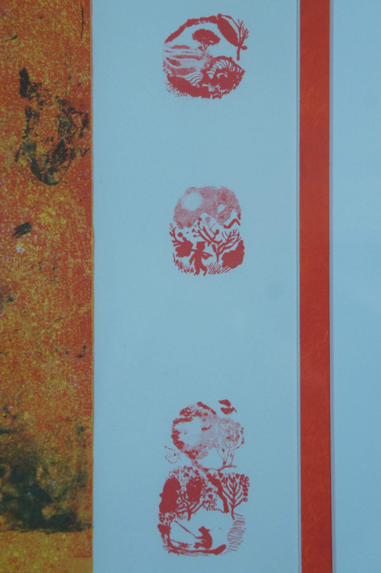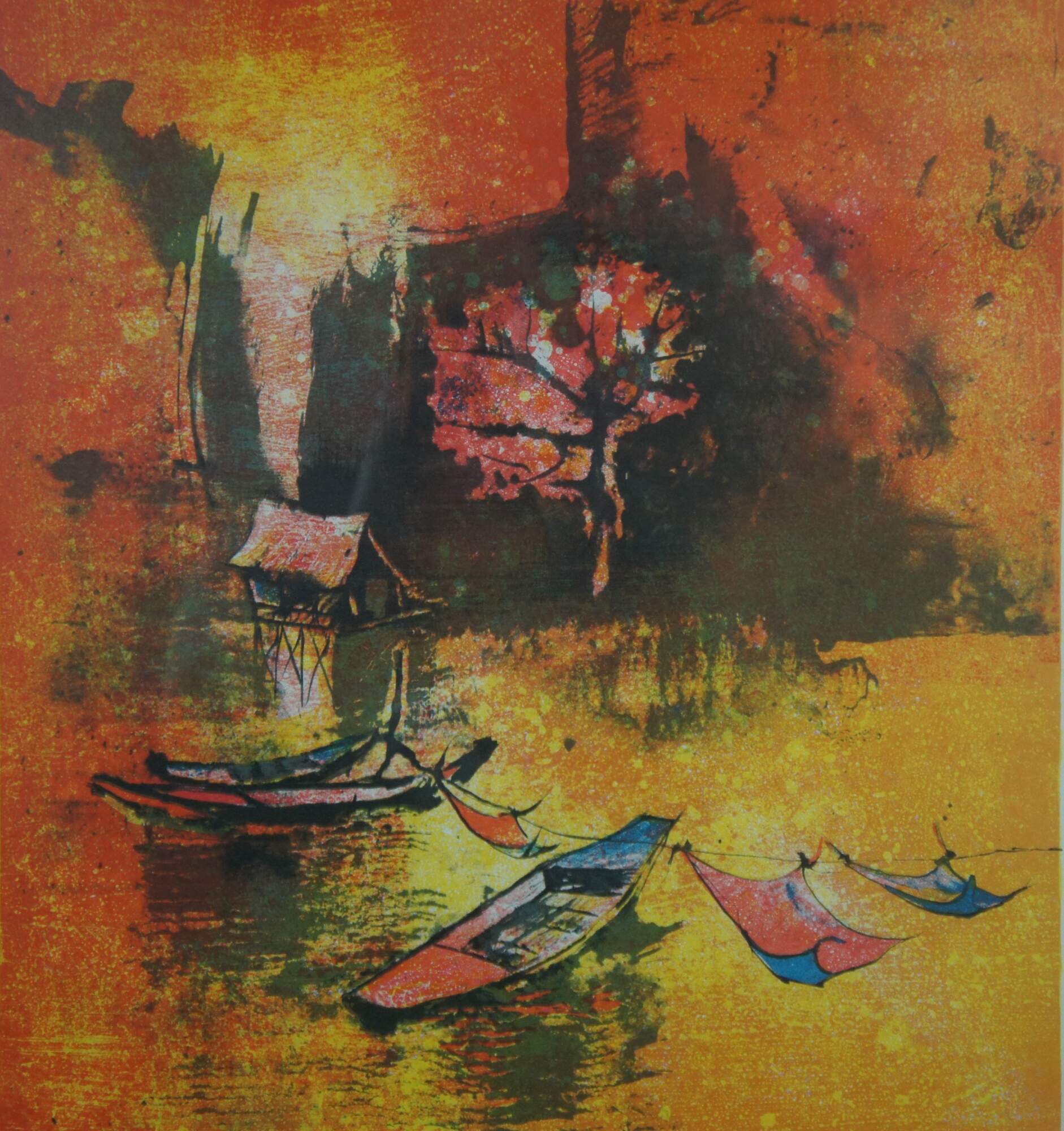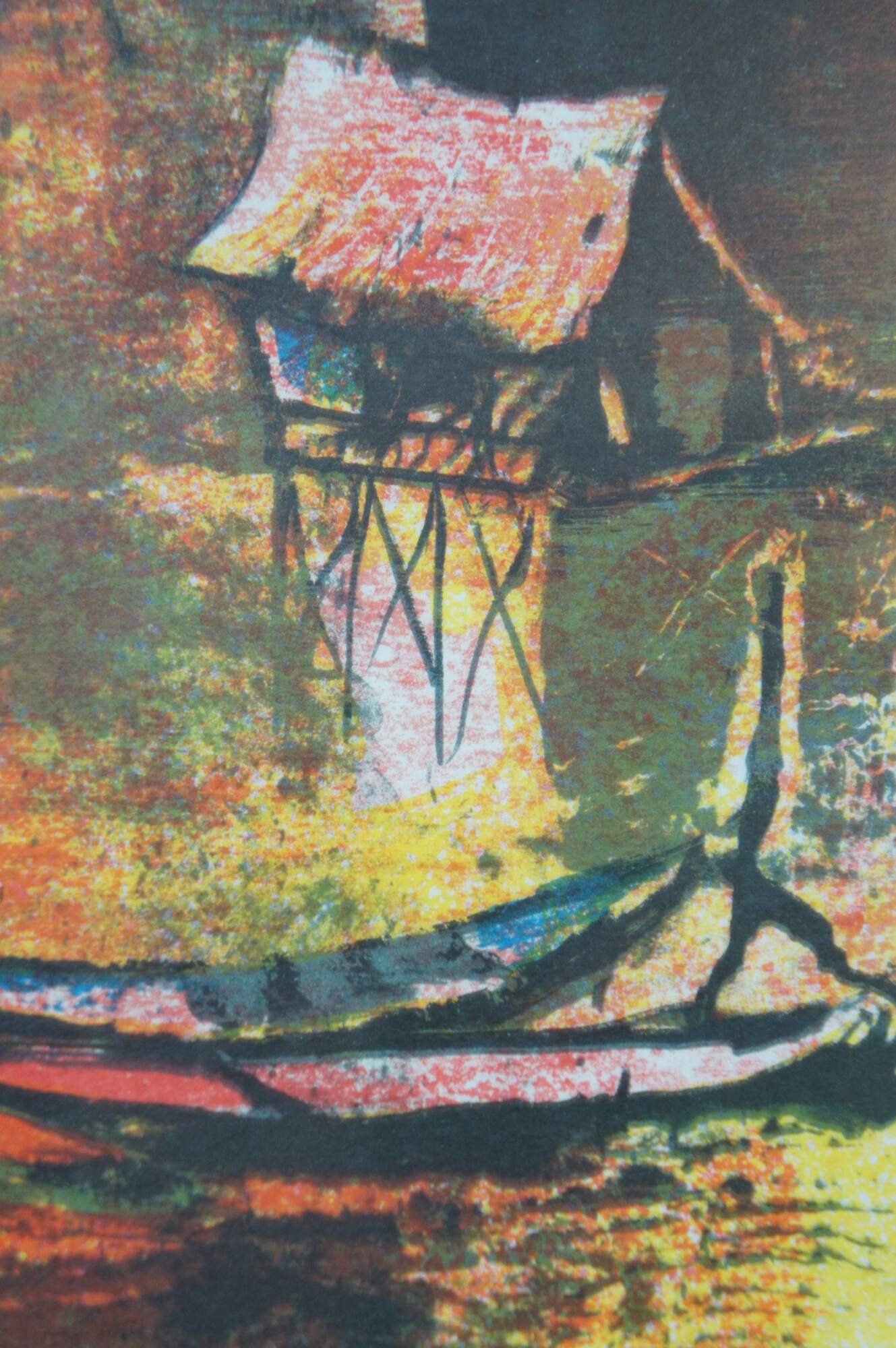 Mid century 1962 nautical Vietnamese waterway scene titled "Boat Clothesline. This lithograph print by Hoi Lebadang shows a semi abstract seascape in reds and oranges of boats and laundry strung over water, in front of a tree and a small cottage on stilts. The white space is stamped with six miniature landscape scenes and embossed CG and a floral design in opposite lower corners. Pencil signed Hoi (lower right) and numbered 345/375 (lower left). Plain wood frame; white and orange-red layered mat.