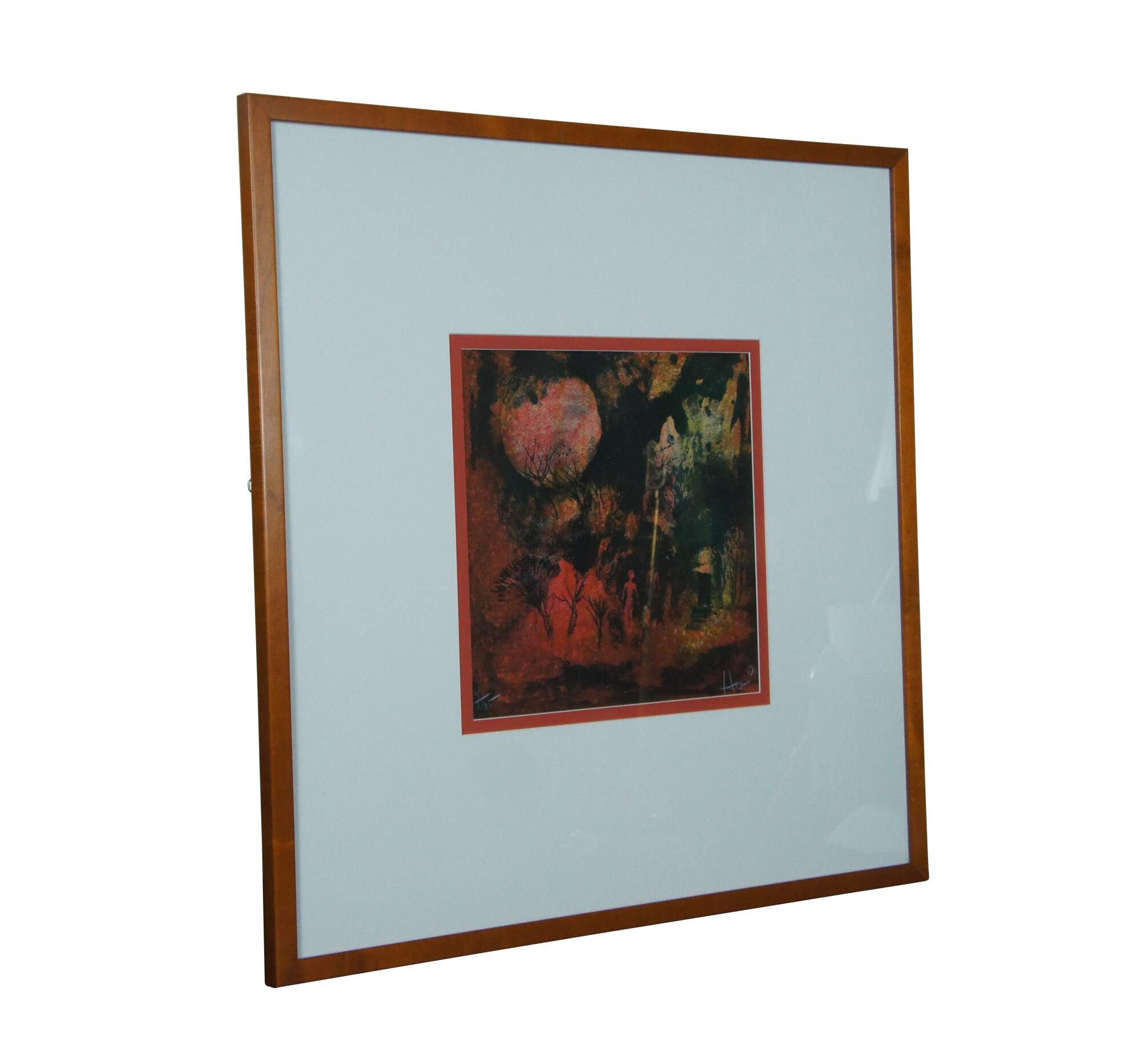 Mid century lithograph print titled Rendez Vous Sous La Loun (Meet under the Moon) by Hoi Ledabang. Shows a abstract landscape of trees in red, green and black under a moon lit sky, through which walks a pair of figures. Signed Hoi (lower right) and numbered 4/245 (lower left). Certificate of Authentication on back of frame. Plain wood frame; white and orange-red layered mat.