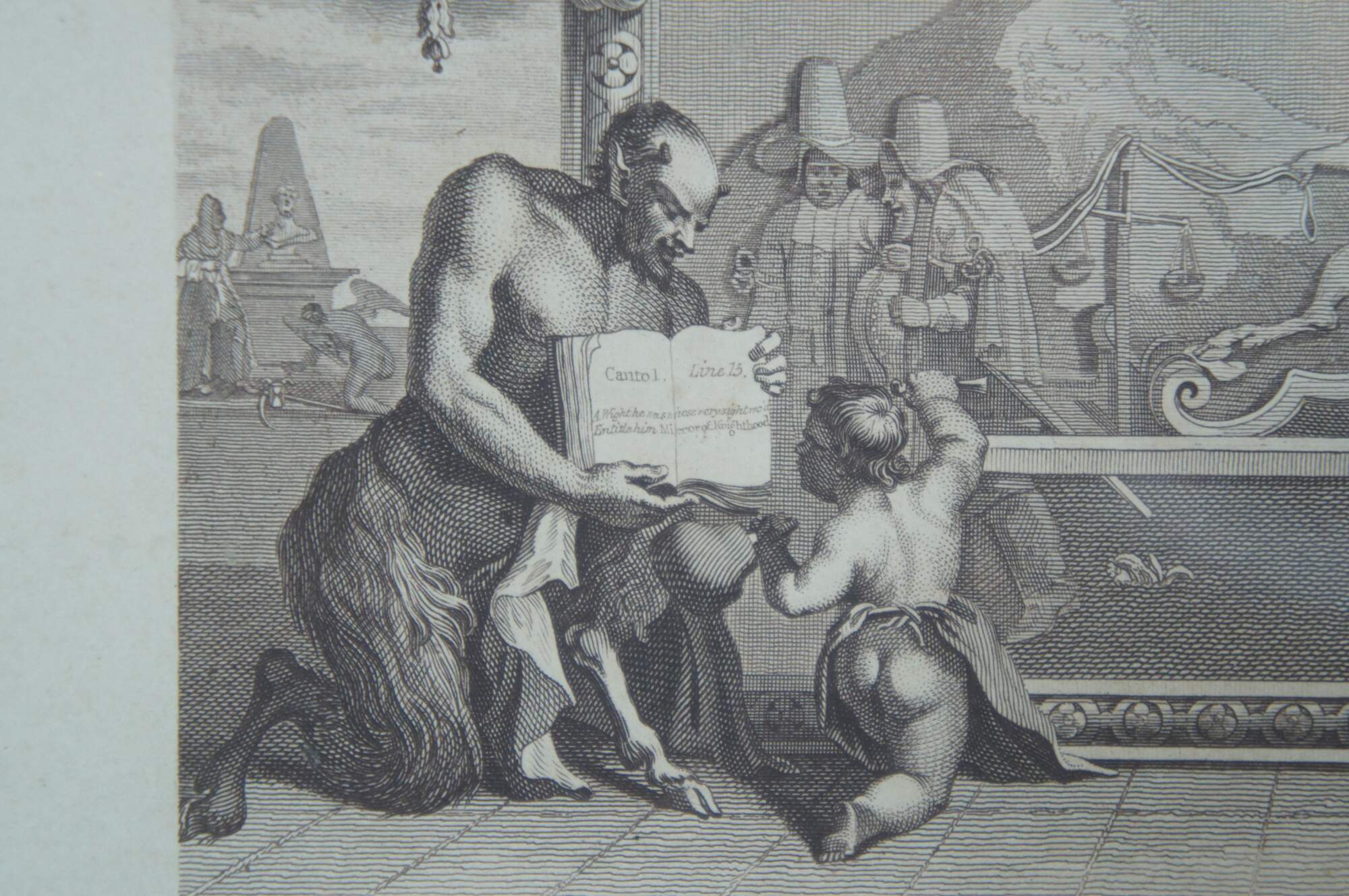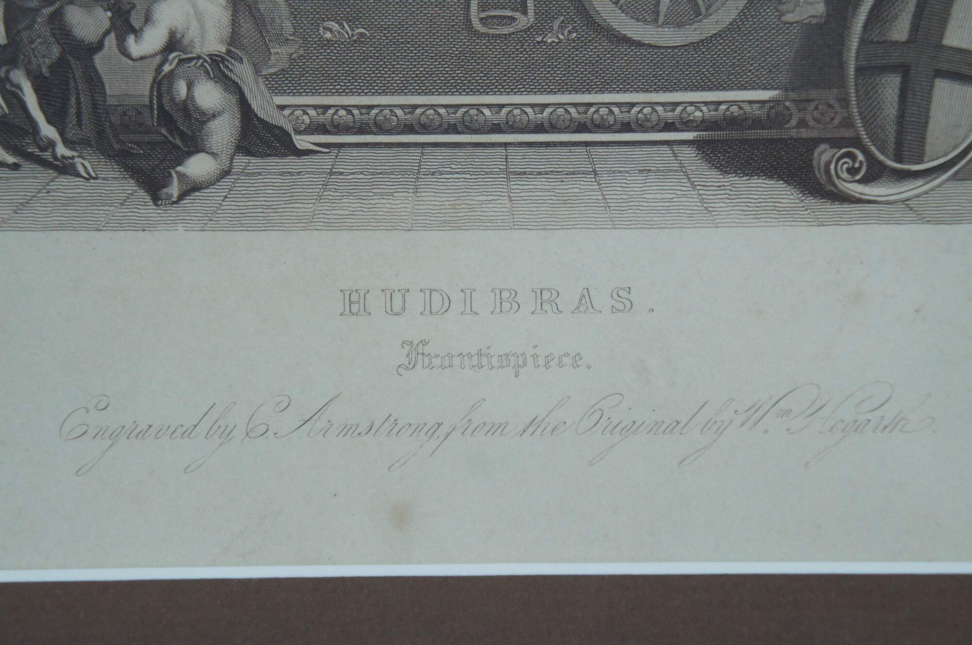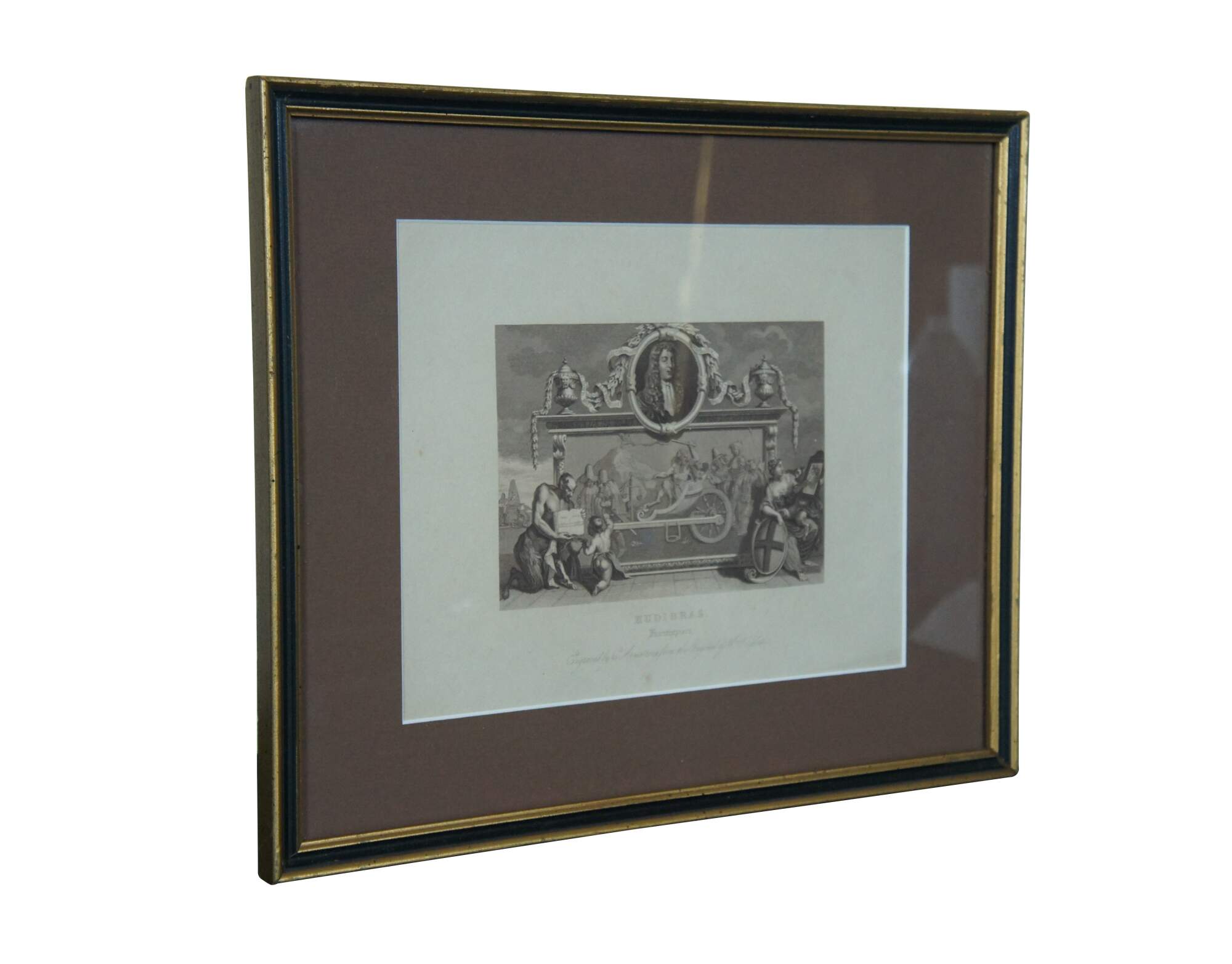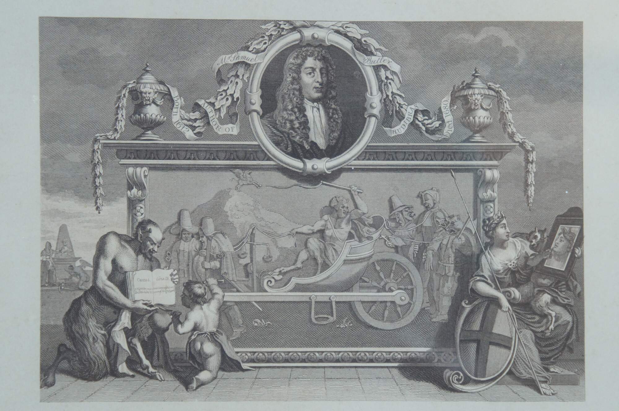 Early 19th century engraving of the frontispiece for the satirical poem "Hudibras" including a portrait of the author Samuel Butler (above the mantel), engraved by C. Armstrong from the original by William Hogarth. Giltwood frame with black painted bevel; brown mat.