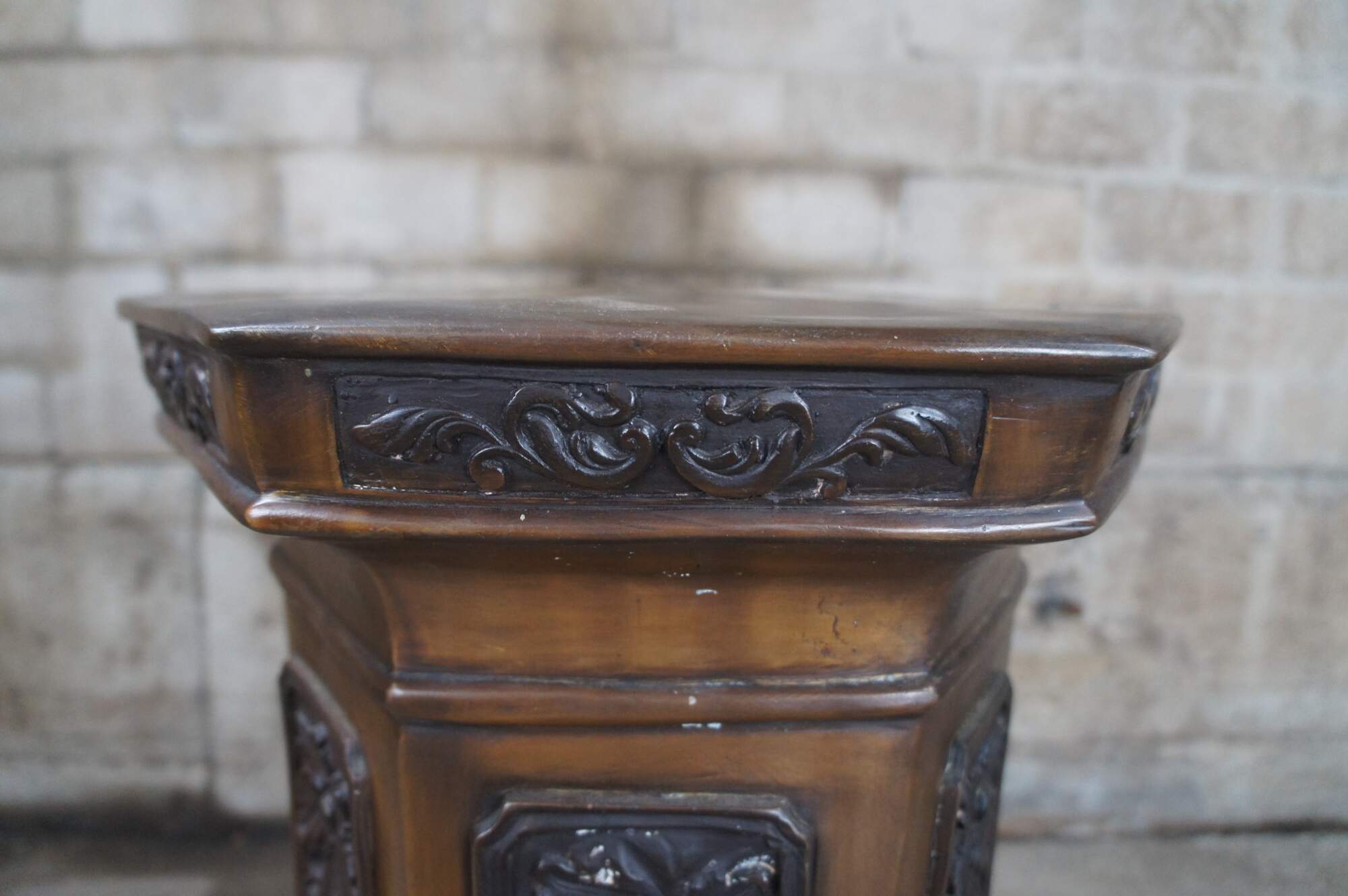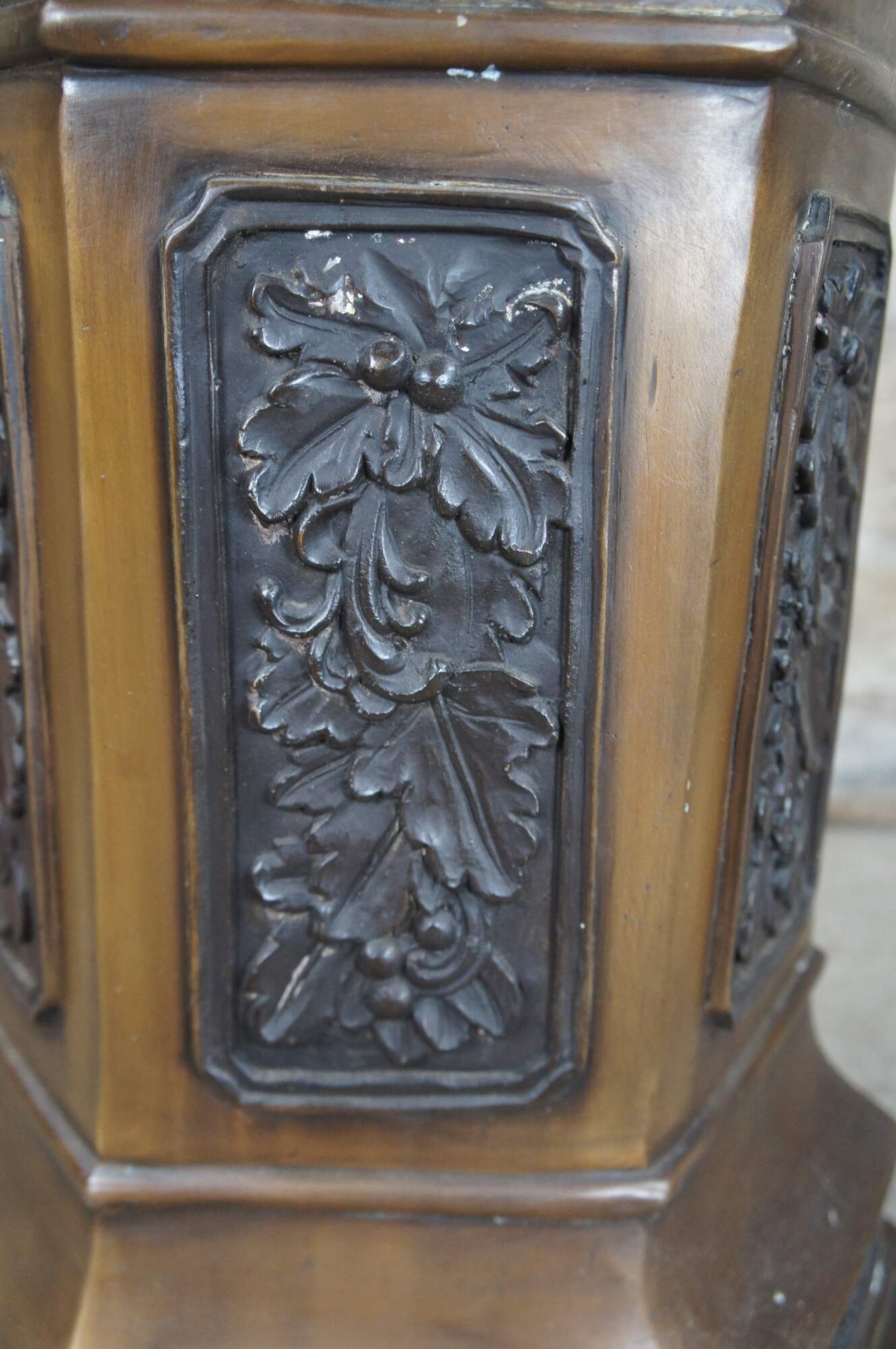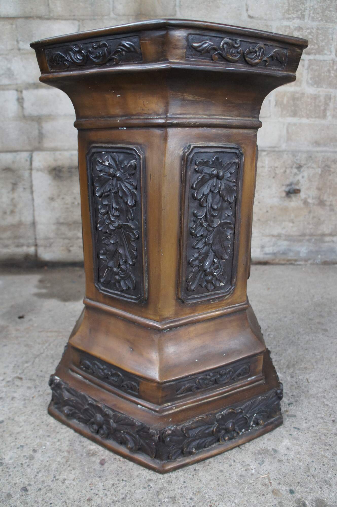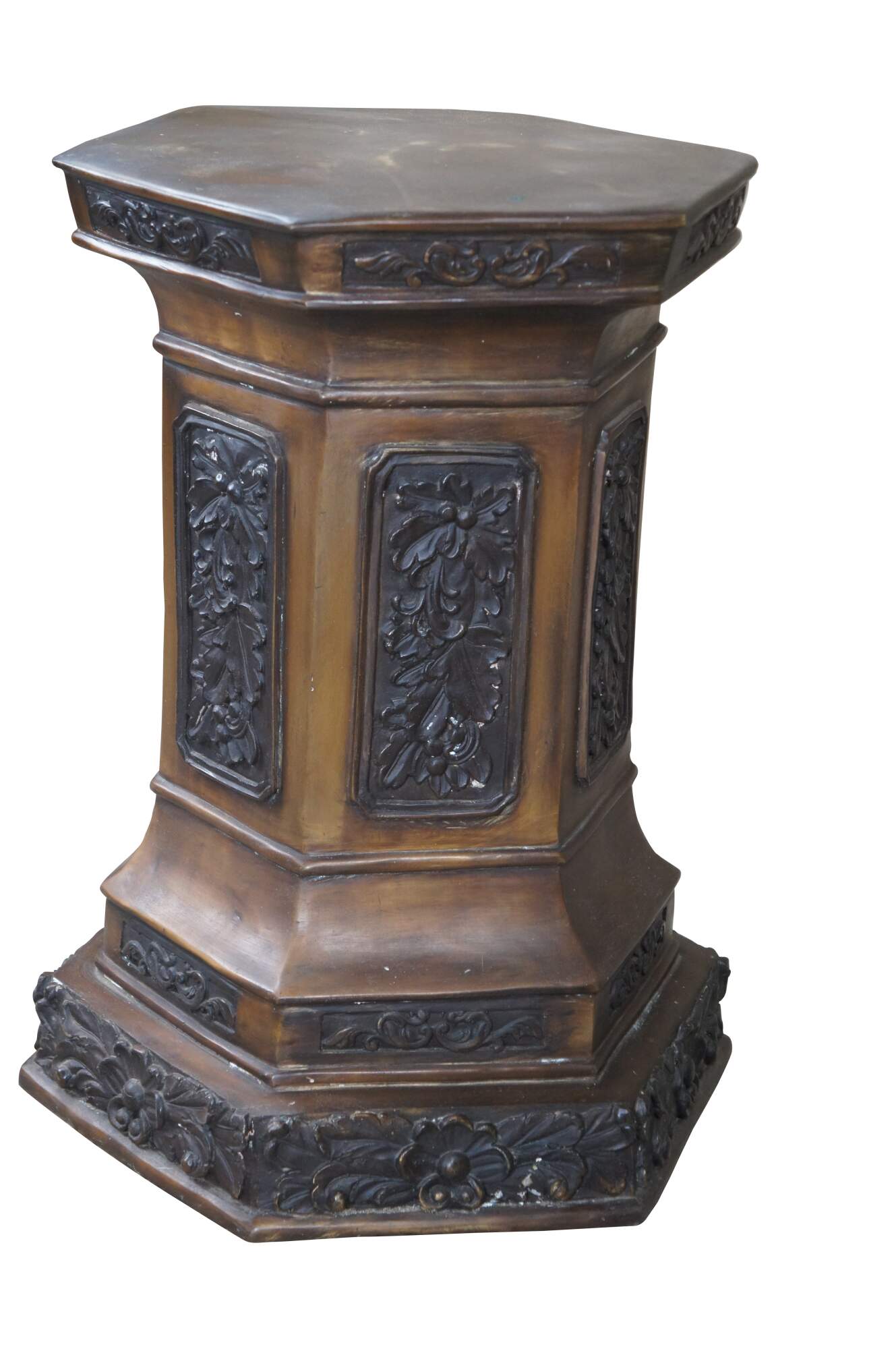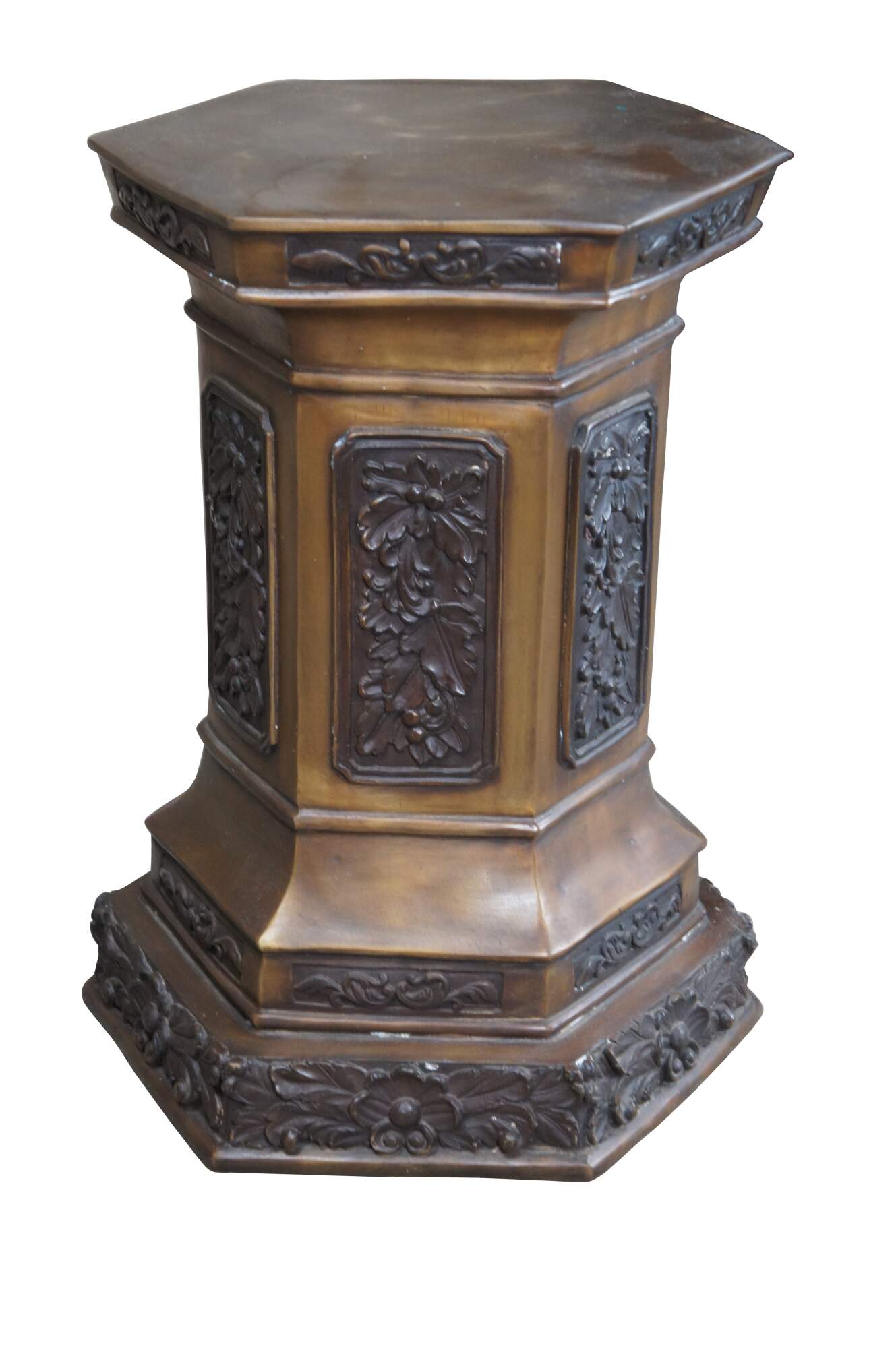 Late 20th Century Renaissance Revival pedestal, sculpture or plant stand. Features a hexagon form made from bronze with low relief foliate panels.