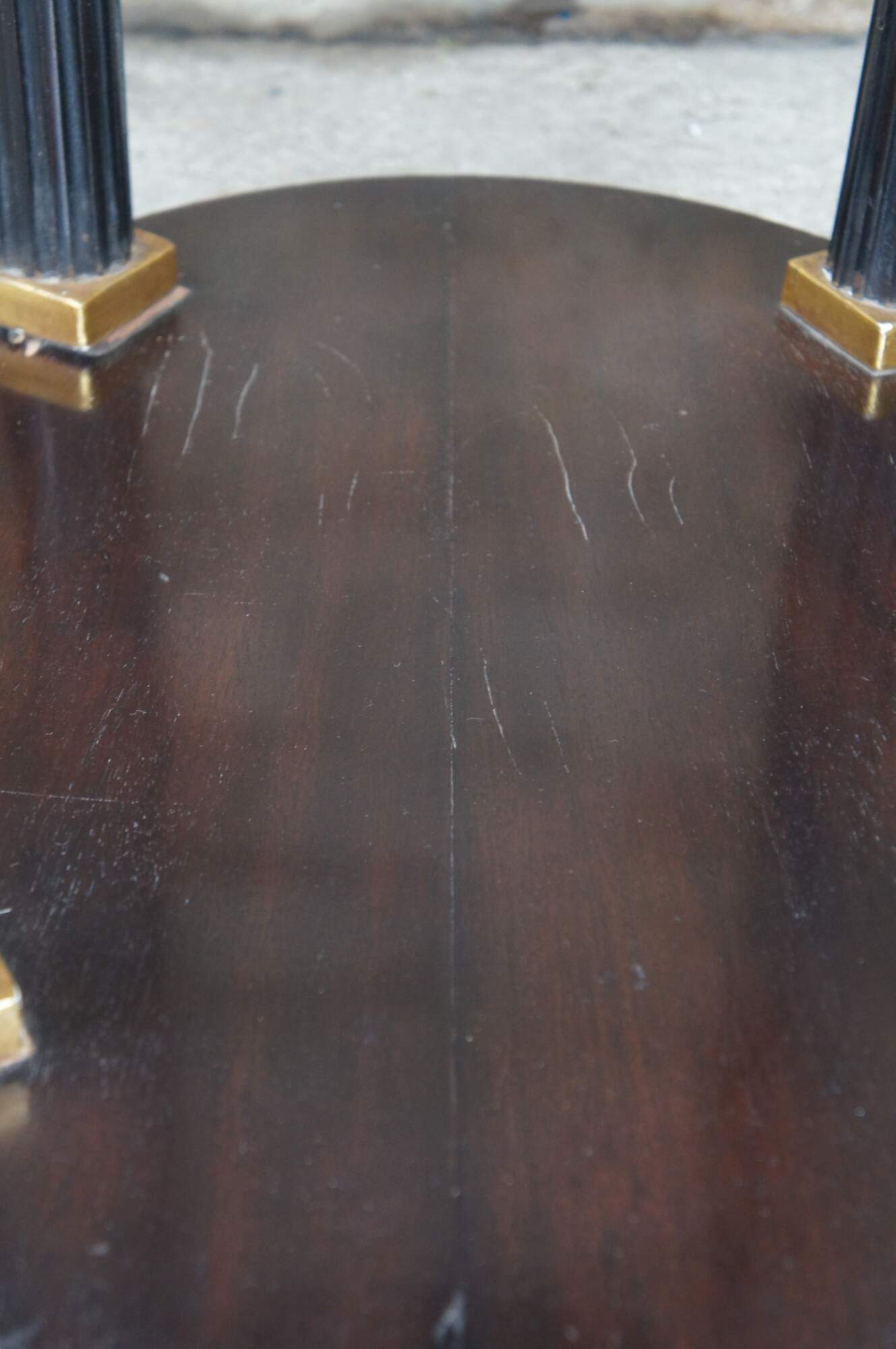 Dessin Fournir Romney Side Table, circa late 20th Century. Drawing inspiration from Louis XVI, Neoclassicism and Empire styling. Features an oval top made from mahogany with 22k gold leaf giltwood-trimmed tray edge over fluted ebonized columns and an oval base.
