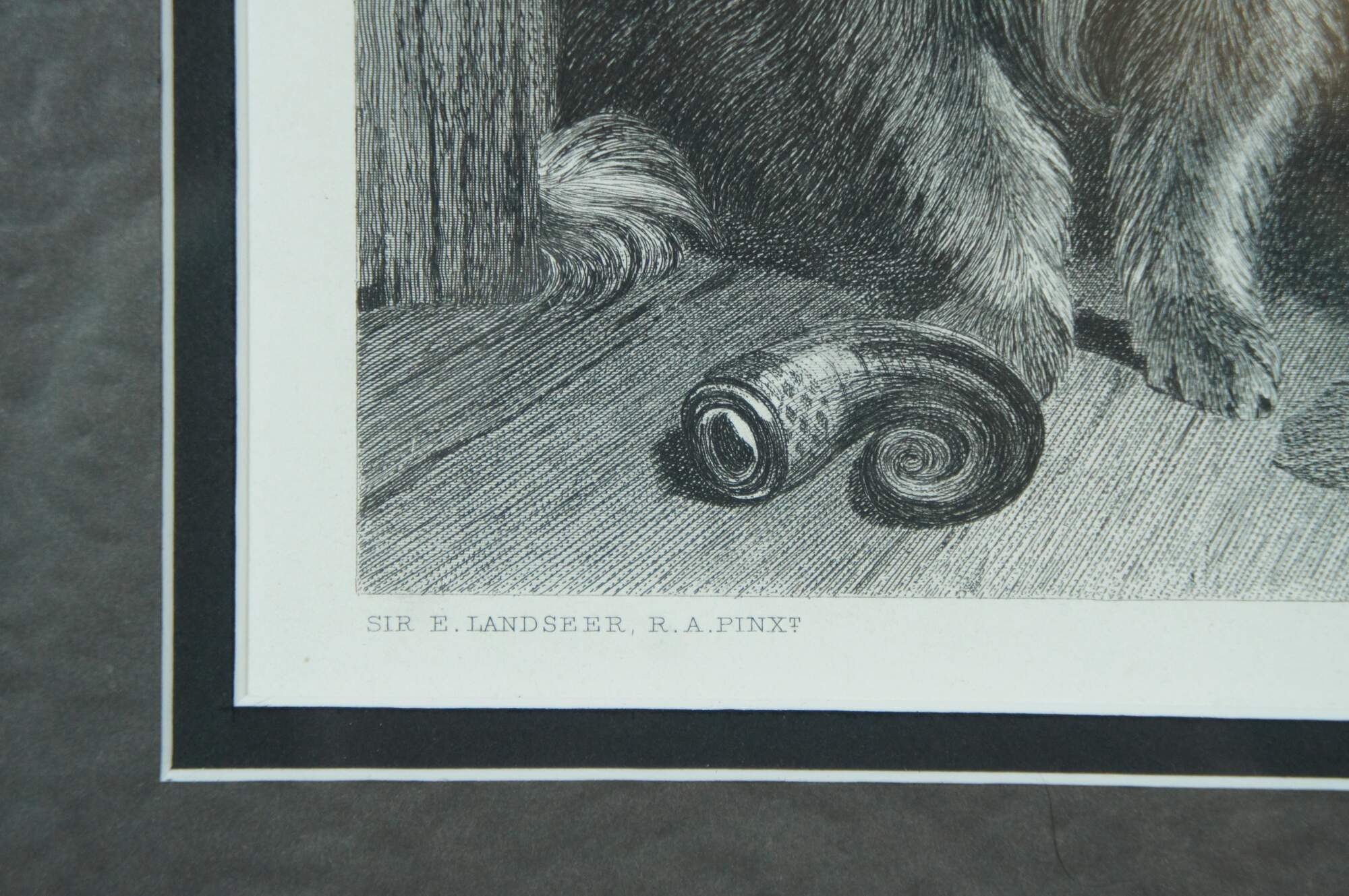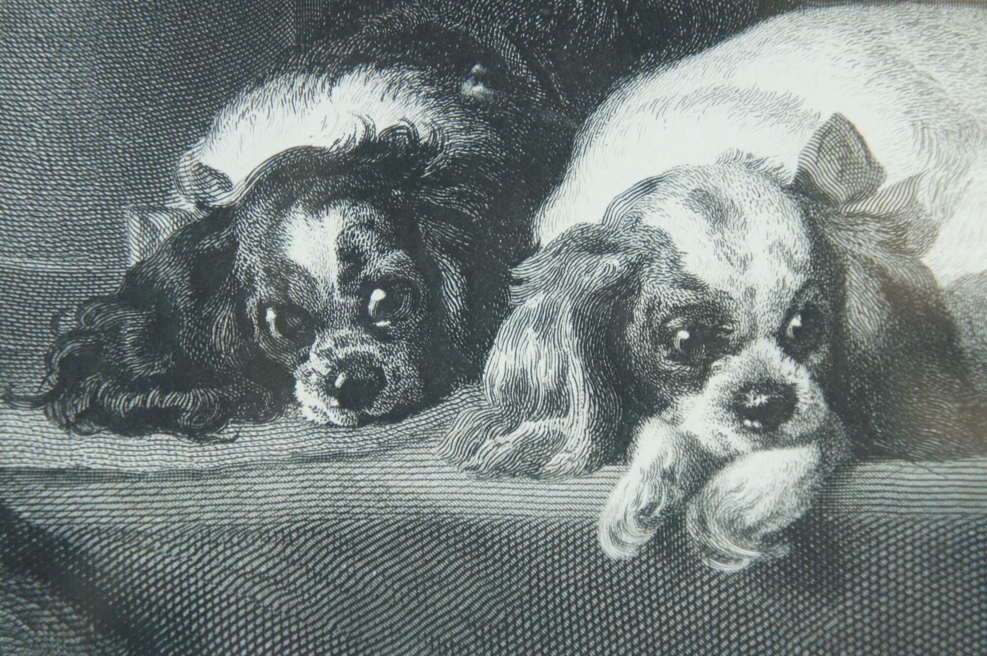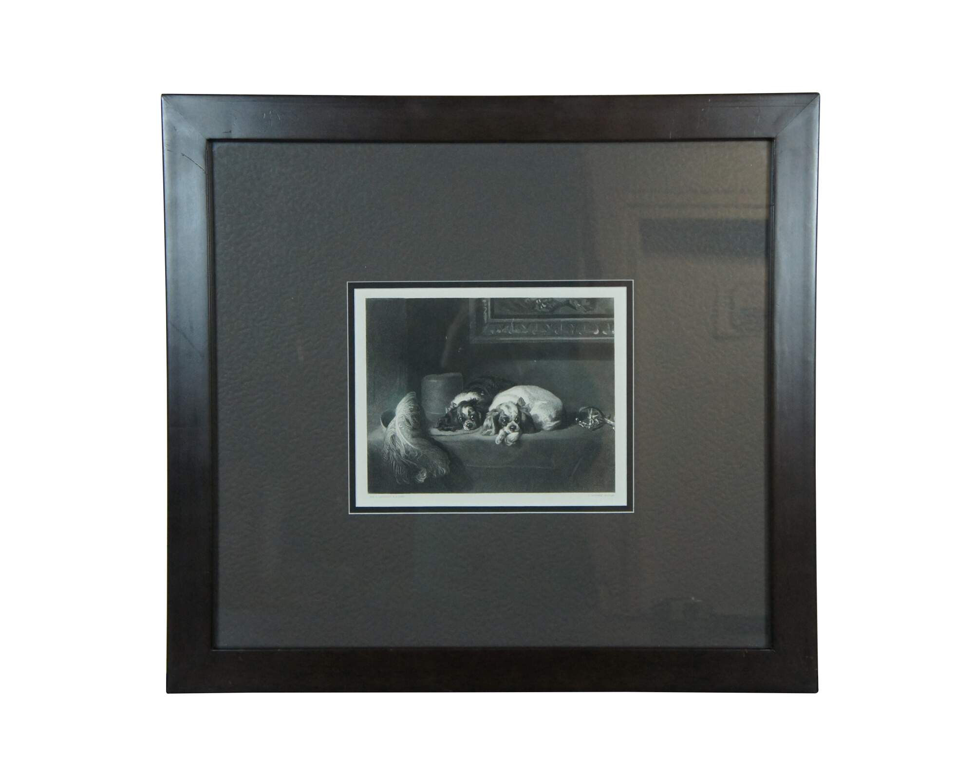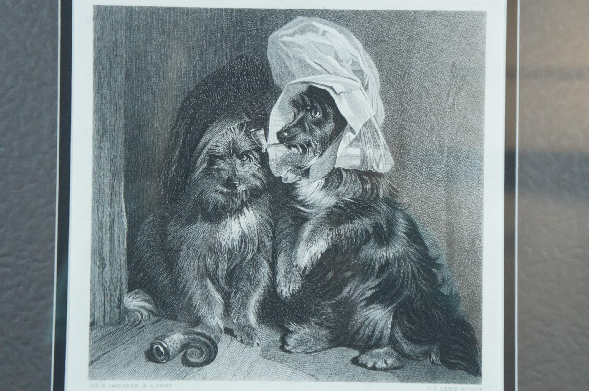 Pair of late 19th century engravings from works by Sir Edwin Landseer - "Comical Dogs," showing a pair of Scottish terriers dresssed in their owners hats, engraved by Charles George Lewis, and "The Cavalier's Pets," showing a pair of King Charles spaniels laying on a bench or table with their master's hat and spurs, engraved by J. Outrim. Dark painted wood frame; textured gray and black layered mat.