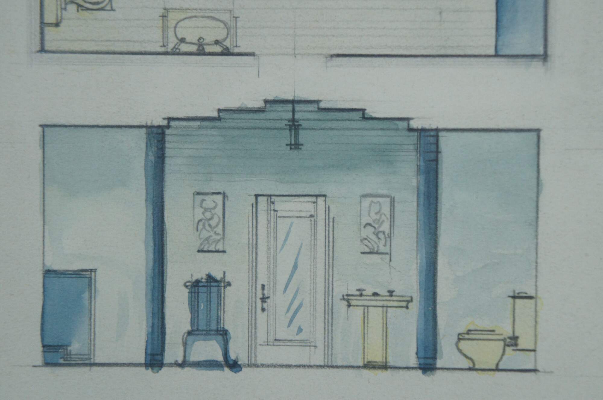 Antique folk art architectural / interior design pencil and watercolor on paper sketch for "A Bath Dressing Room" by Russell Durkle, Sketch Problem #7, April 27, 1934. Features overhead view and four interior views of a design for a full bathroom with space to accomodate a dressing area and vanity table. Teal green painted wood frame; light teal mat.