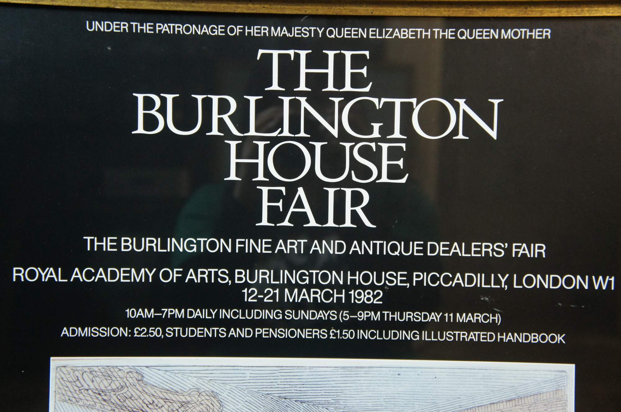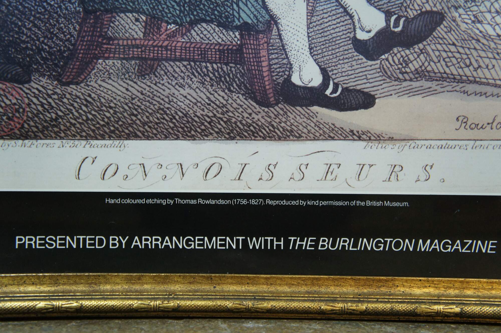 Vintage poster for The Burlington House Fine Art and Antique Dealers' Fair at the Royal Academy of Arts, London. Poster showcases a 1799 colored etching by Thomas Rowlandson titled "Connoisseurs." Giltwood frame carved with a border of bundles of plumes.