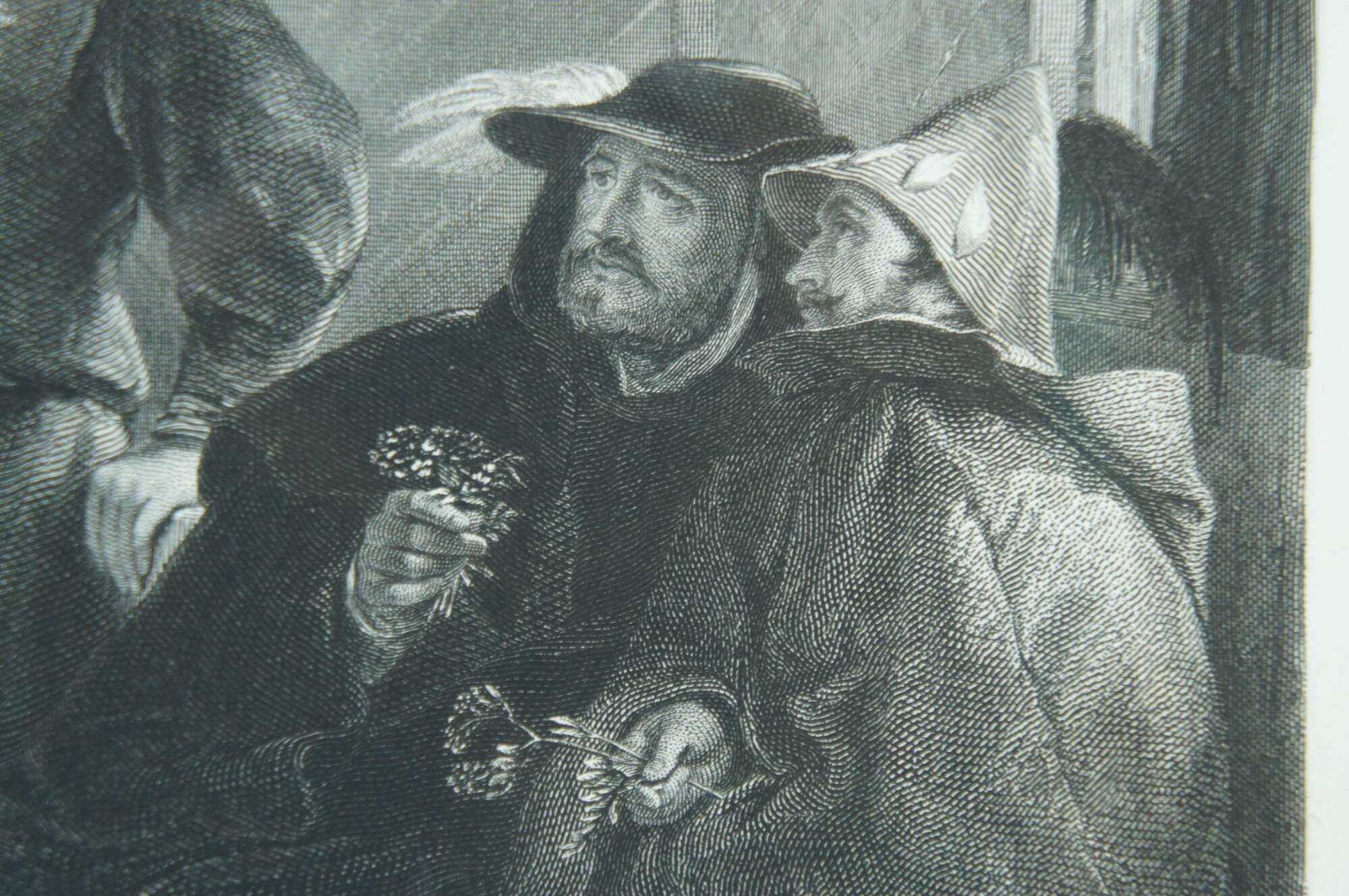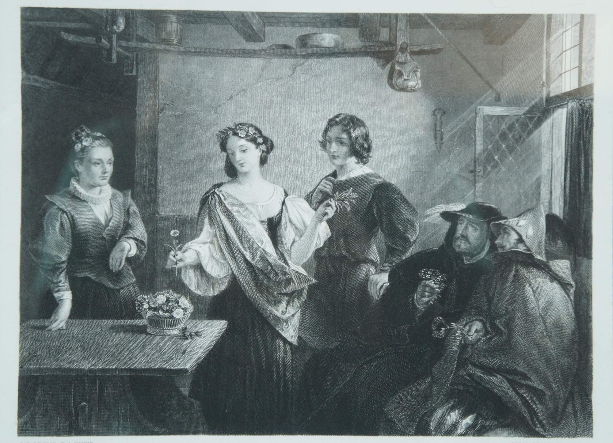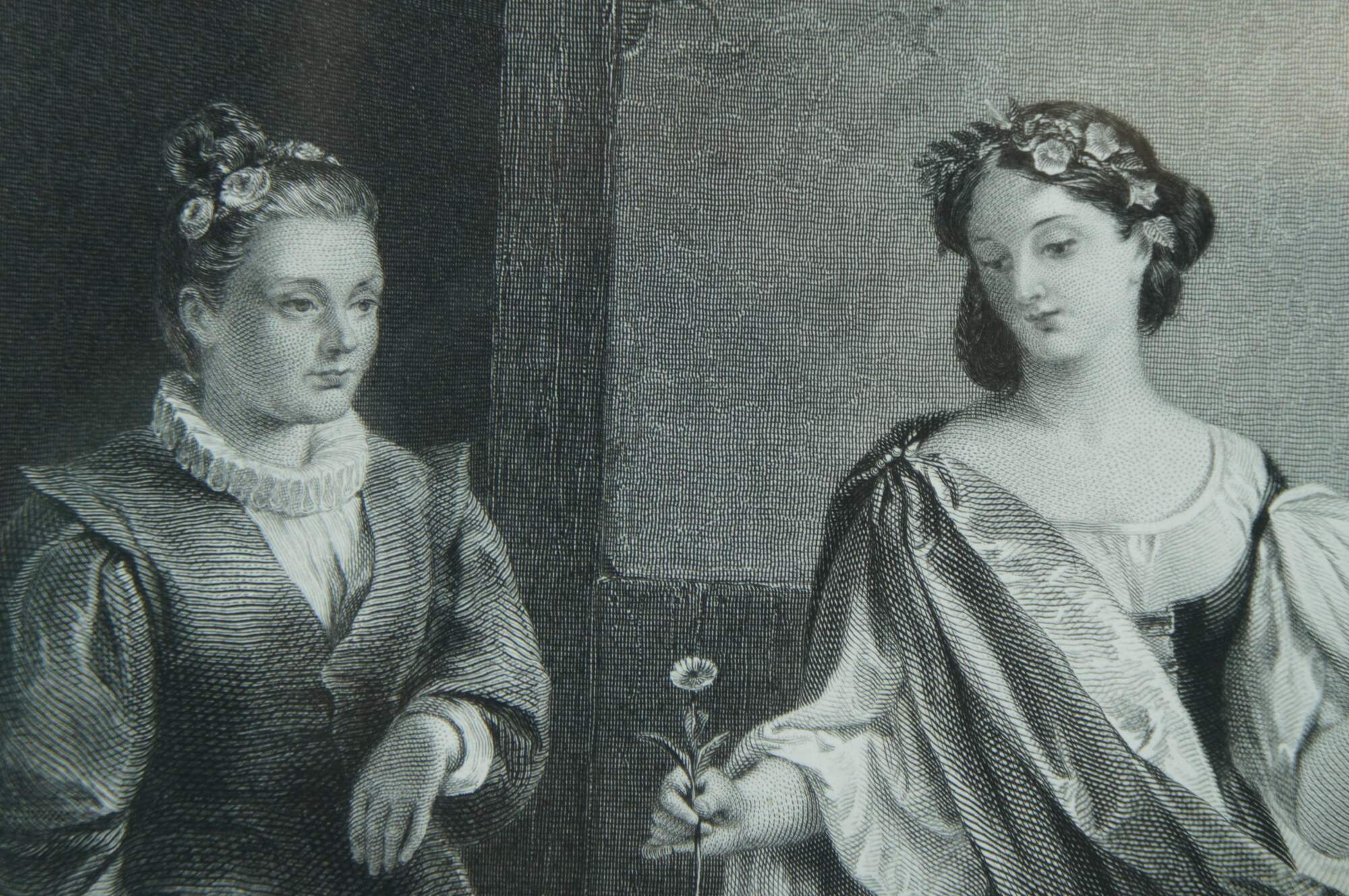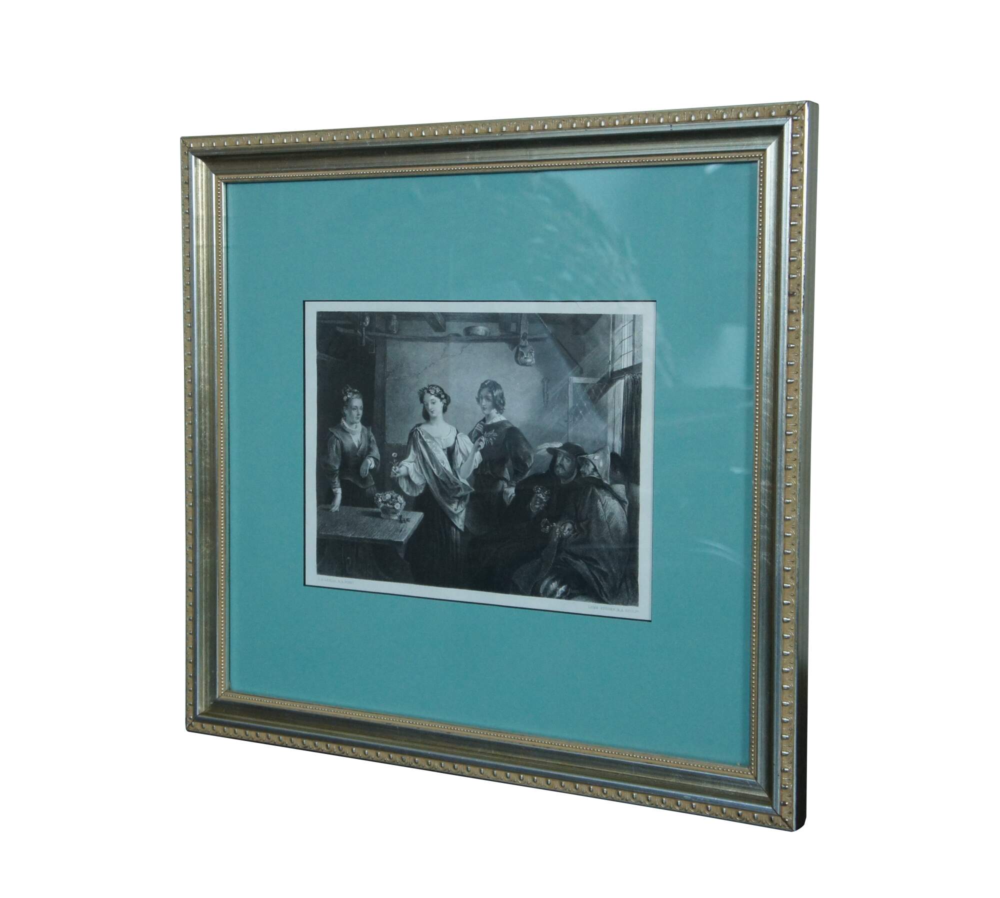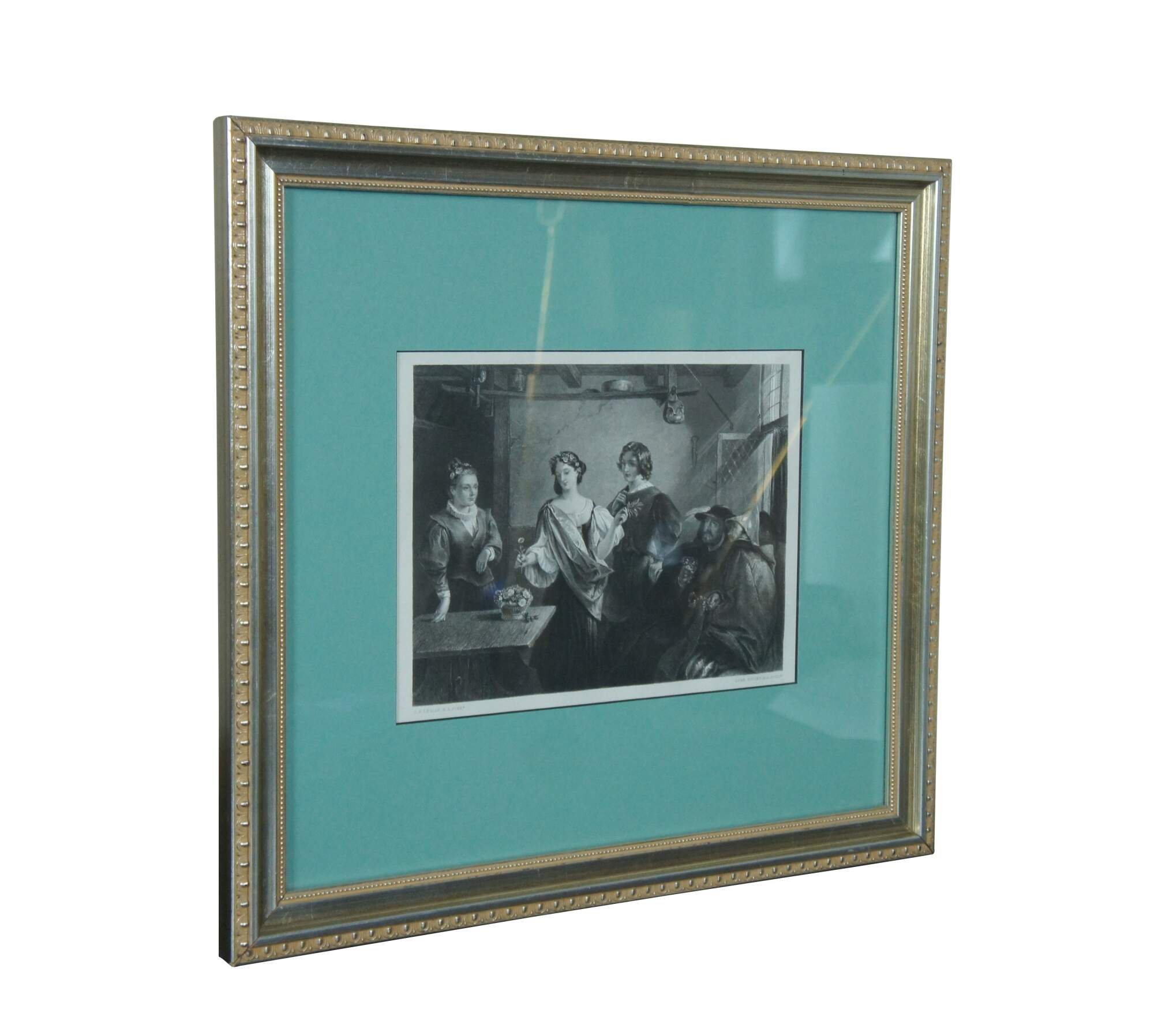 19th century (1867) engraving of "Florizel and Perdita" by C.R. Leslie, engraved by Lumb Stocks. "Illustrating act 4, scene 4 of Shakespeare's play (The Winter's Tale), this image shows Perdita, a shepherd's adopted daughter, welcoming two strangers with flowers–seated at right, they are Polixenes and Camillo, the king of Bohemia and a courtier, who have arrived disguised to stop the prince from marrying a shepherd girl (unknown to all, Perdita is, in fact, also of noble birth). Standing next to Perdita, Florizel gazes at his beloved, not yet aware of his father's presence." Two tone champagne giltwood frame with beaded and scallop carved edges; robin's egg blue mat. London Virtue & Co.
