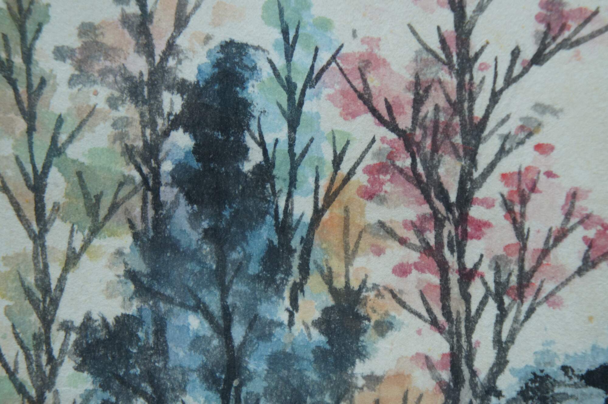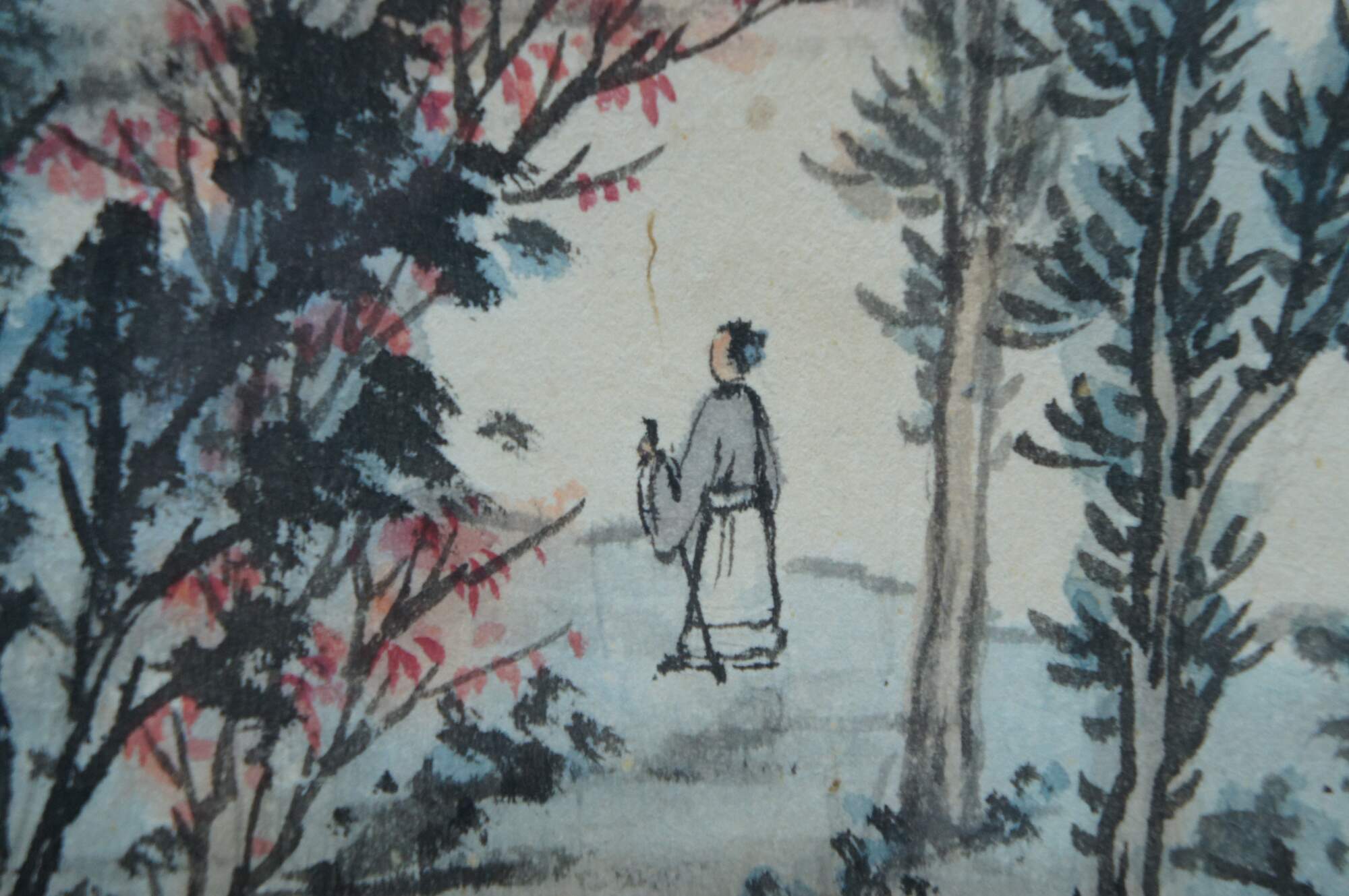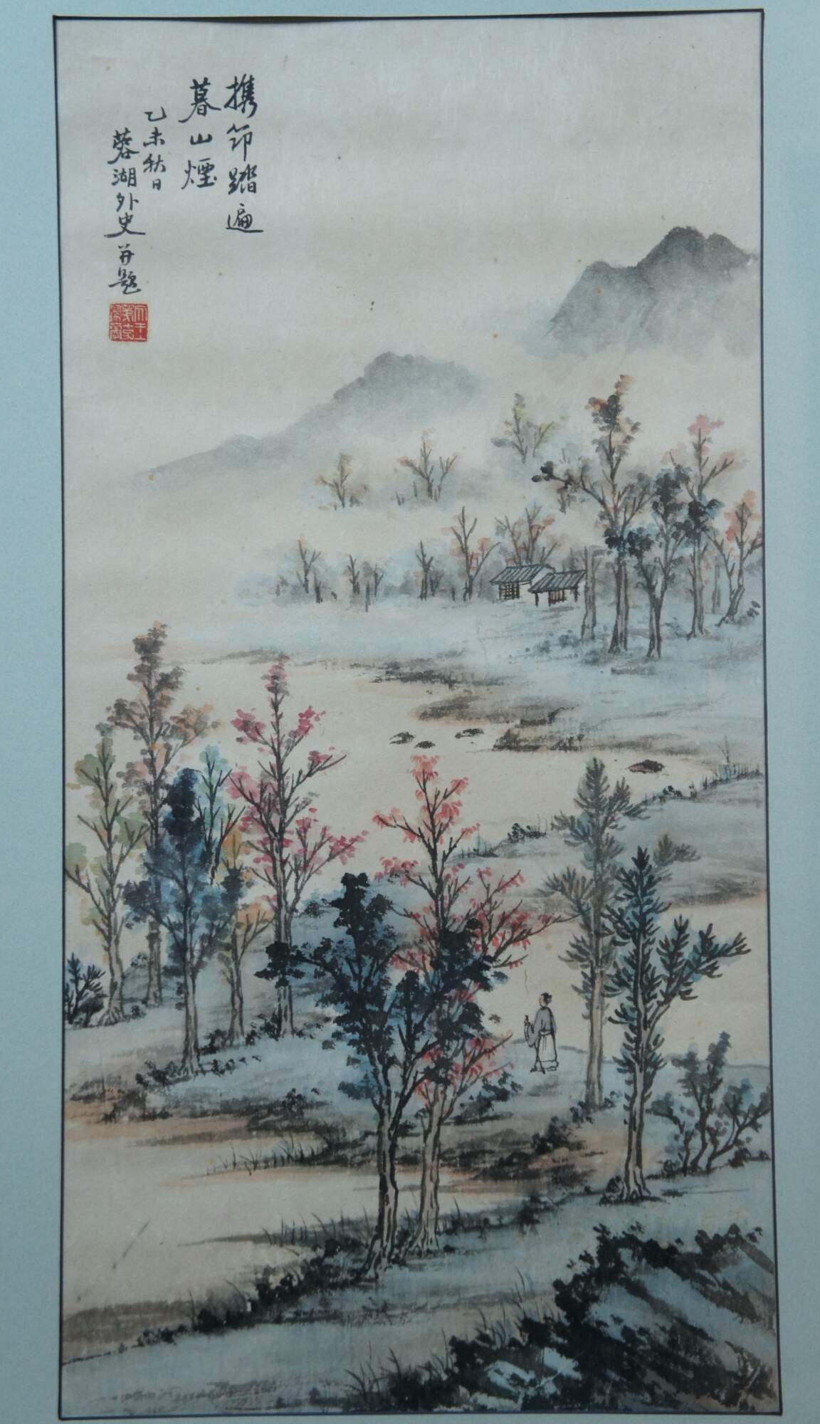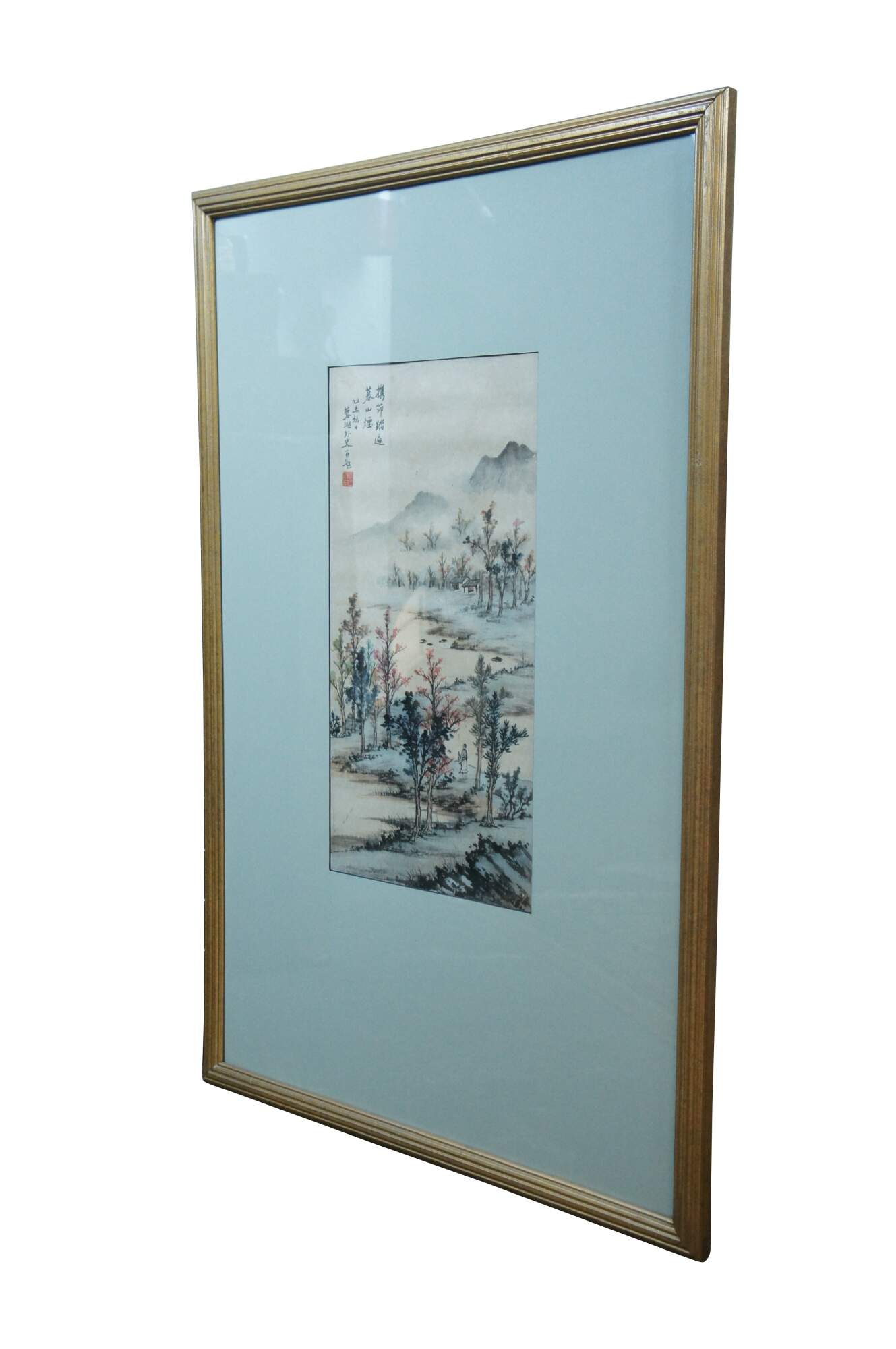 Antique Chinese landscape watercolor painting on paper showing a lone figure walkng among the trees towards a small cottage on the misty mountains at dusk. Beveled giltwood frame; light blue mat.