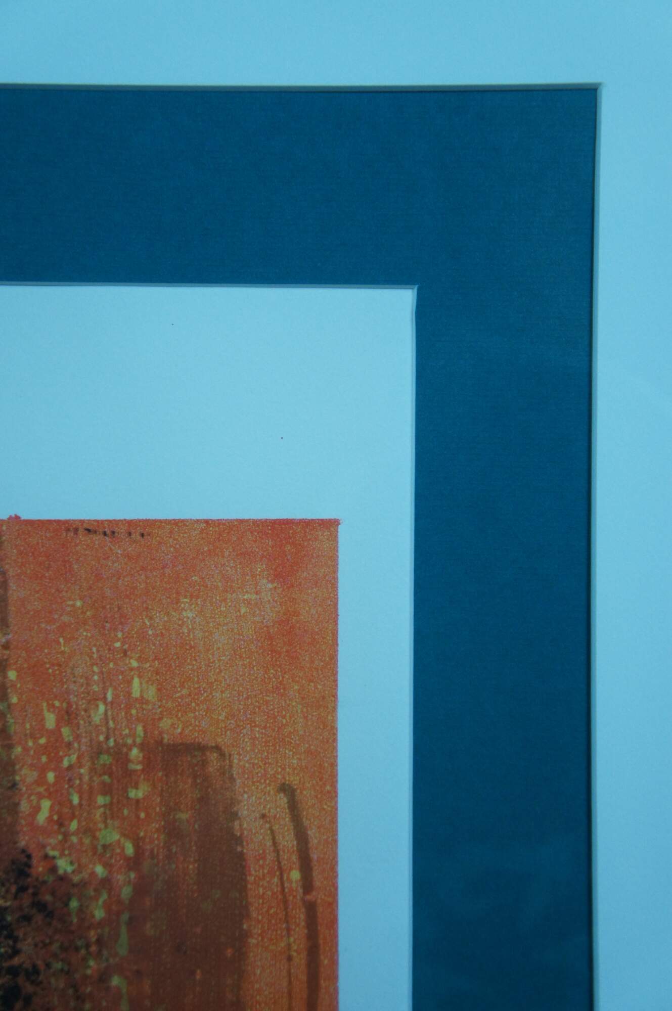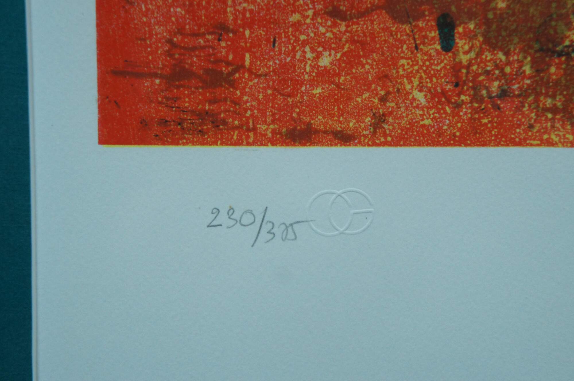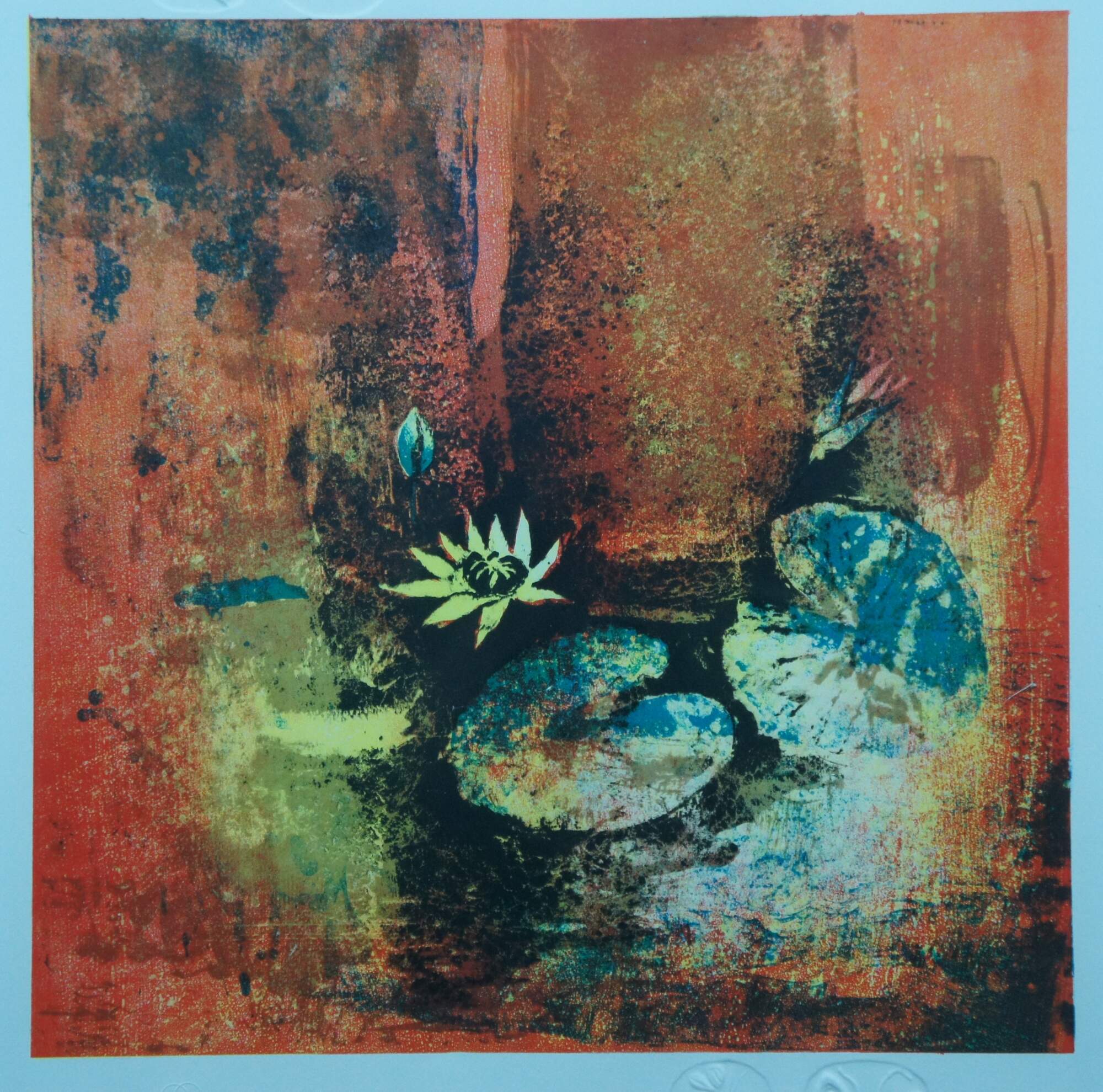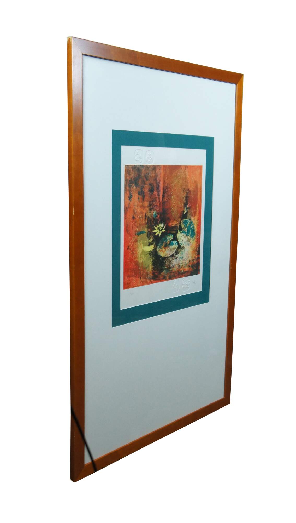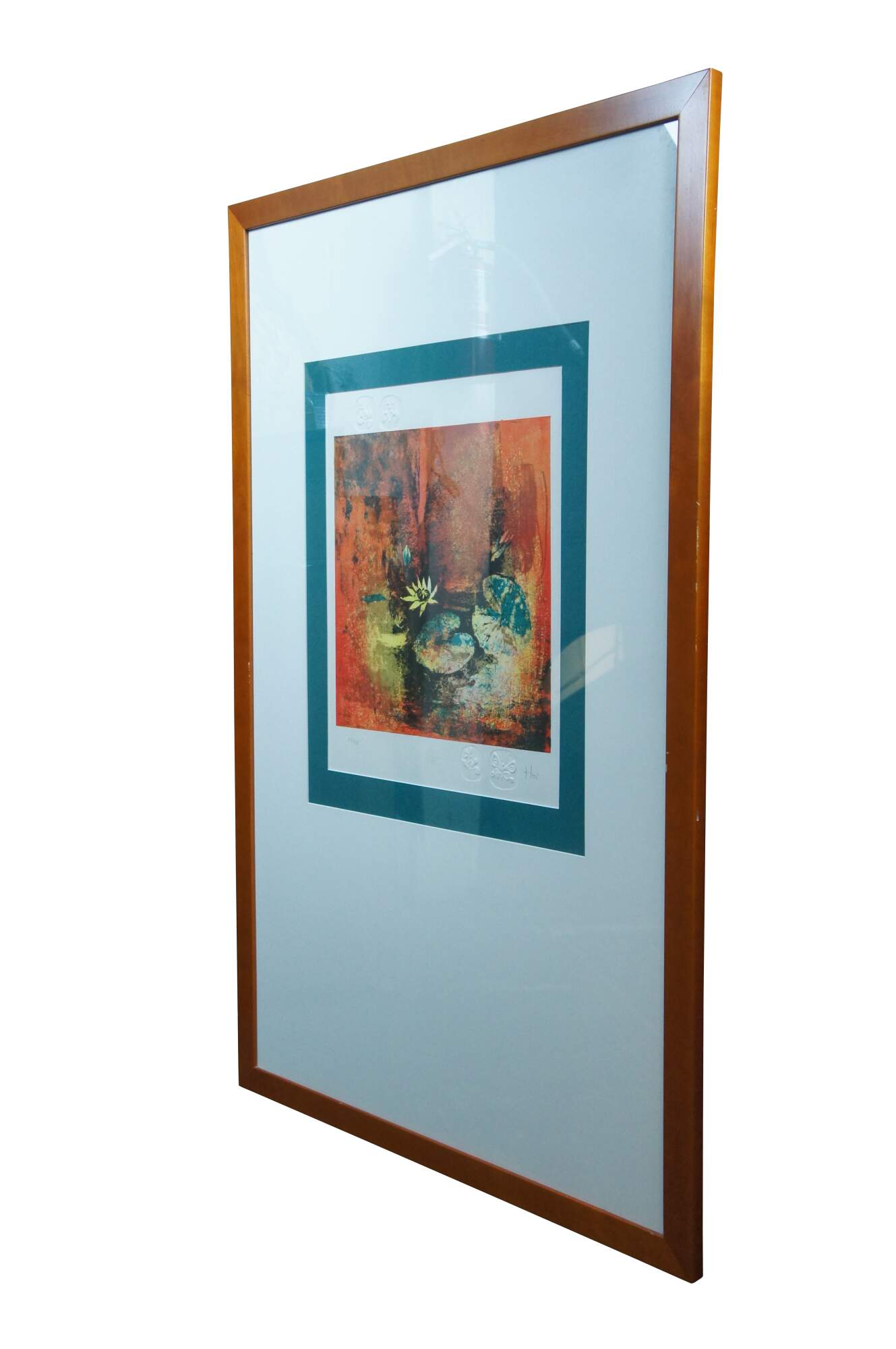 Mid century lithograph print by Hoi Ledabang. Shows a semi-abstract scene in red, yellow, and teal of water lilies and lily pads. Pencil signed Hoi (lower right) and numbered 230/325 (lower left). Embossed CG and with a flower and butterfly design along the lower edge. Plain wood frame; white and teal layered mat.