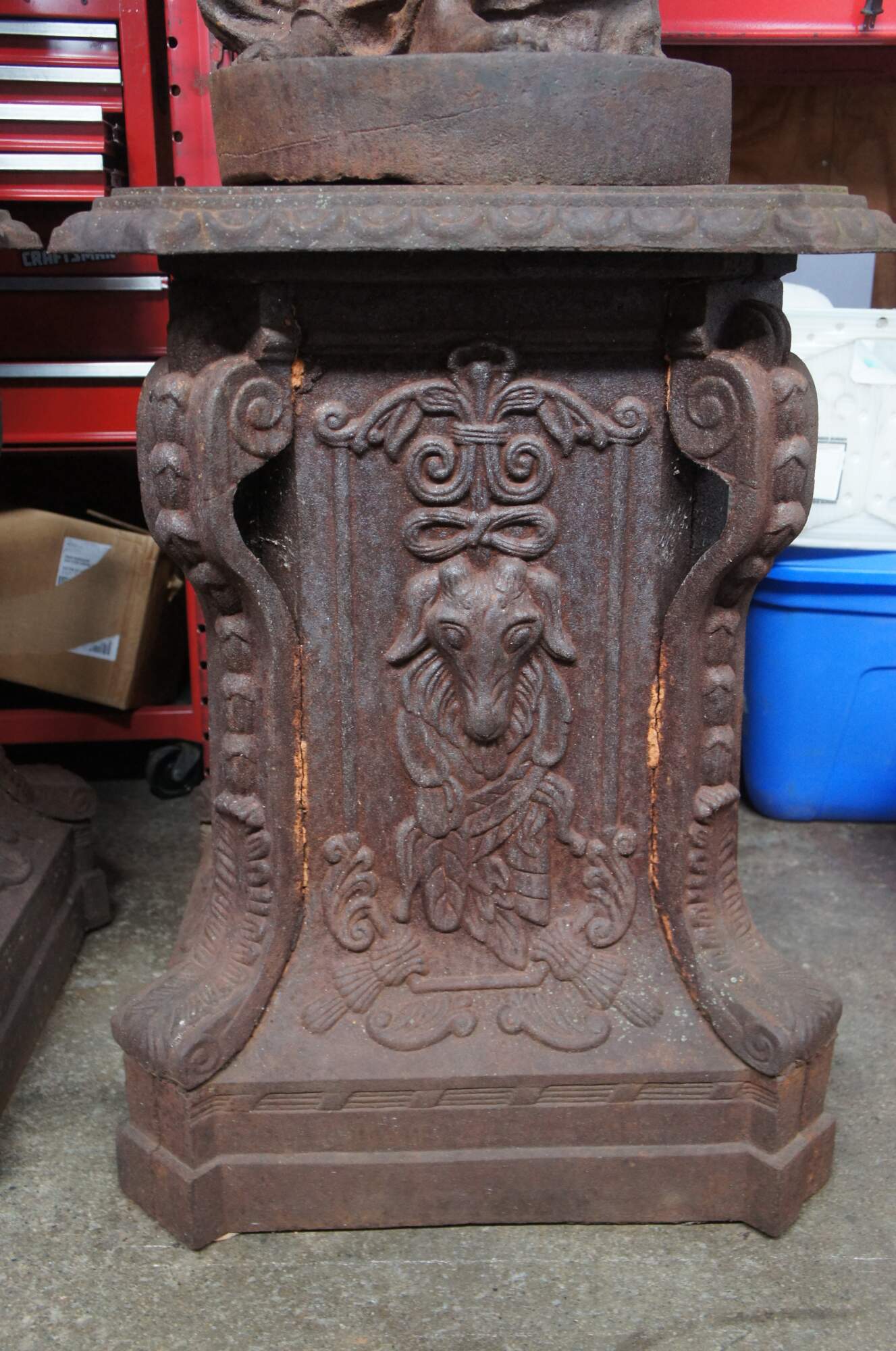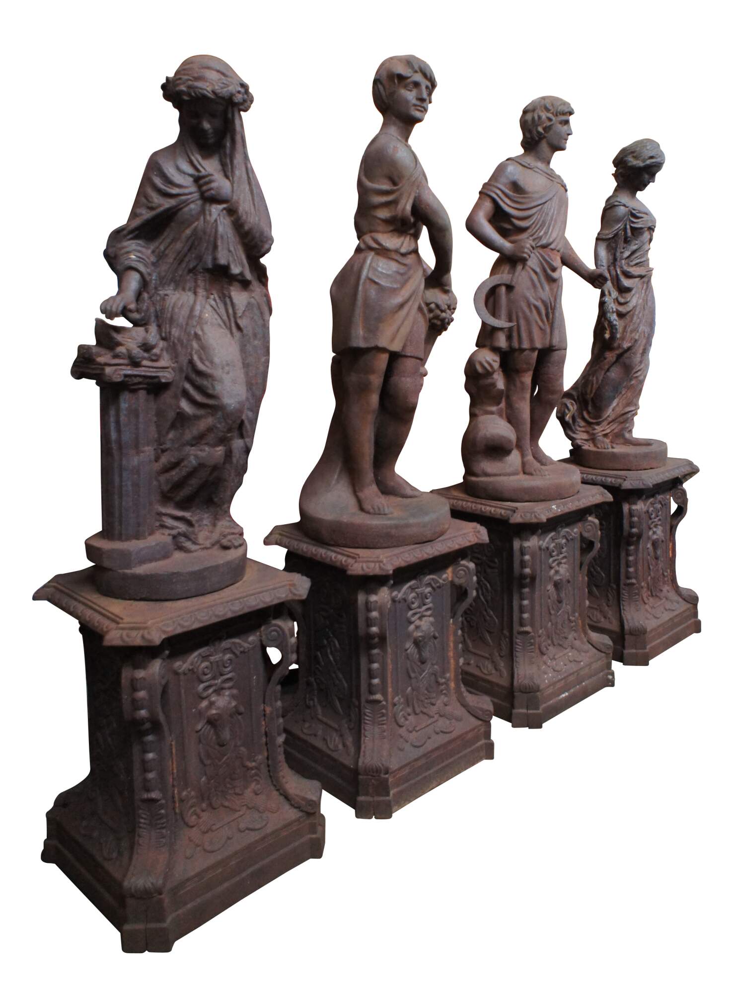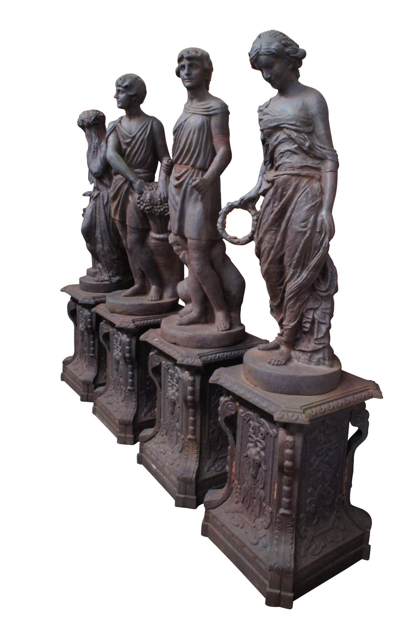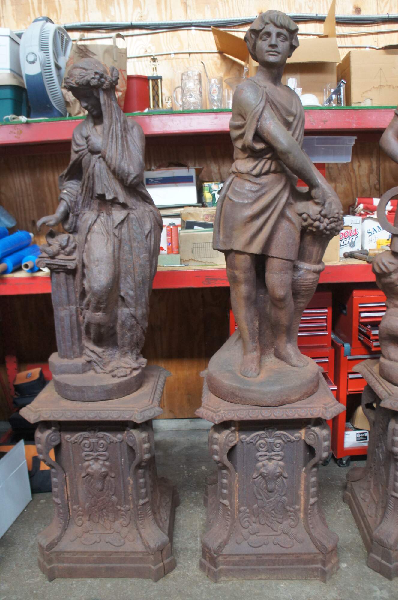 Monumental set of ''Four Seasons'' outdoor garden statues. Drawing inspiration from Victorian, Greek and Roman styling. Crafted with exceptional detail. Each figure is poised on a square pedestal with egg and dart molded edge over an ornate frame centered by deer head around foliate details.