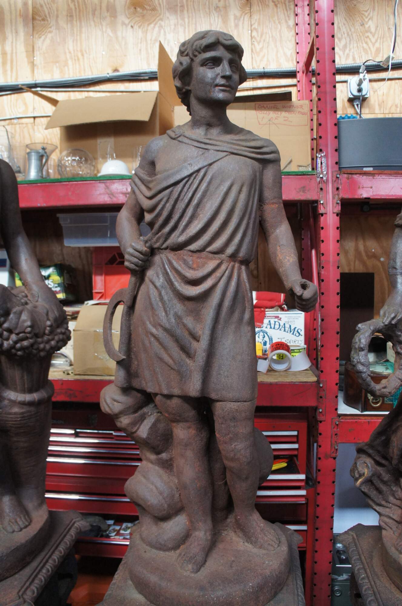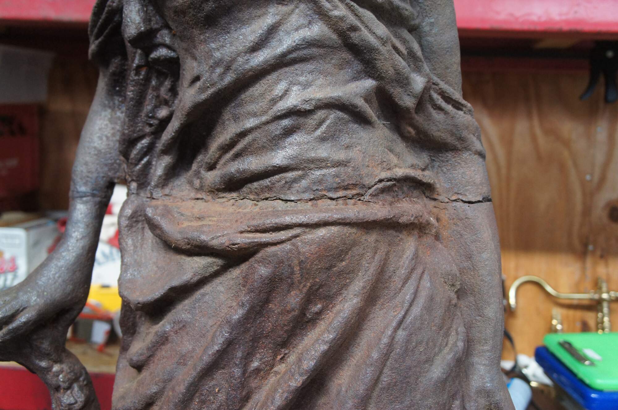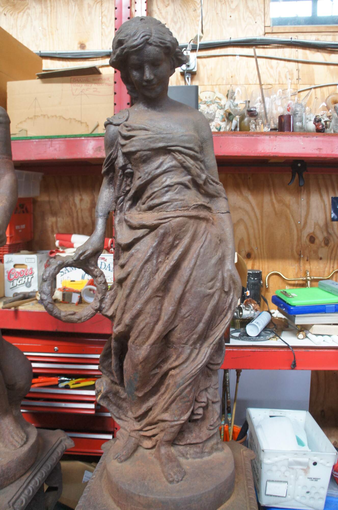Good Condition; patina from age and weathering. Goddess of Agriculture missing gardening Hoe, sculpture on the left has a seam at the waist.