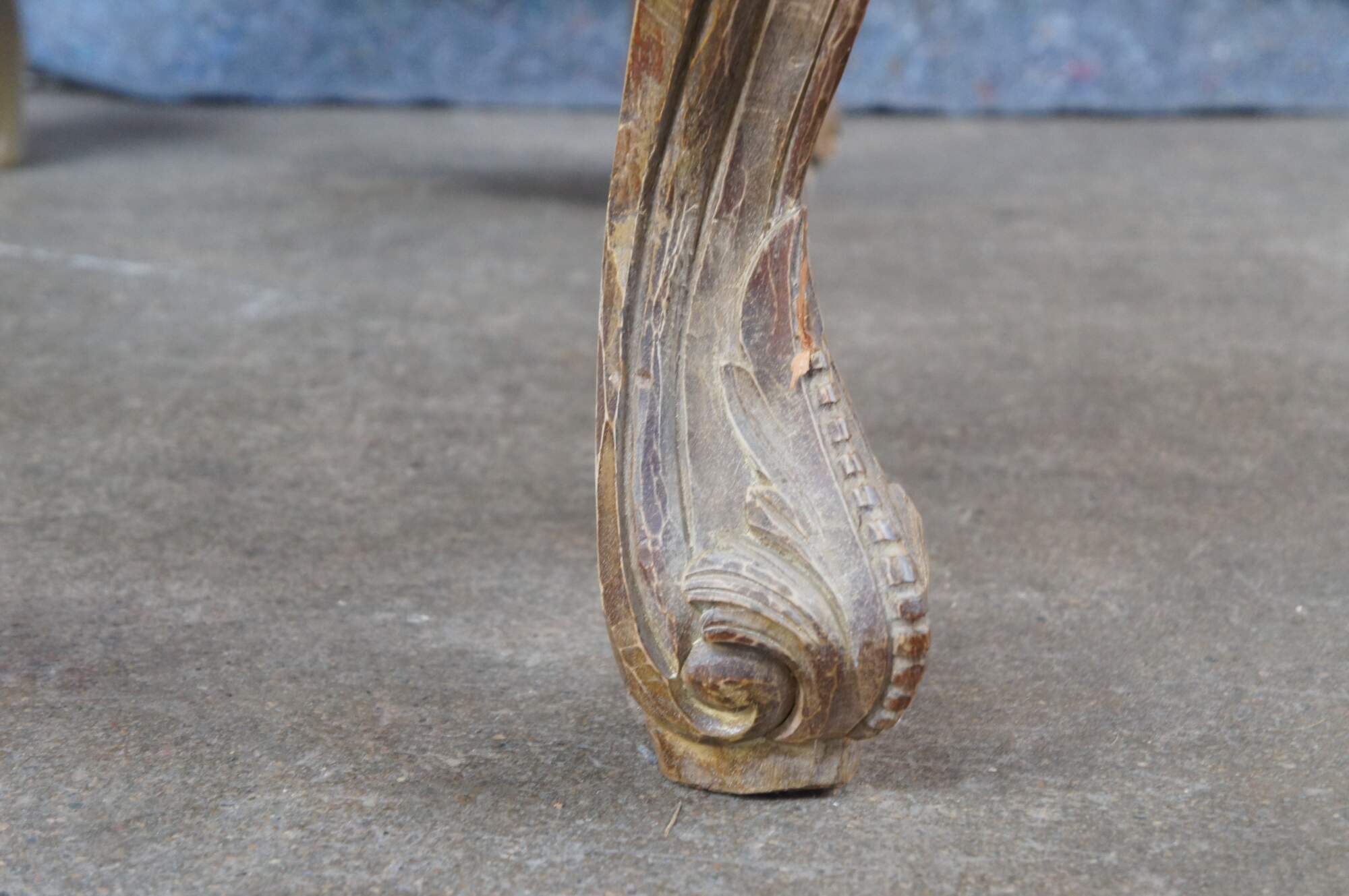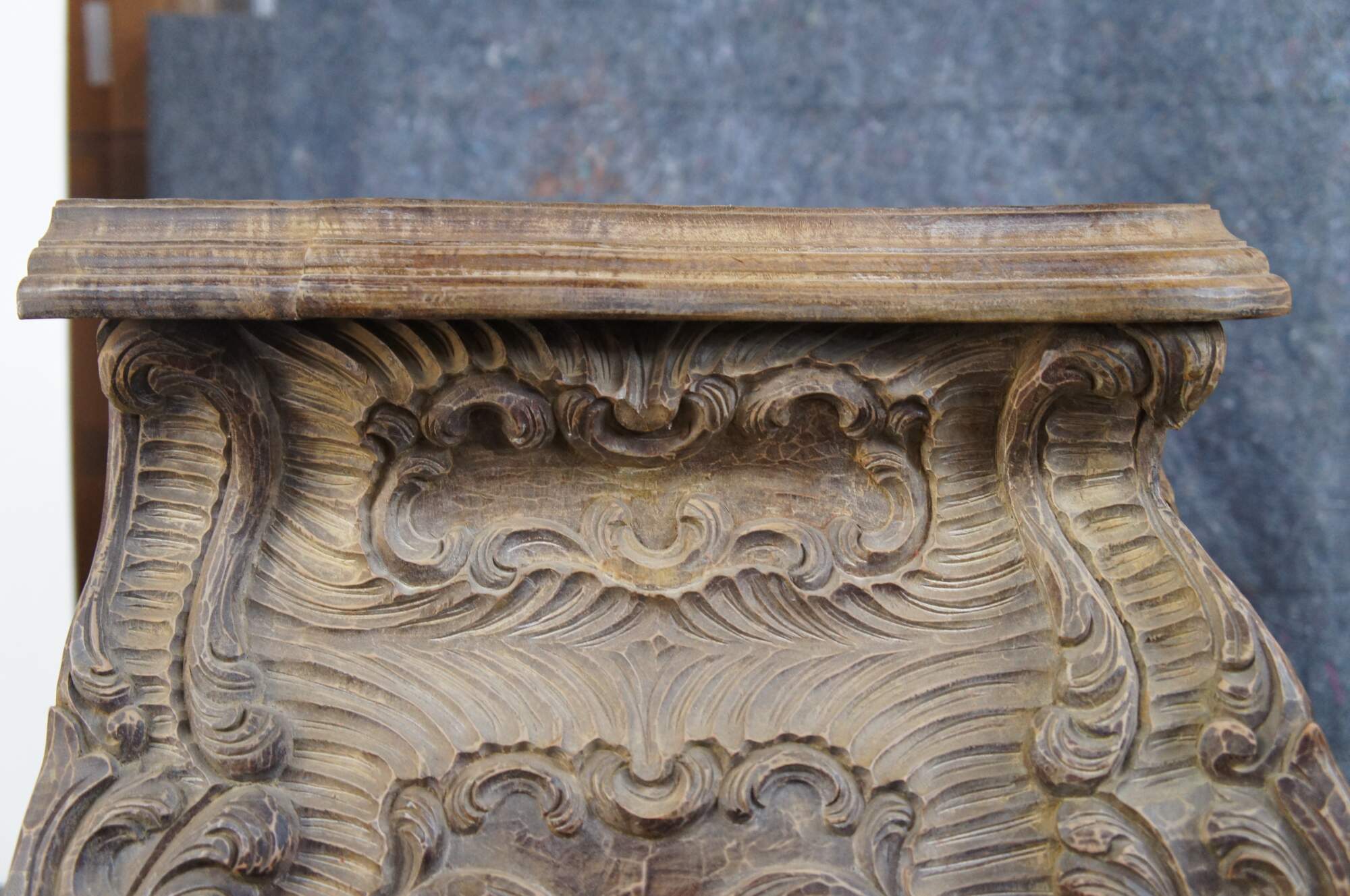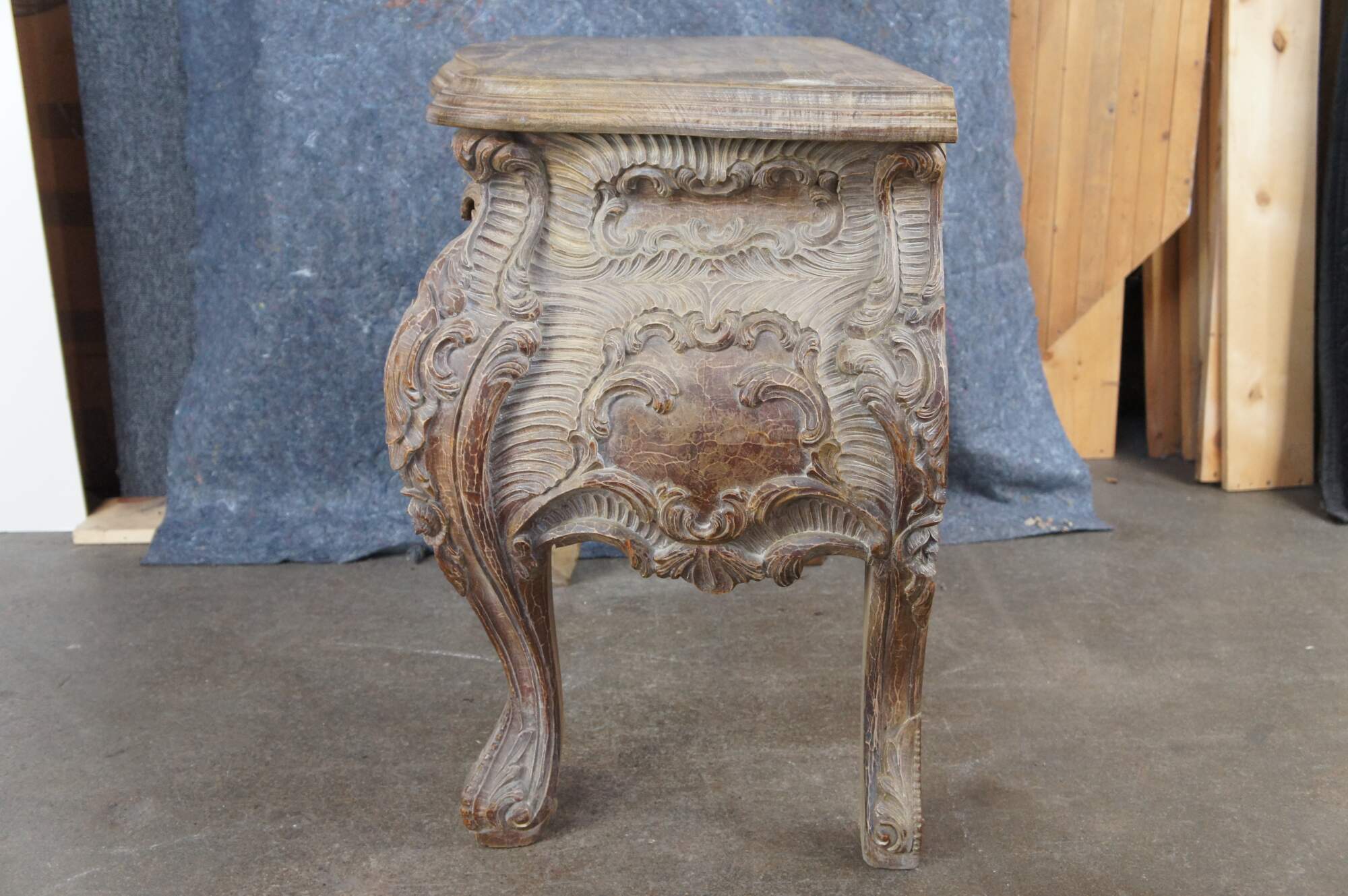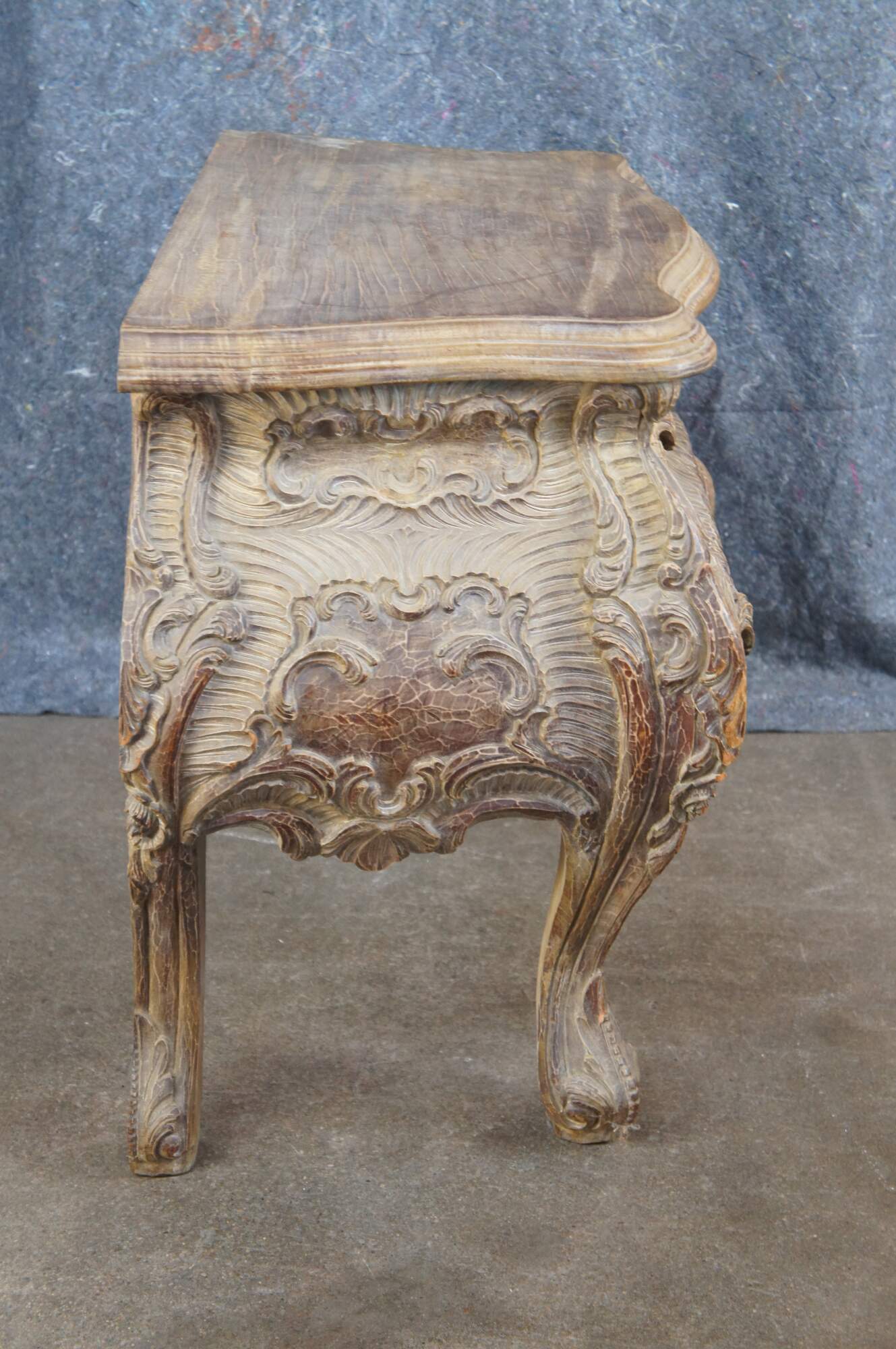 Baroque Revival carved wooden nightstand / commode. Features a serpentine frame with two drawers, heavily carved in baroque manner with cabriole legs. Great for use as a bedside table, Bombay / commode, nightstand, end or side table.