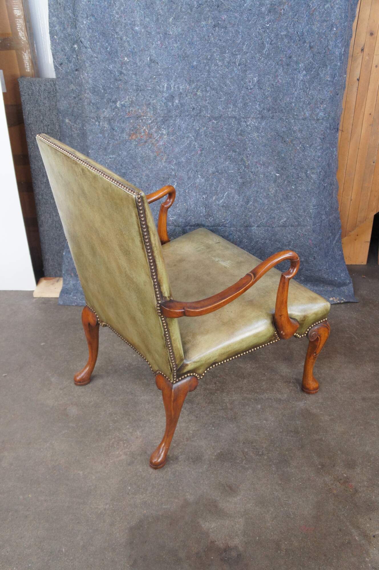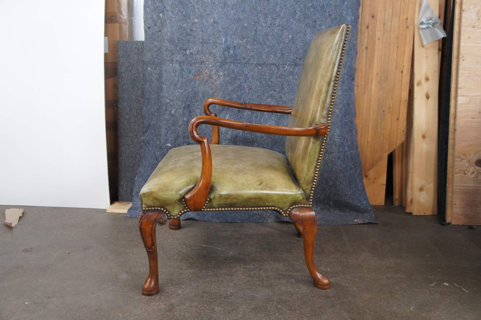 A stately Georgian style armchair by Arthur Brett, English Circa Late 20th Century. Features a mahogany frame with contoured gooseneck arms, a green leather upholstered seat with brass nailhead trim and cabriole legs, carved at the knee with pad feet. Perfect for use as a library reading chair, desk chair, or an occasional arm chair. #1919x, 139586
