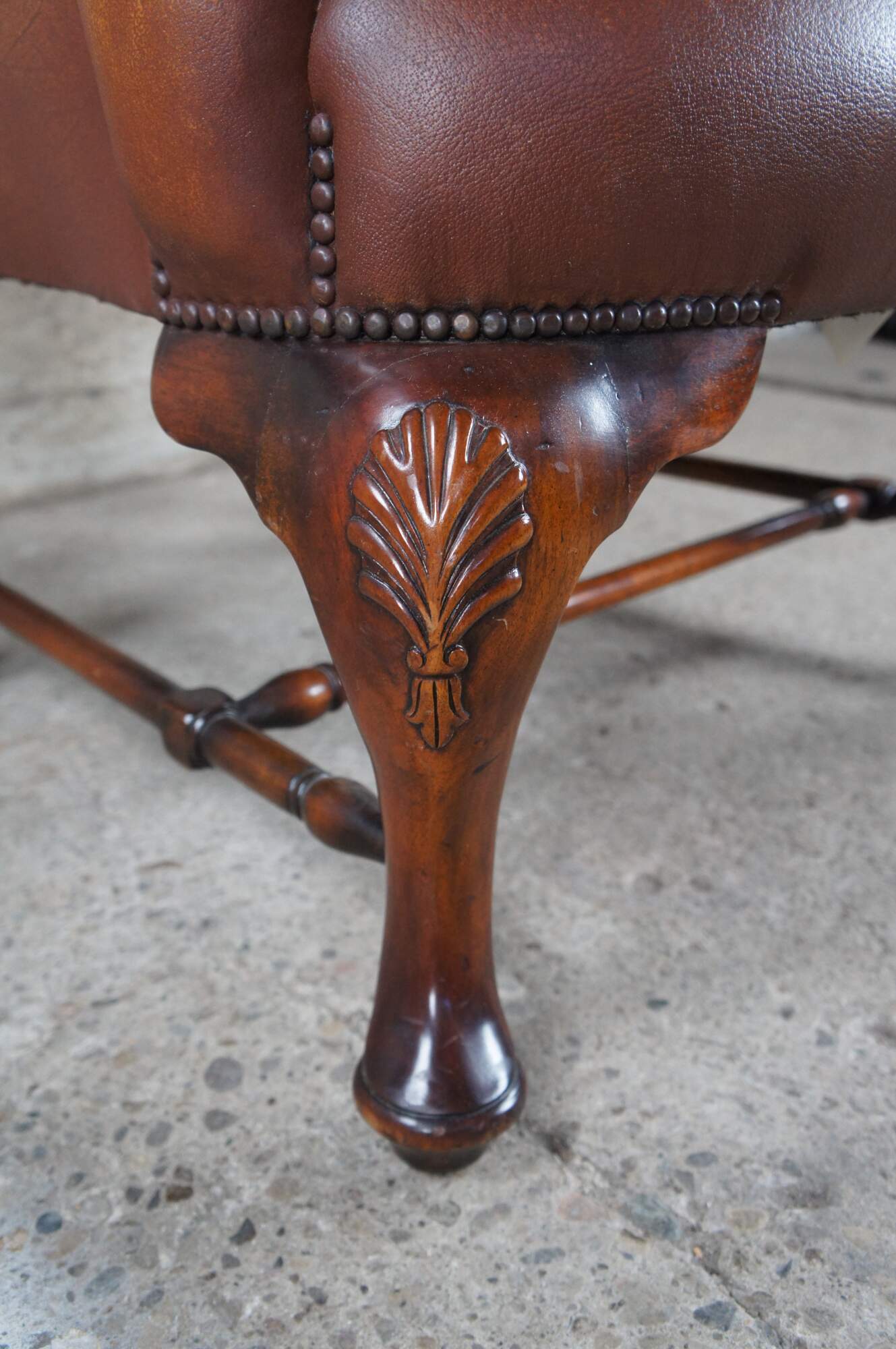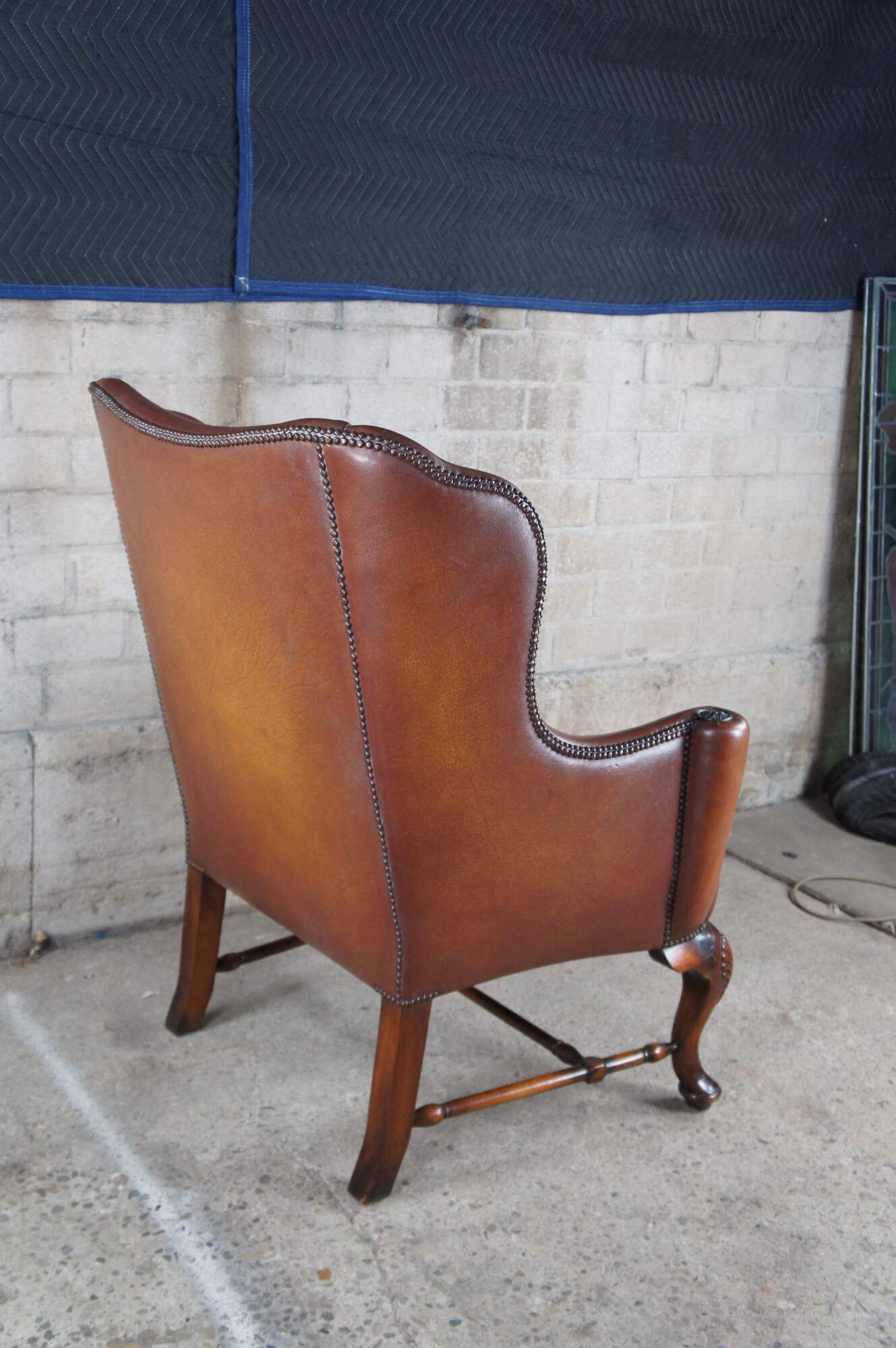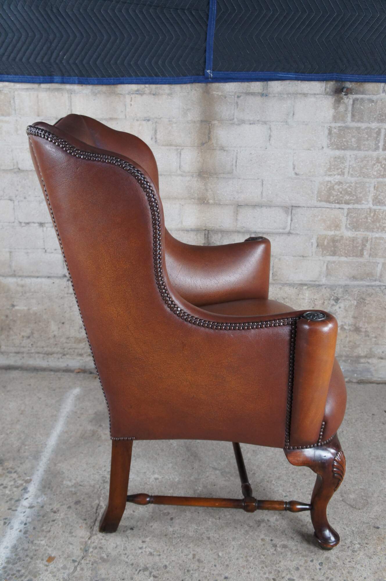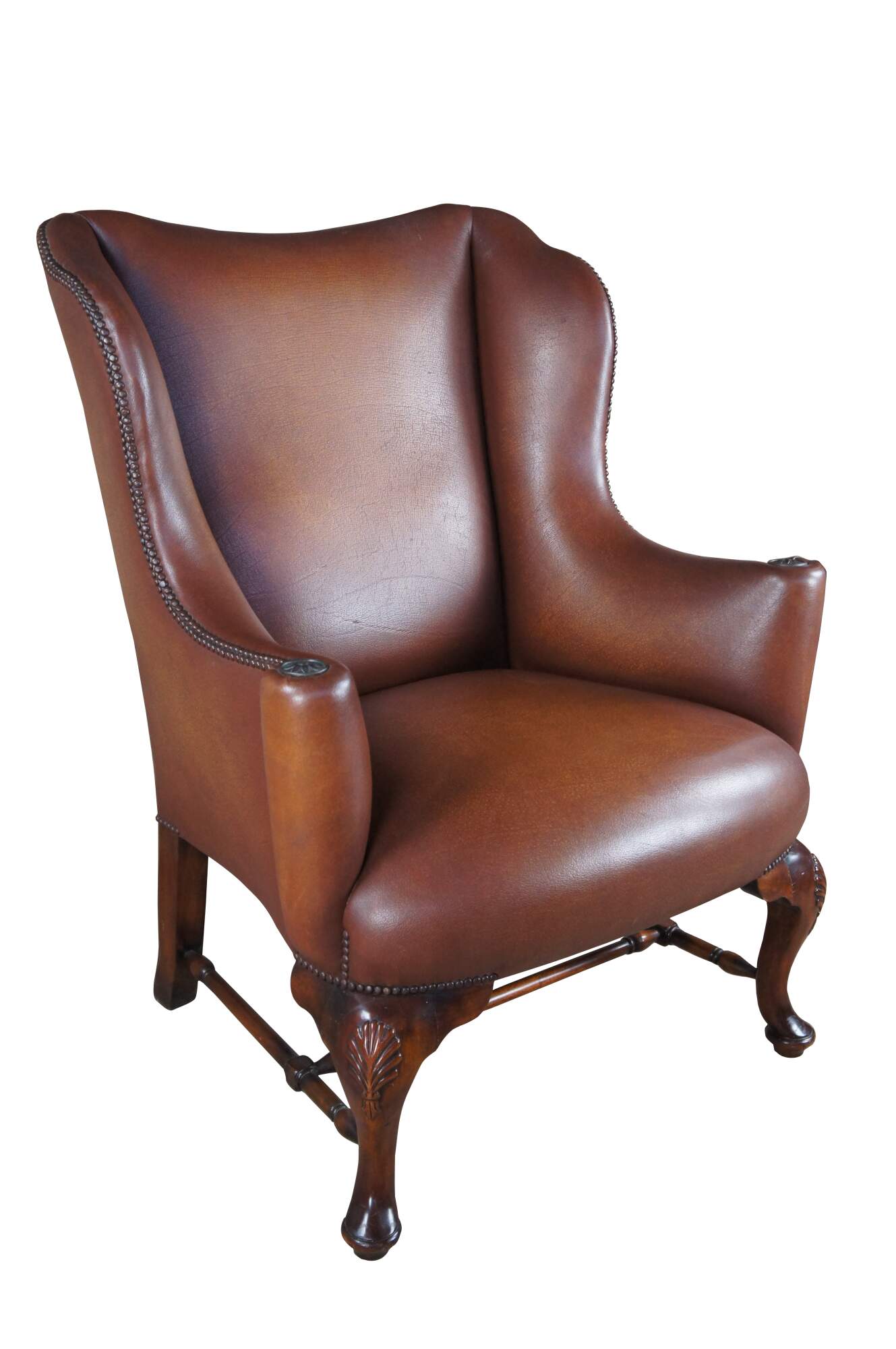 A Stately Georgian Style Wing Chair by Theodore Alexander, circa early 2000s. Features a mahogany frame with aged brown leather upholstery and brass nailhead trim. Arms are flared and scrolled with foliate medallions along the top. Front legs are cabriole form with scallop carved knees and pad feet. Front legs are connected to rear by spindle turned H stretcher. Seat Cushions are a blend of foam and Waterfowl / Down.
