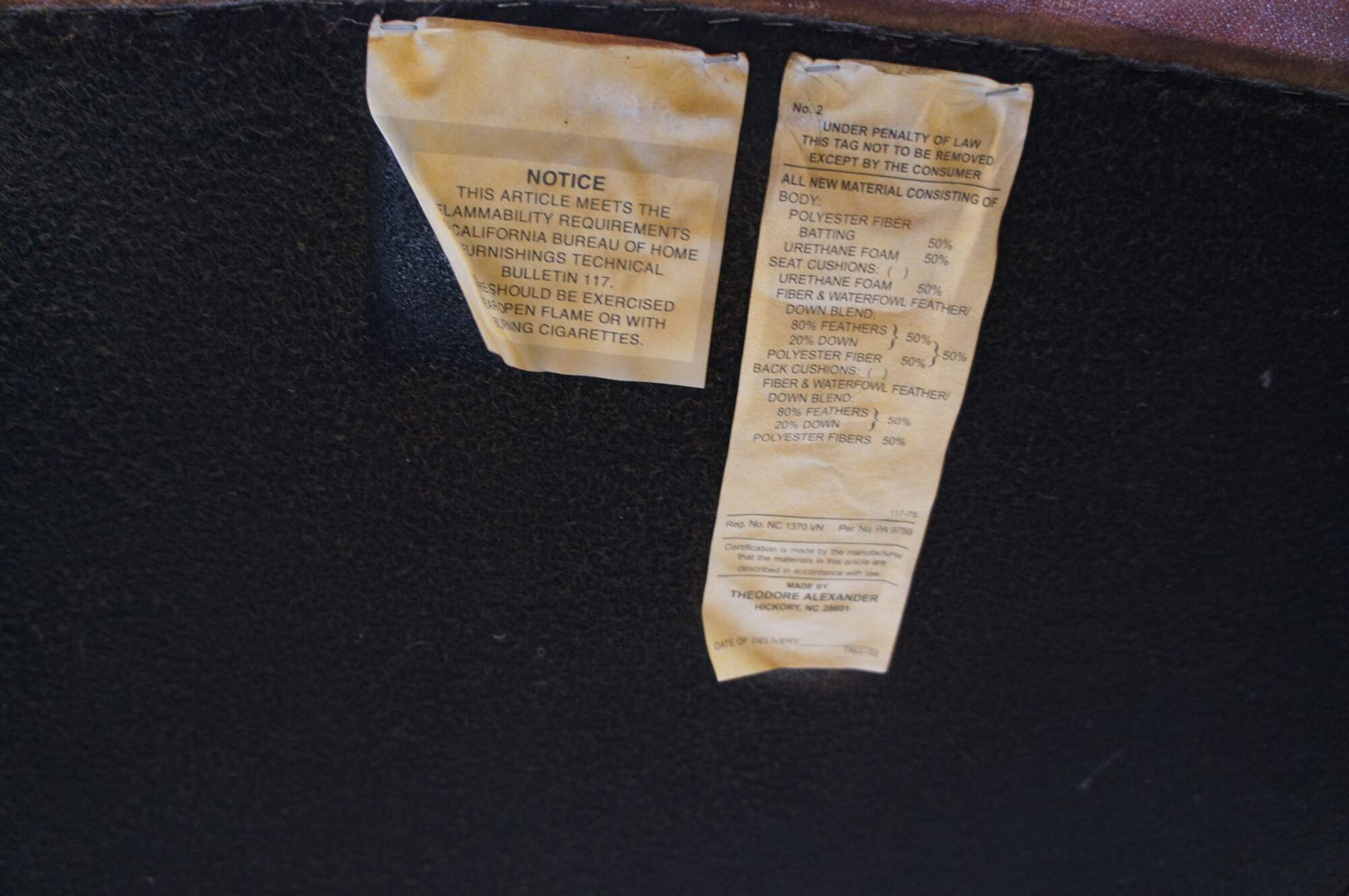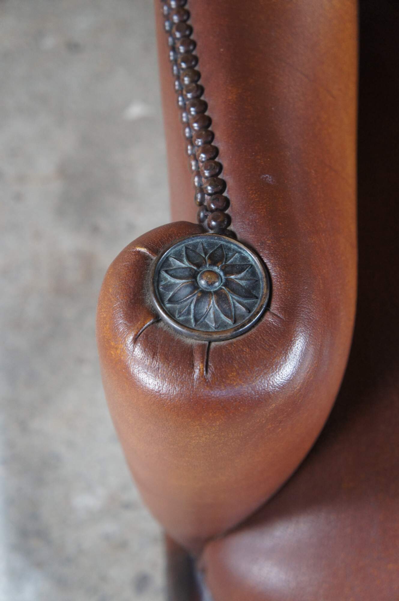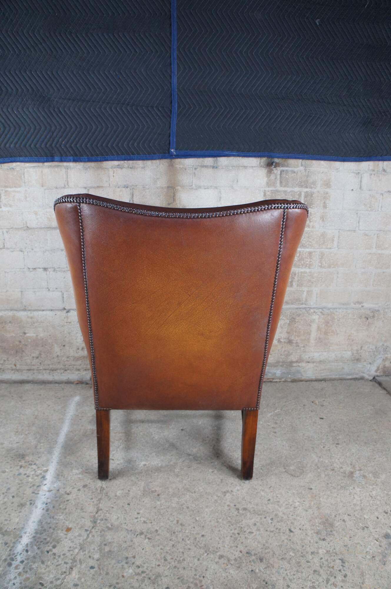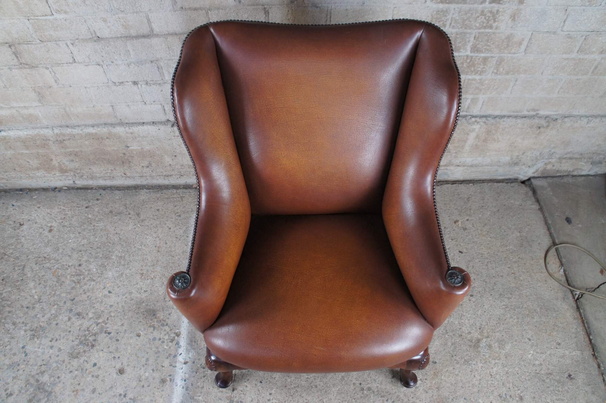 A Stately Georgian Style Wing Chair by Theodore Alexander, circa early 2000s. Features a mahogany frame with aged brown leather upholstery and brass nailhead trim. Arms are flared and scrolled with foliate medallions along the top. Front legs are cabriole form with scallop carved knees and pad feet. Front legs are connected to rear by spindle turned H stretcher. Seat Cushions are a blend of foam and Waterfowl / Down.