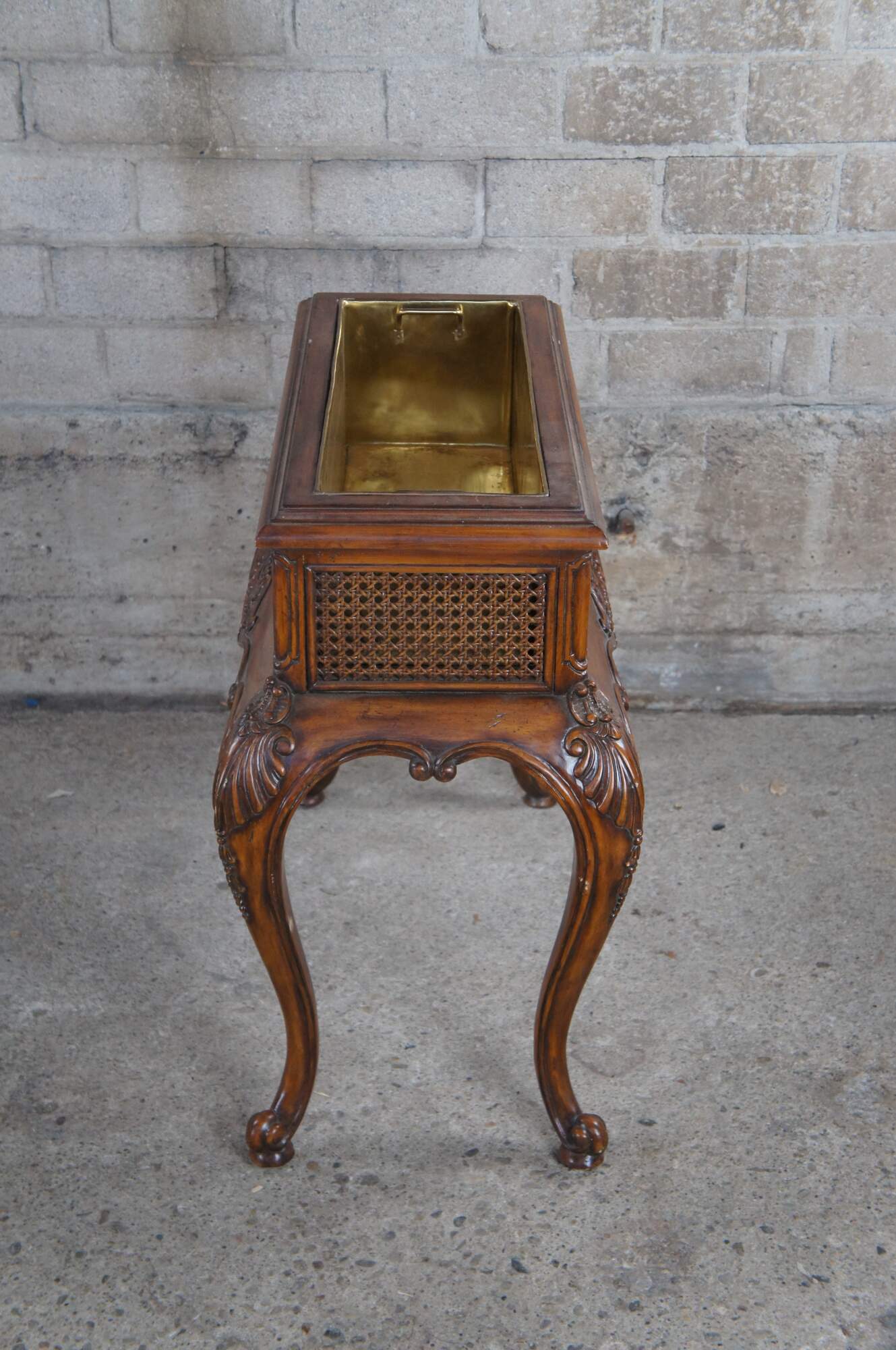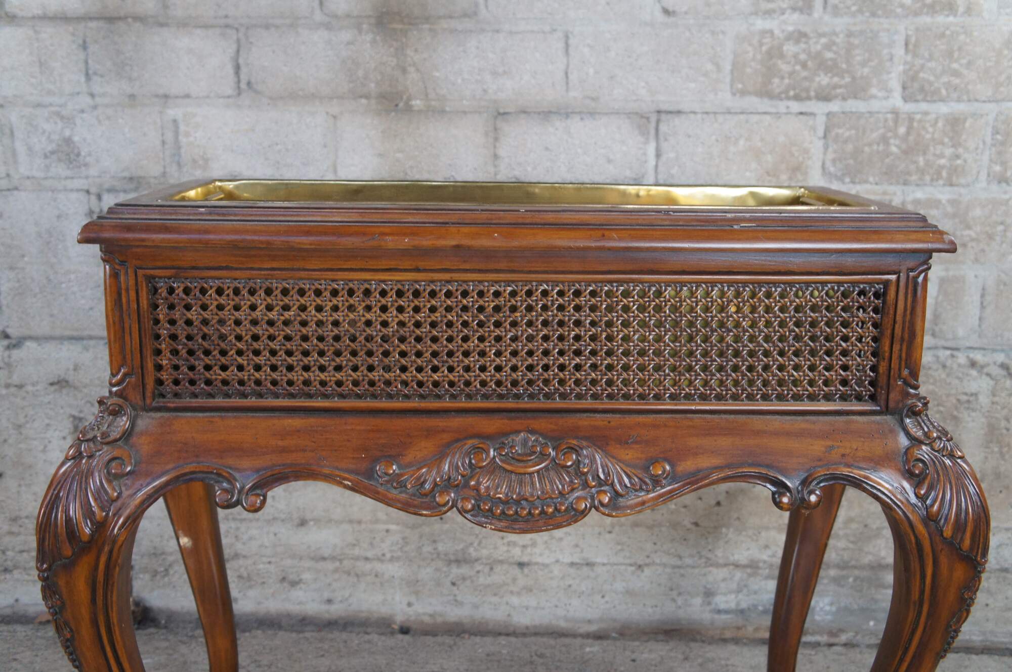 A beautiful late 20th Century plant stand / planter by Maitland Smith. Made from mahogany with a rectangular form over swooping cabriole legs and scrolled feet. Features scallop carved knees, serpentine aprons, caned siding and a removable brass liner with handles. Display your favorite plants, or bring out for a gathering as a beverage / wine / beer chiller or cooler.