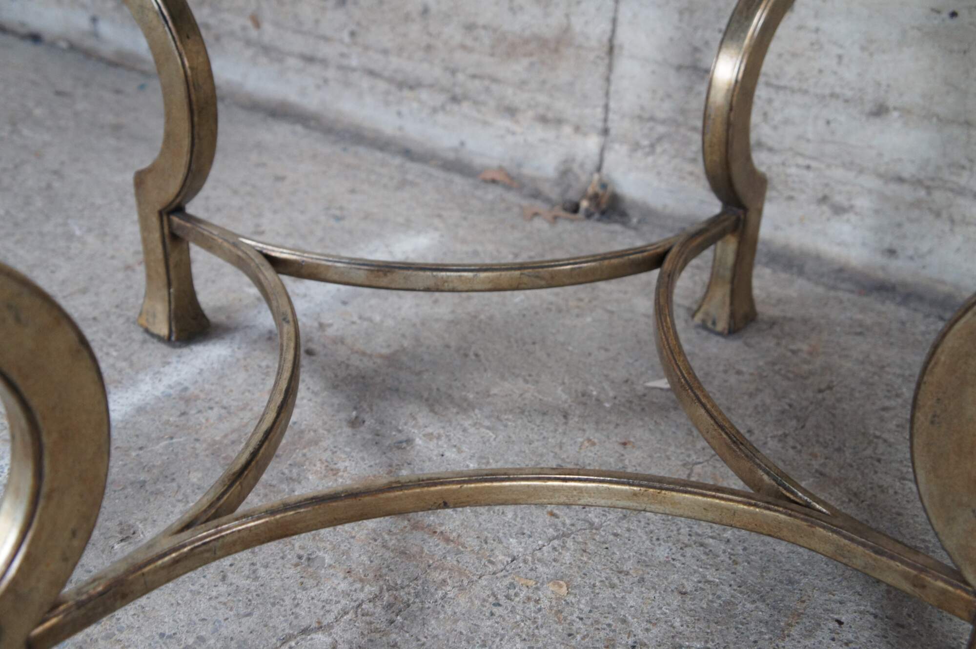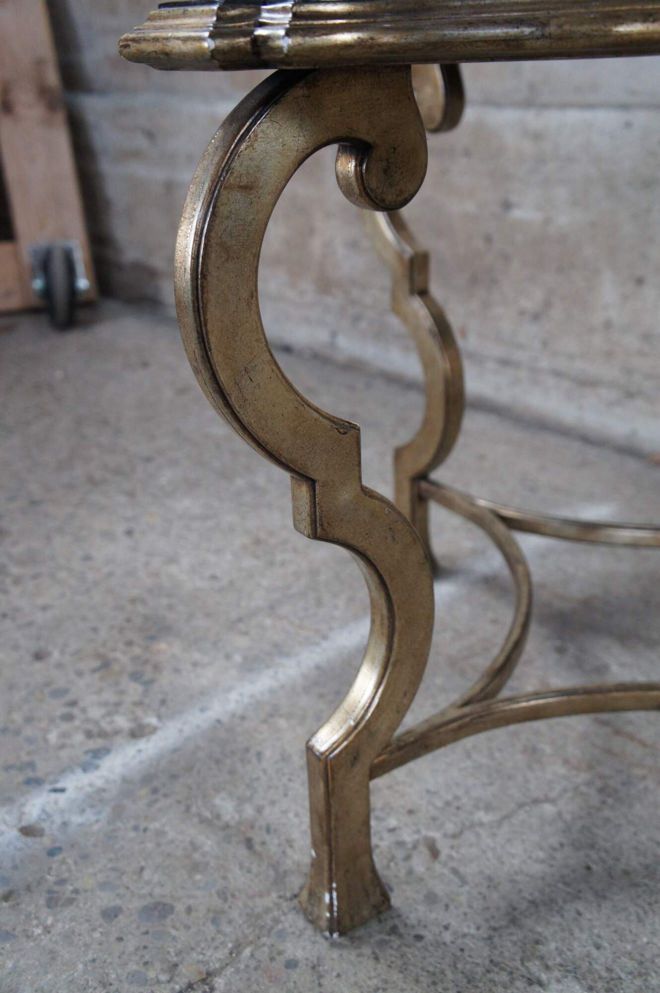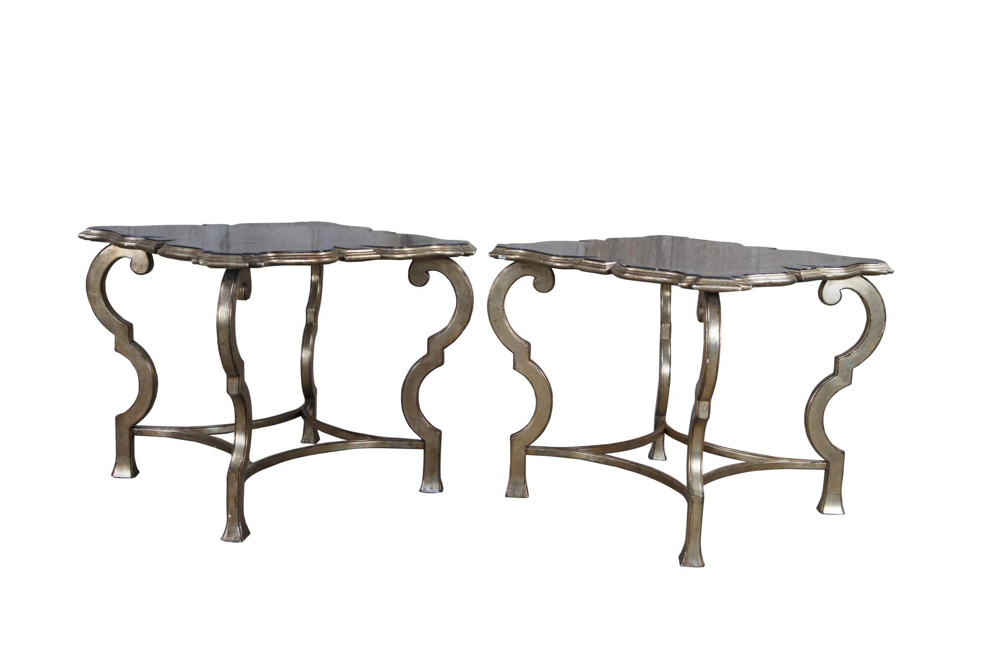 Pair of contemporary tables. Features an assymetral square form top with black crackle finish over ornate champagne colored bases.