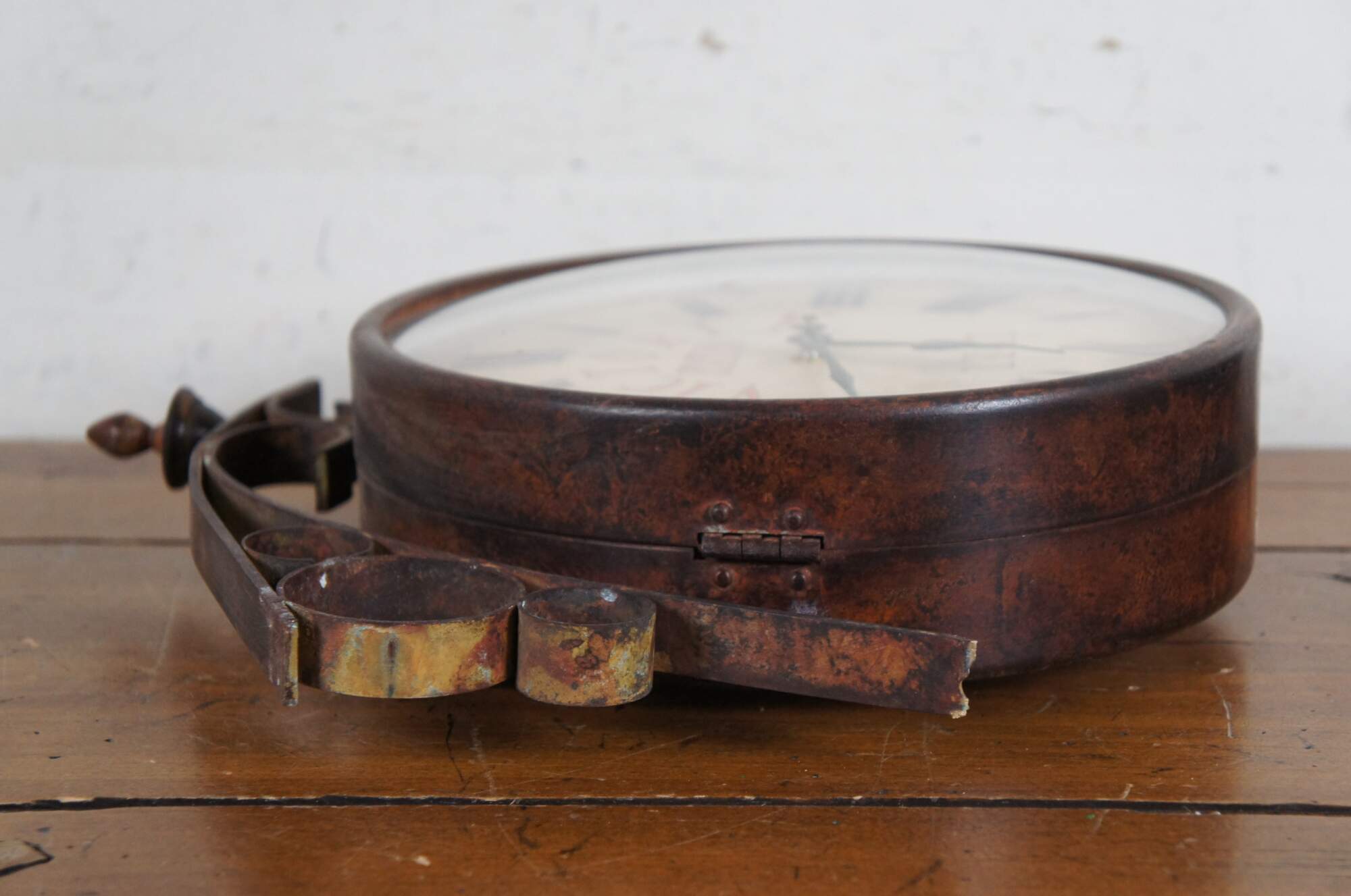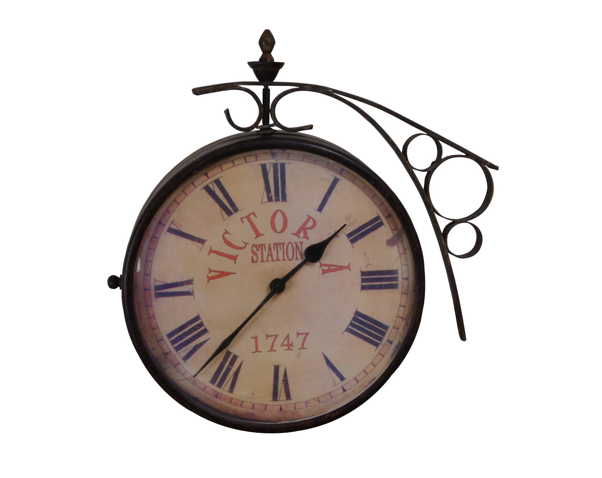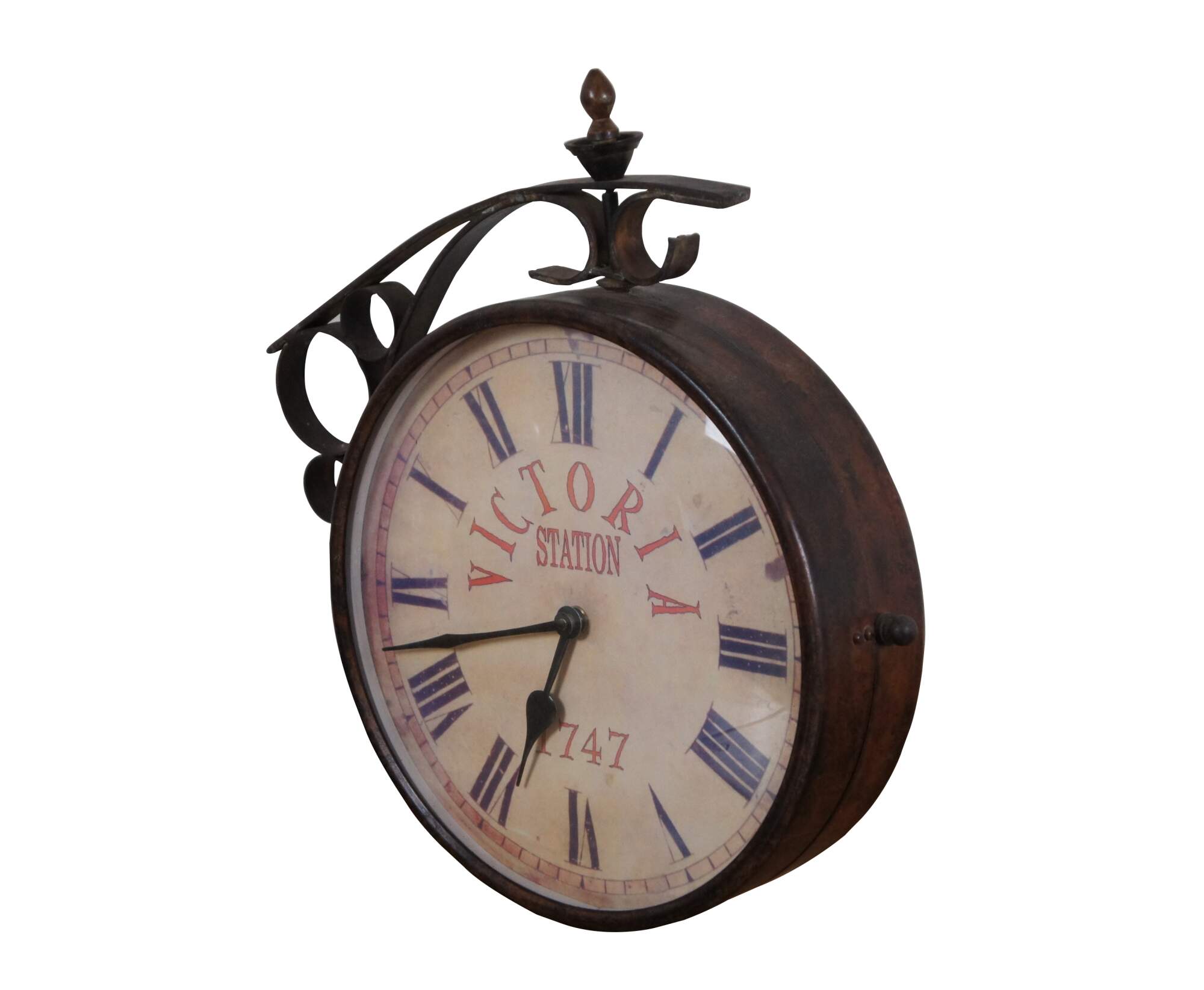 Late 20th century double sided railway clock styled after the famous clock at Victoria Station, London. Wrought metal wall mounted support and case in a dark bronze finish. 10 inch diameter printed face with faux distressing, Roman numerals, and the words Victoria Station 1747 in orange. Black metal hands. Young Town Quartz, battery operated movement.