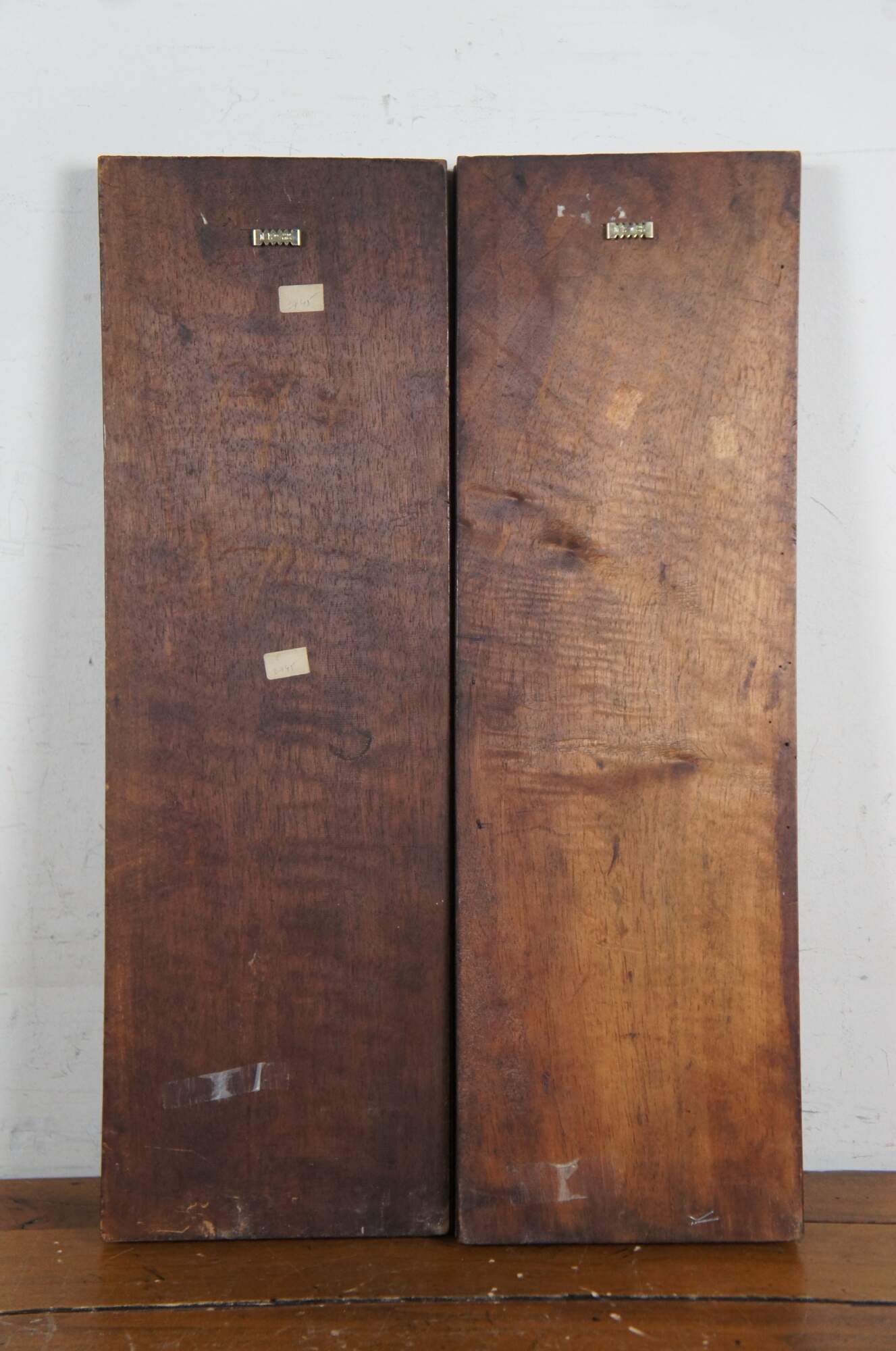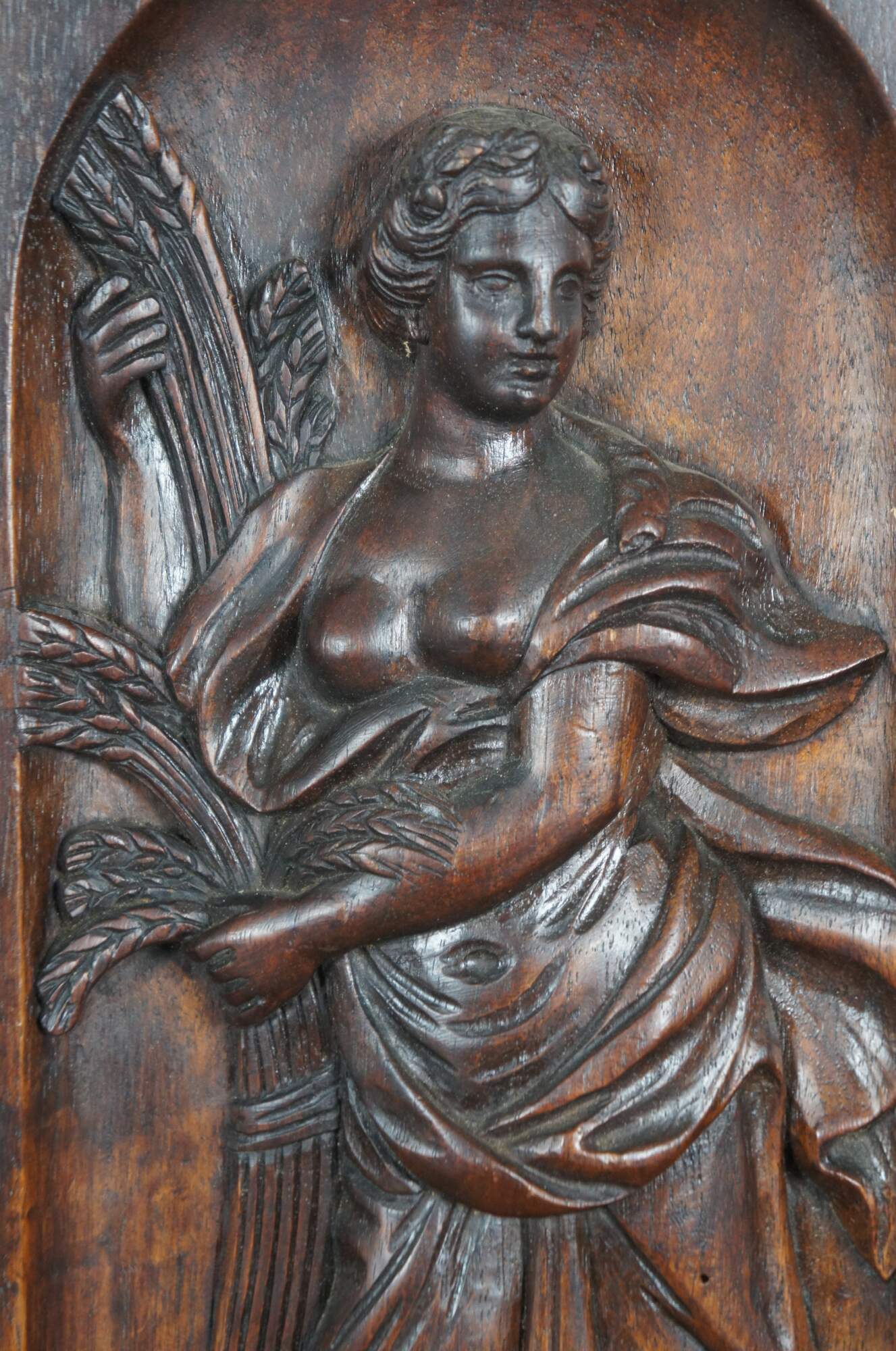 Pair of antique hand carved walnut bas relief panels / wall plaques, showing Neoclassical female figures, one holding sheaves of wheat and the other holding flowers.