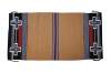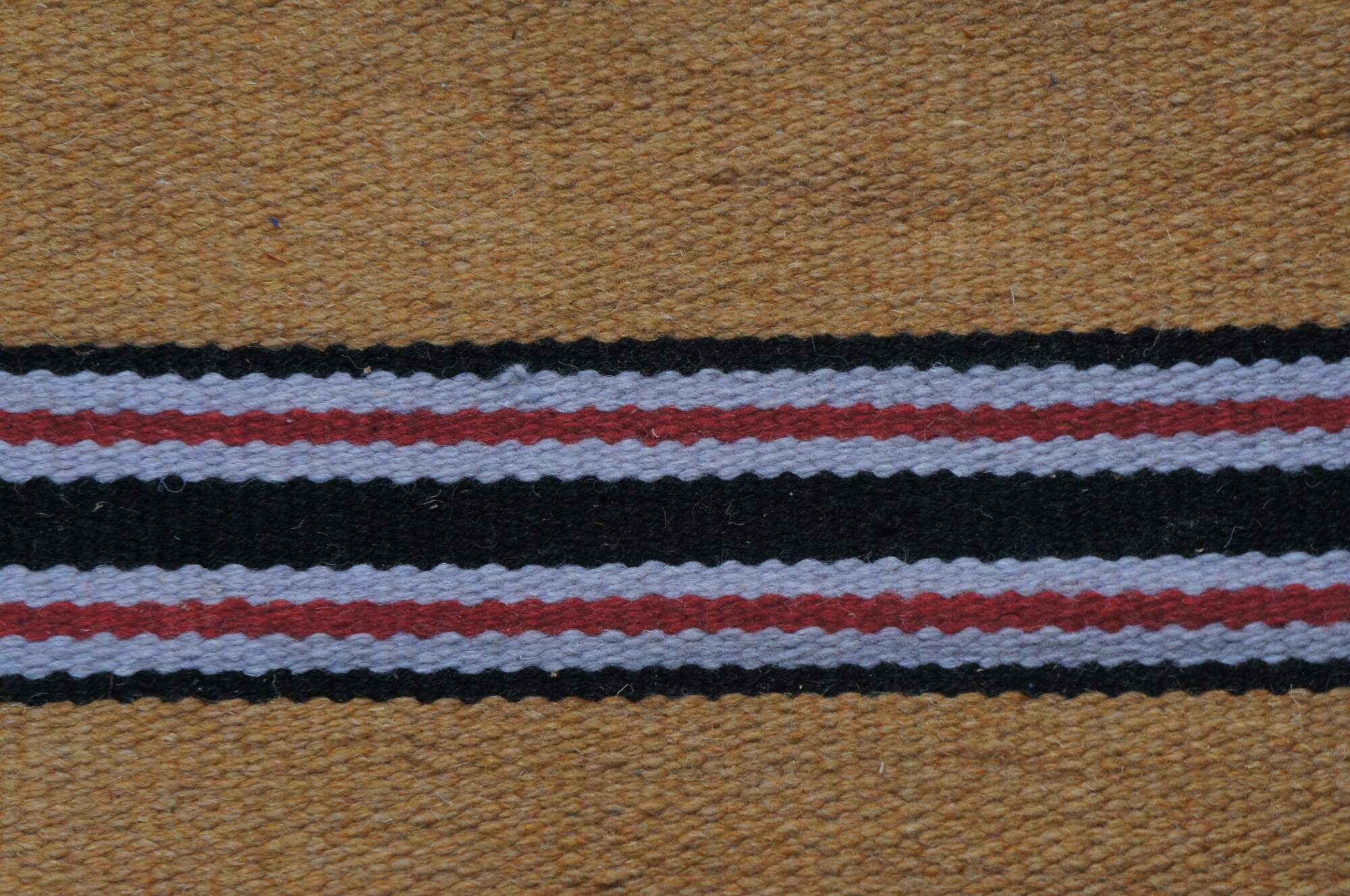 Vintage Native American / Navajo / Southwestern / Western / style hand woven wool saddle blanket / area rug / mat. Camel brown with stripes of black, red, white, and light purple, ends embellished with four crosses.