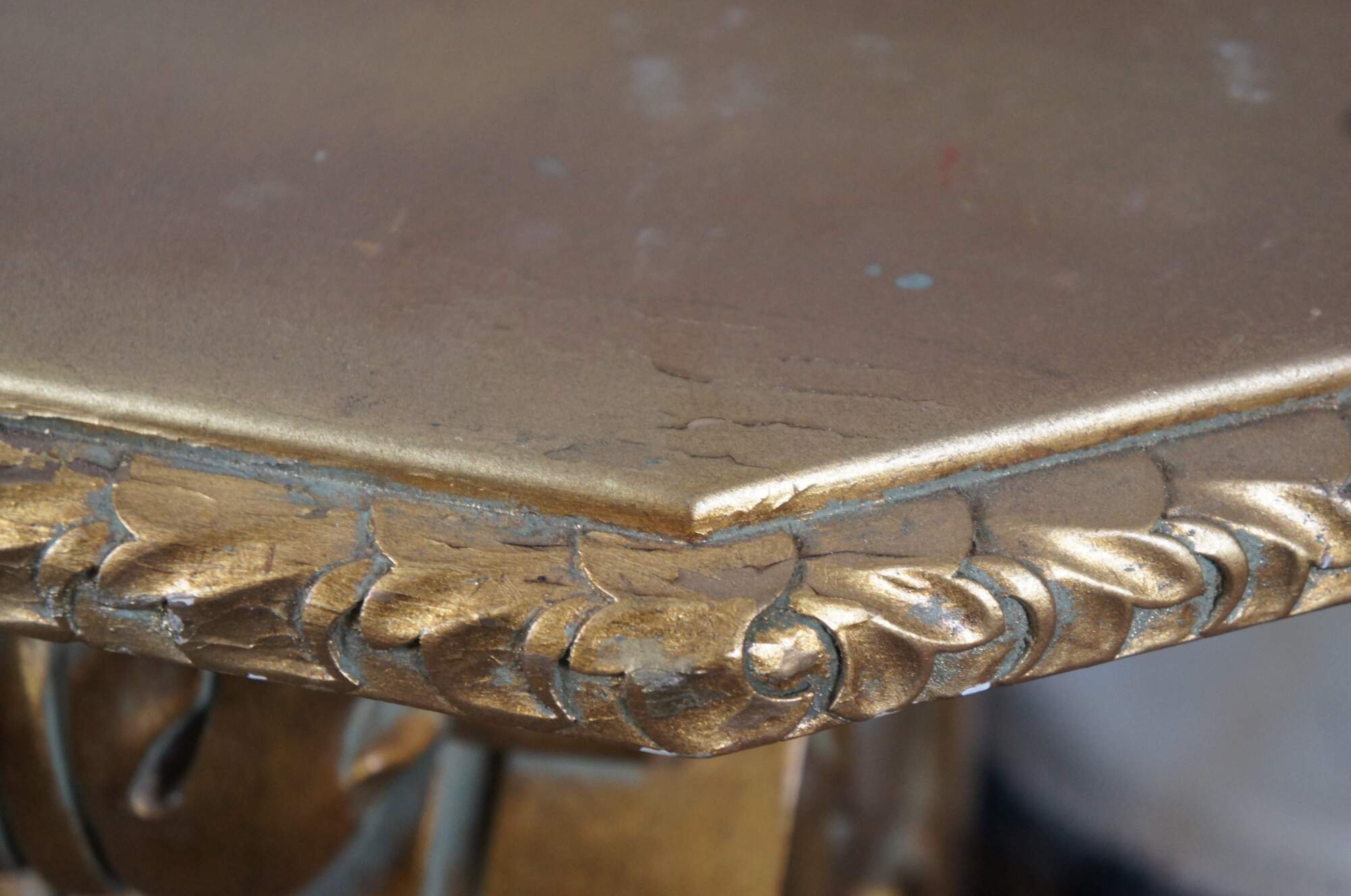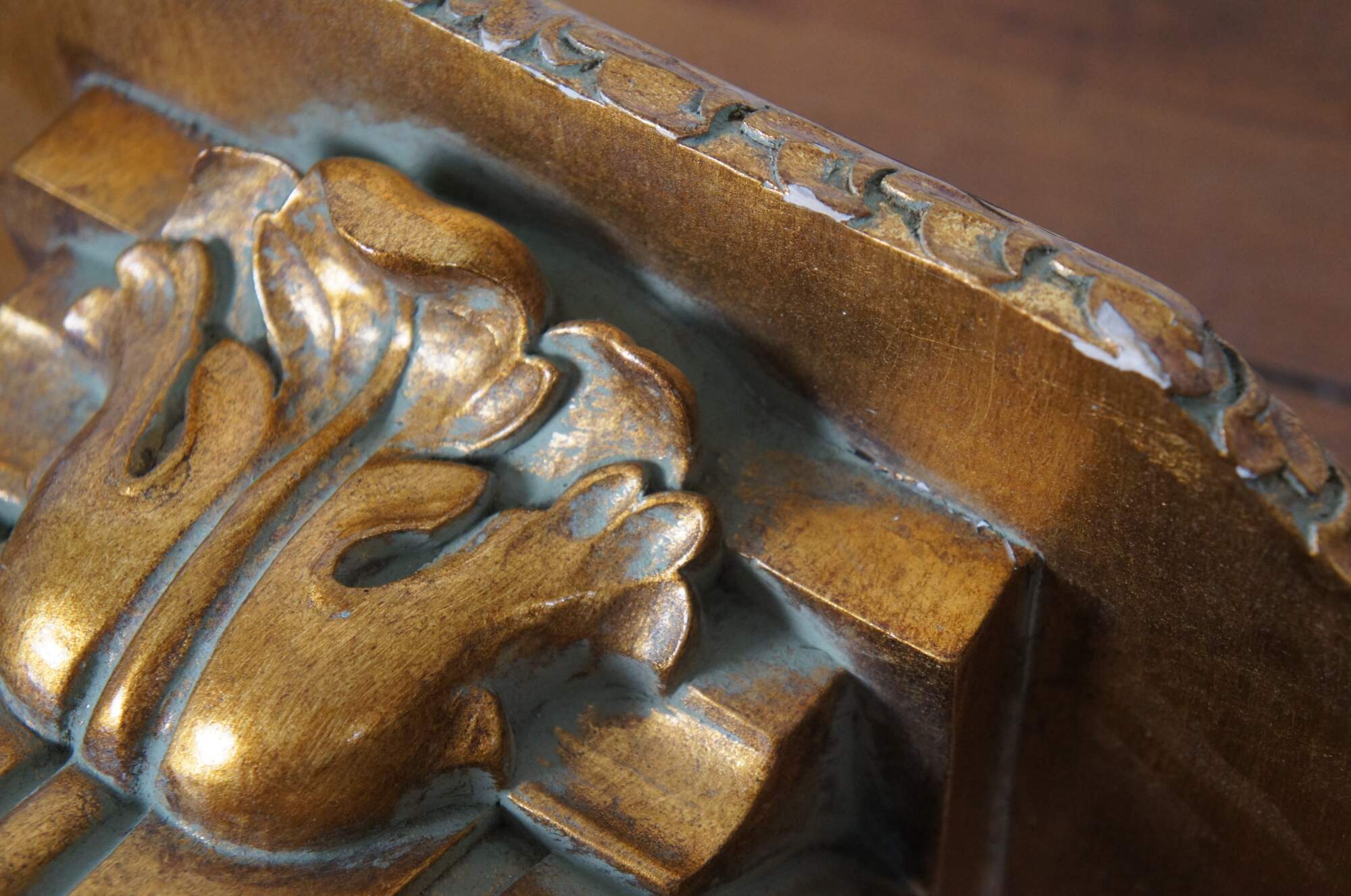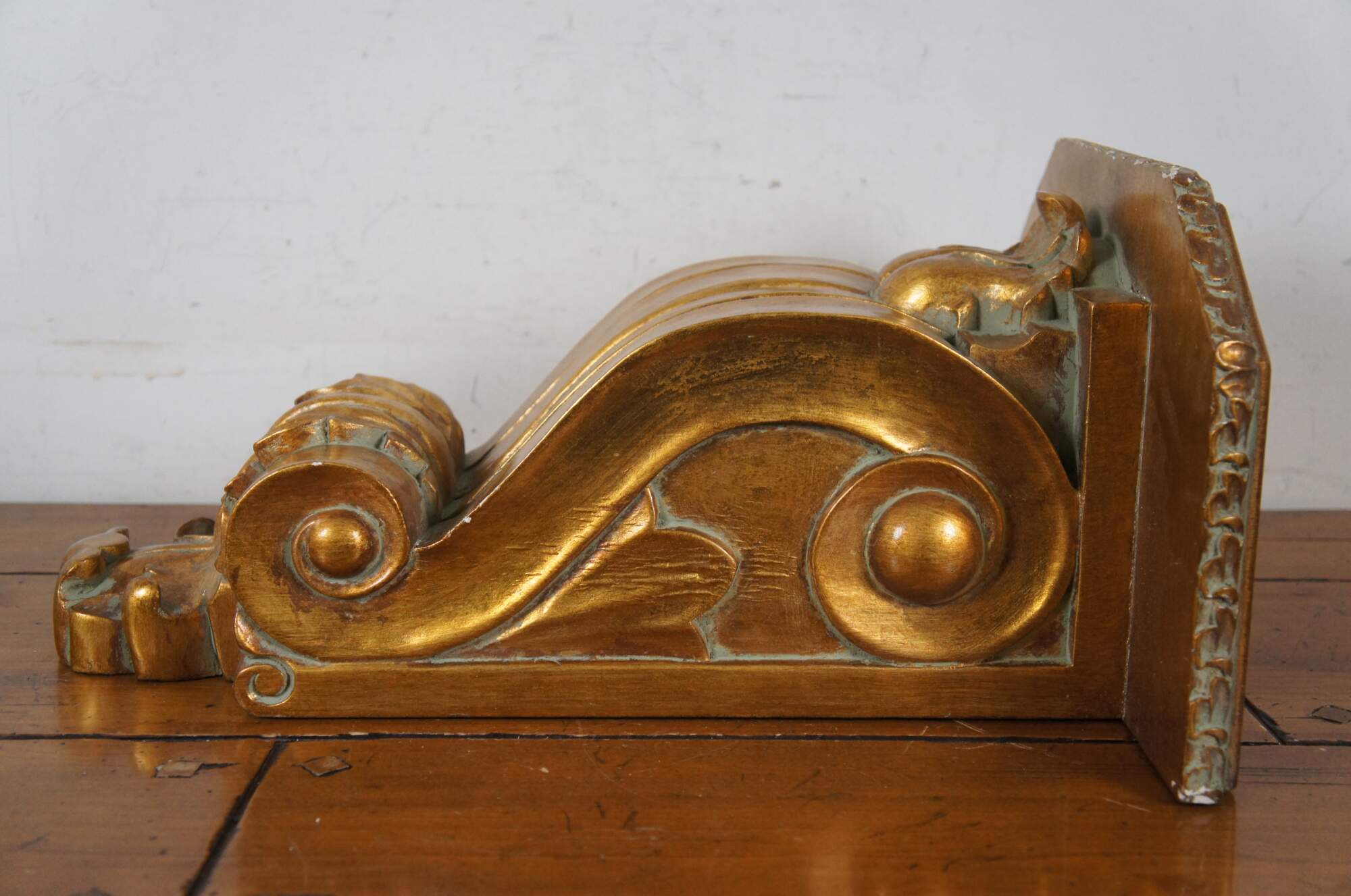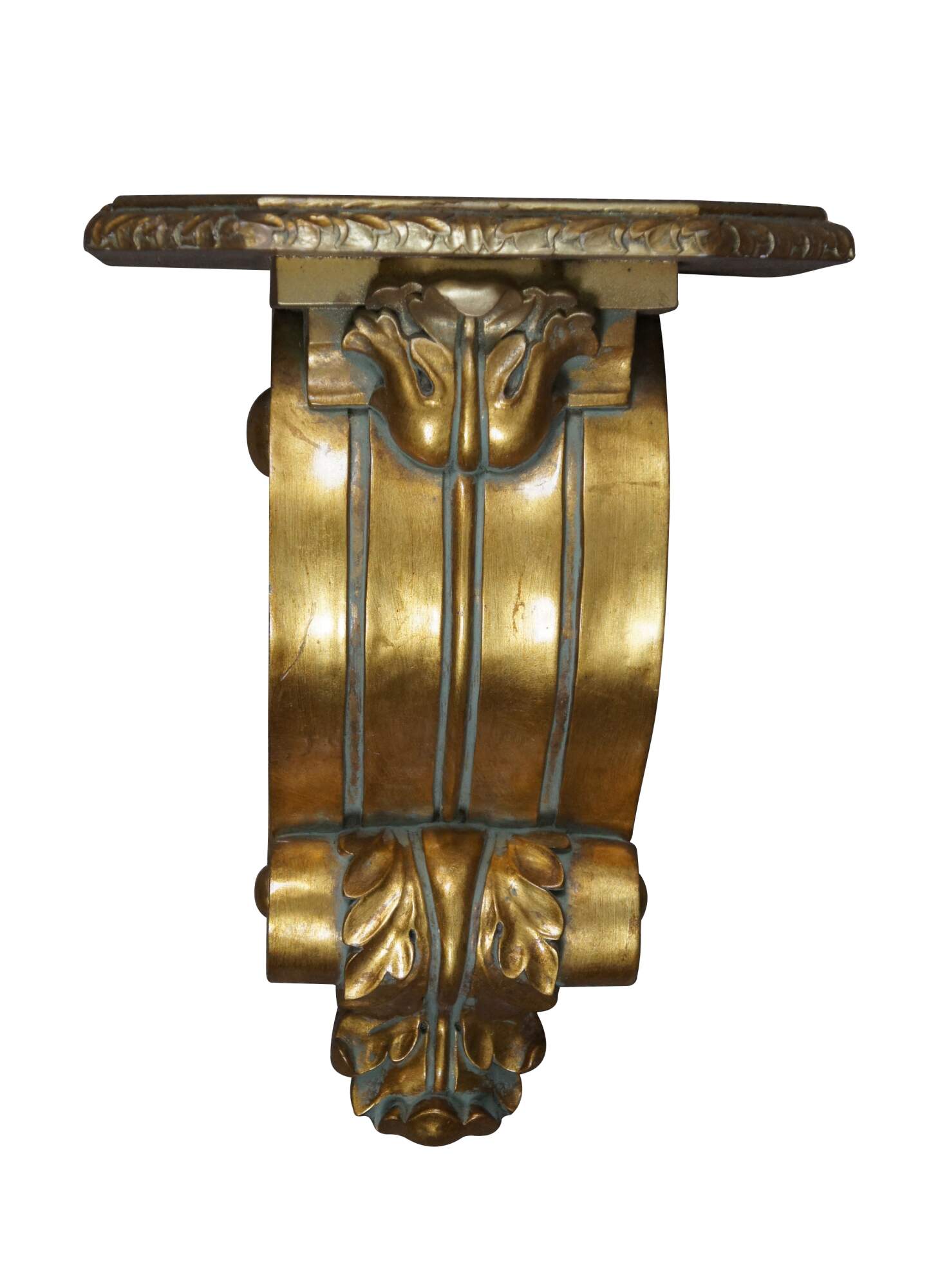 Pair of vintage 20th century giltwood corbels / wall brackets, featuring a grooved scrollwork body embellished with acanthus leaves. Rectangular top with clipped corners and foliate edge detail. WB-1016