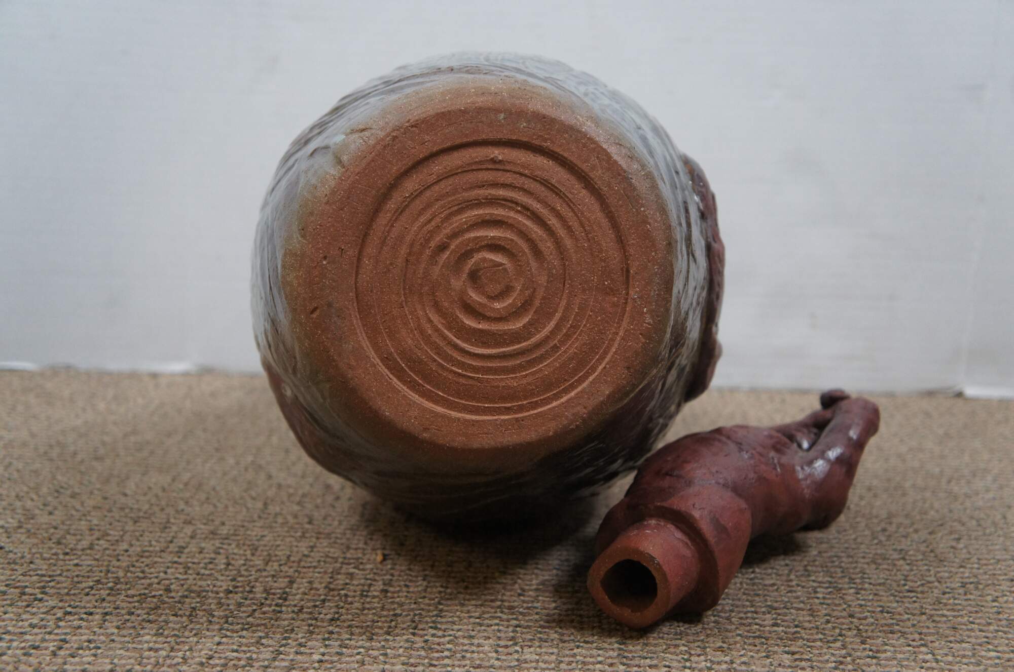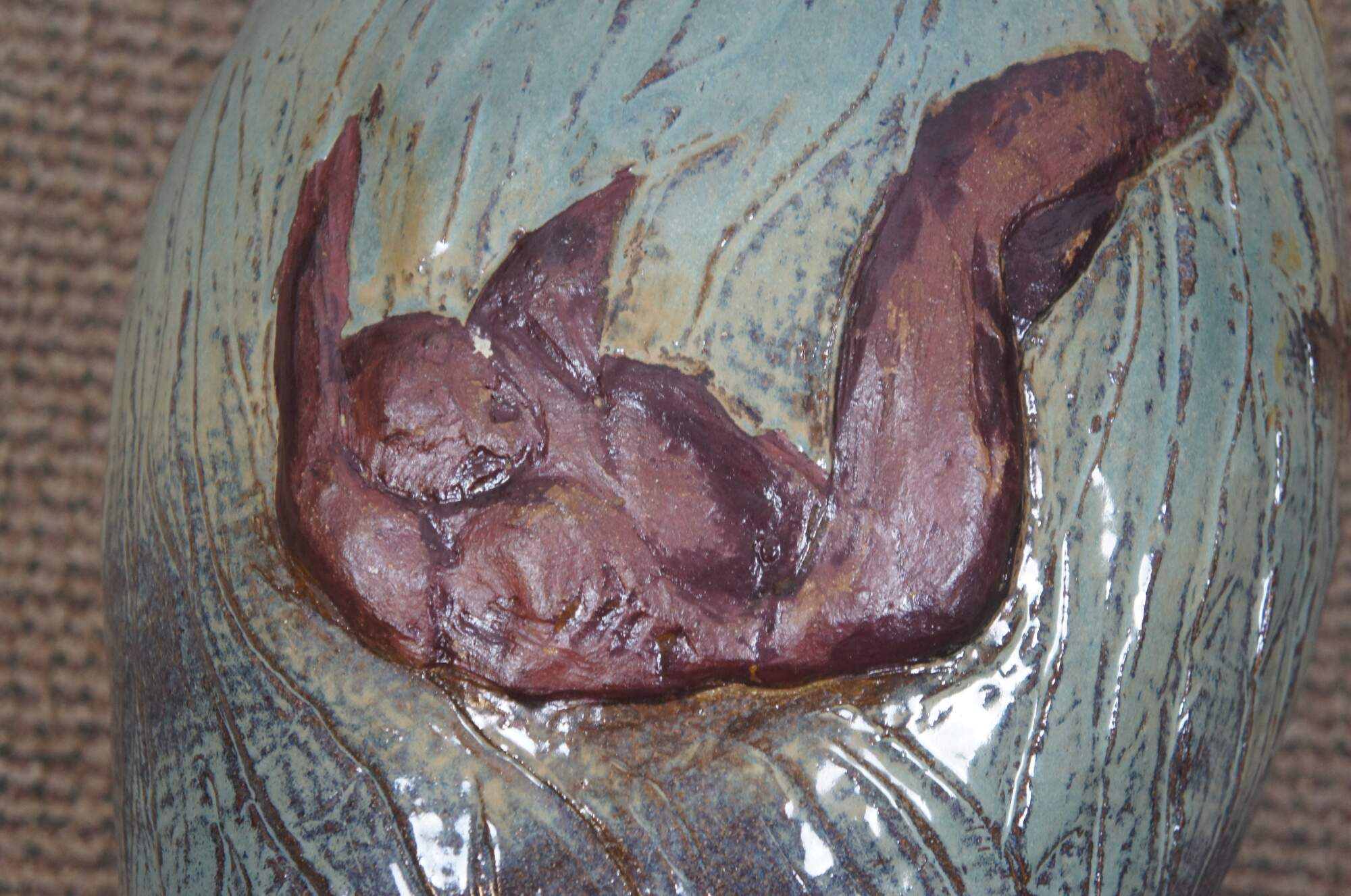 Vintage ceramic art sculpture by Bob Coates. Features a male figure emerging from the waist up from a swirling green base that resembles ocean waves or a veined flower bud, decorated with other brown figures in various dancing / falling attitudes. Signed Coates '02