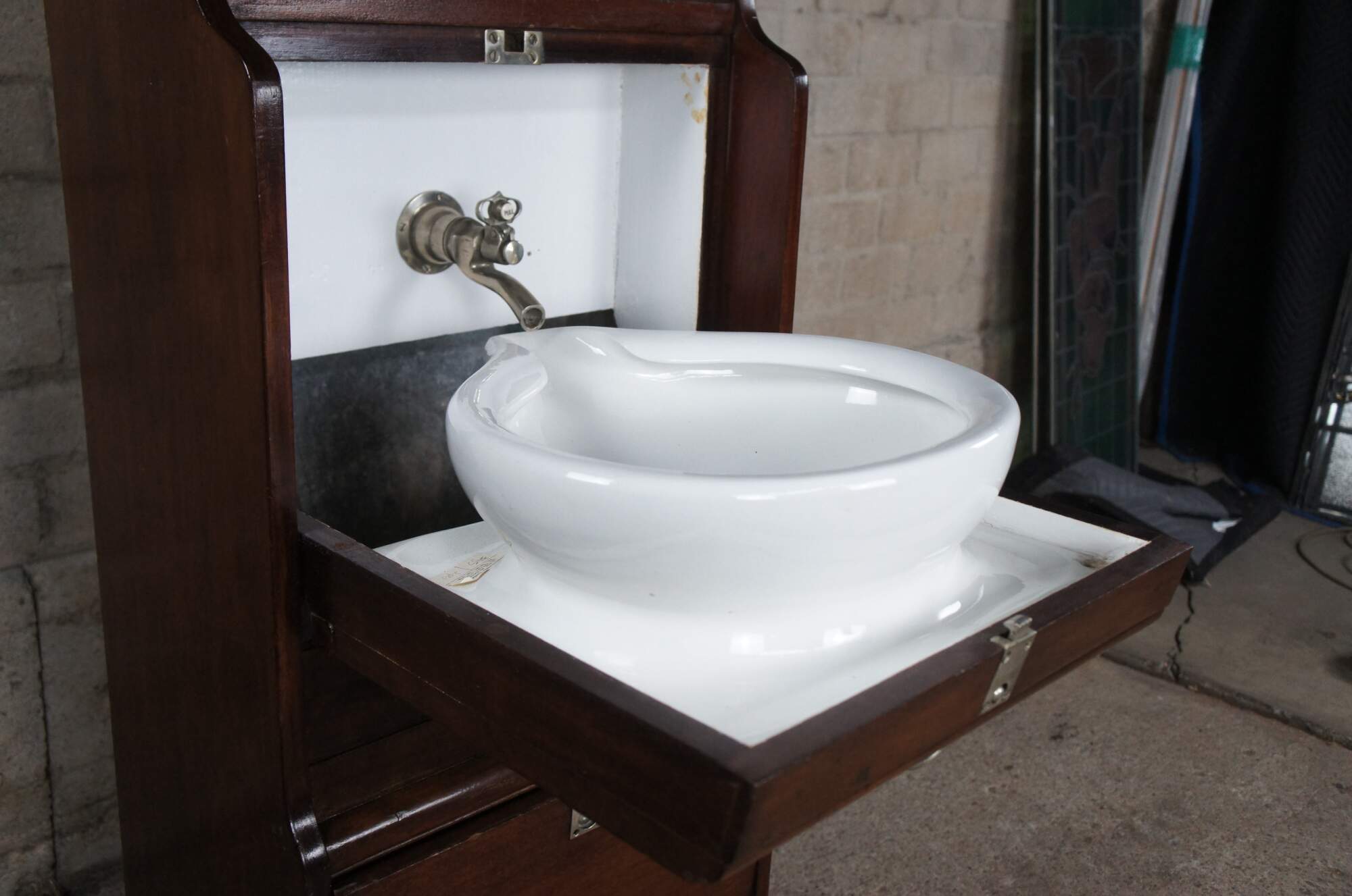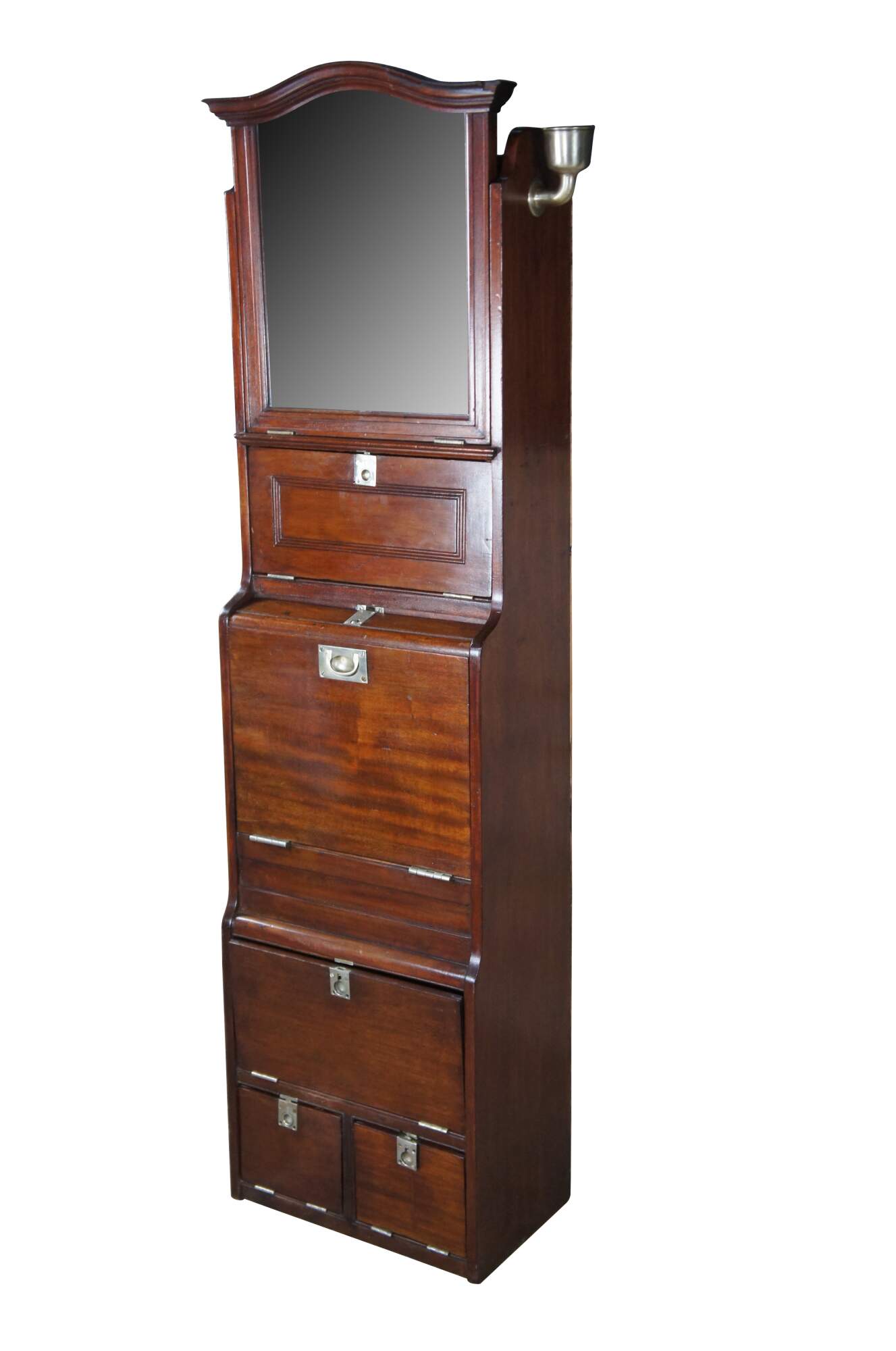 Antique nautical maritime boat / ship / steamship first class cloakroom compactum cabinet with porcelain wash basin and extras. Made of mahogany featuring overhead adjustable mirror with multiple storage cabinets / cubbies.