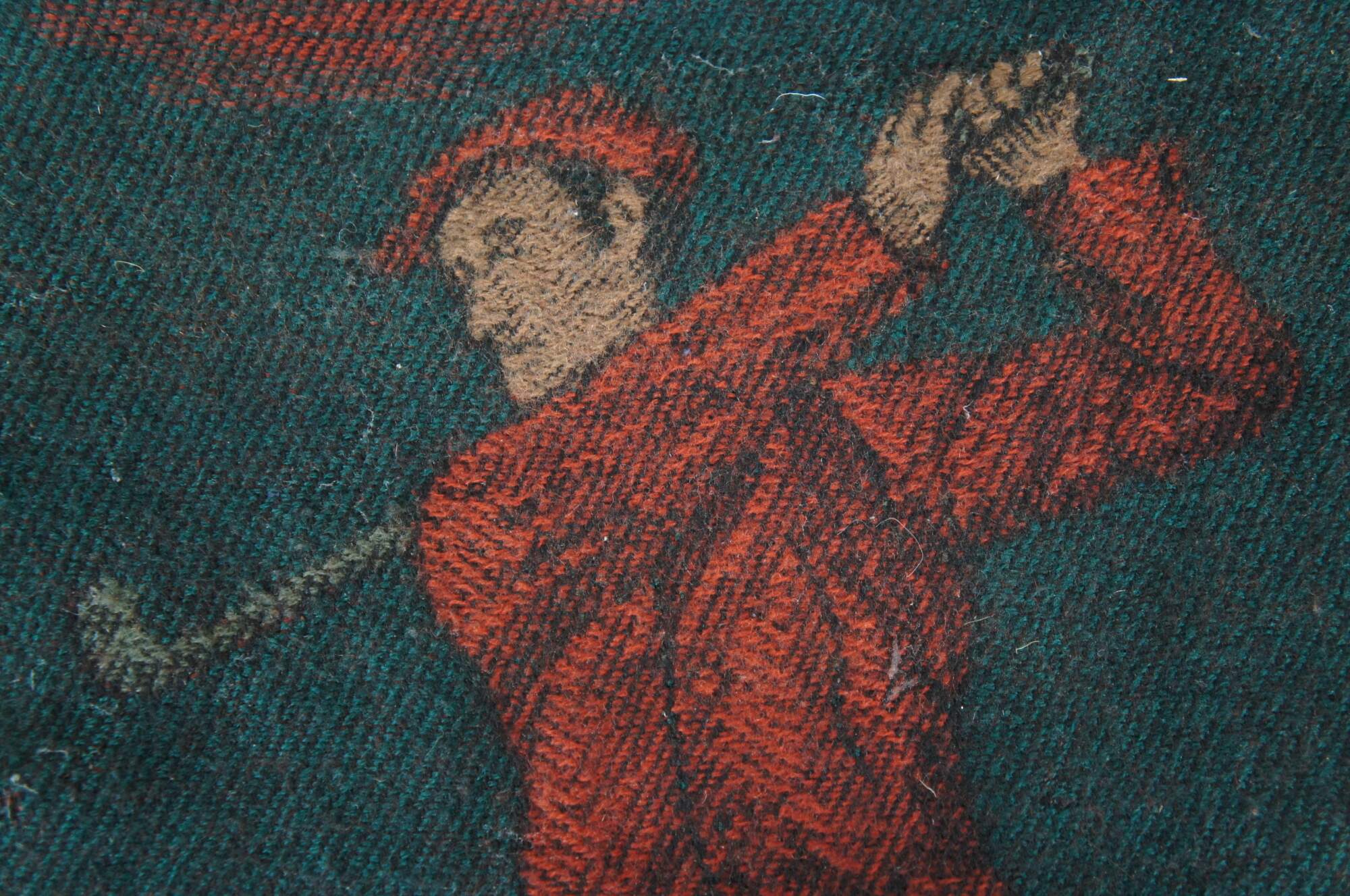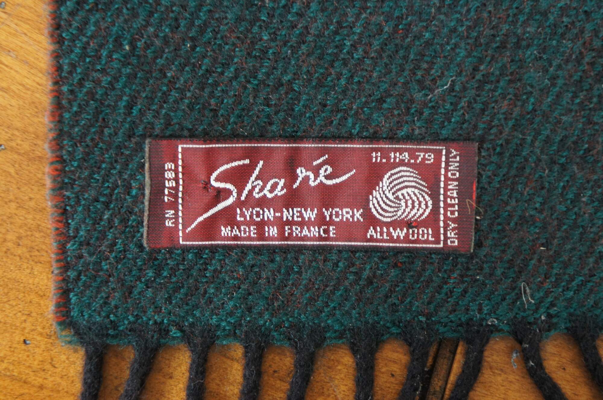 Vintage 20th century green and orange all wool scarf / muffler. Shows a golfer stepping into his swing. By Share of Lyon and New York. Made in France.