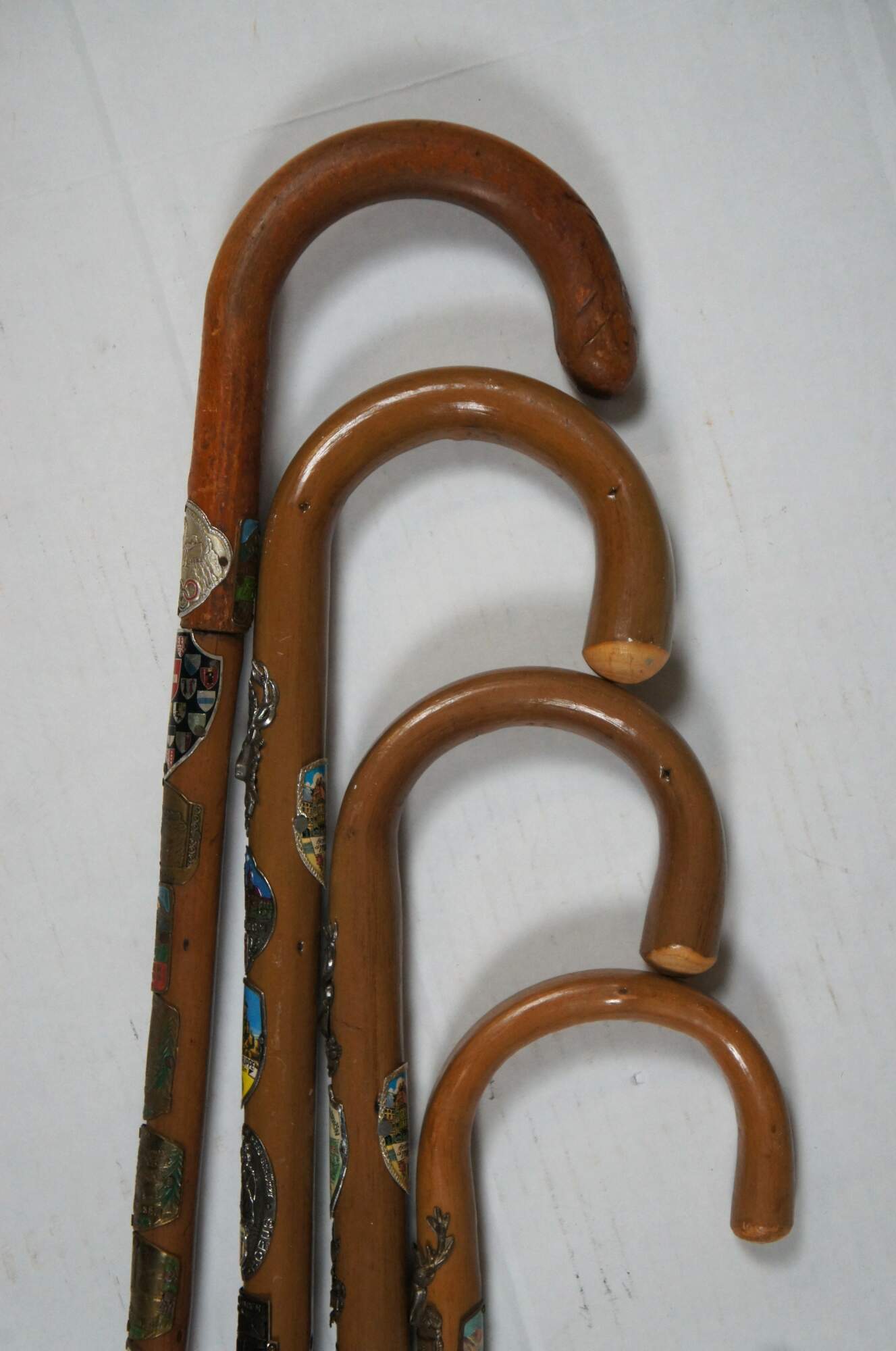 Lot of four vintage German / Austrian folk art traditional hook style walking sticks / canes, embellished with German and other assorted European hiking souvenir badges. 63 total badges across the four canes with several repeats. Olympics, Munchen, Wendelstein, Innsbruck, Wildflecken, Rohn, Rothenburg, Venezia, Uberlingen, Tiroler Adler, St. Gilgen, Amsterdam, Konstanz, Gottshardpass, St Moritz, and more. Brass and aluminum ferrules.
