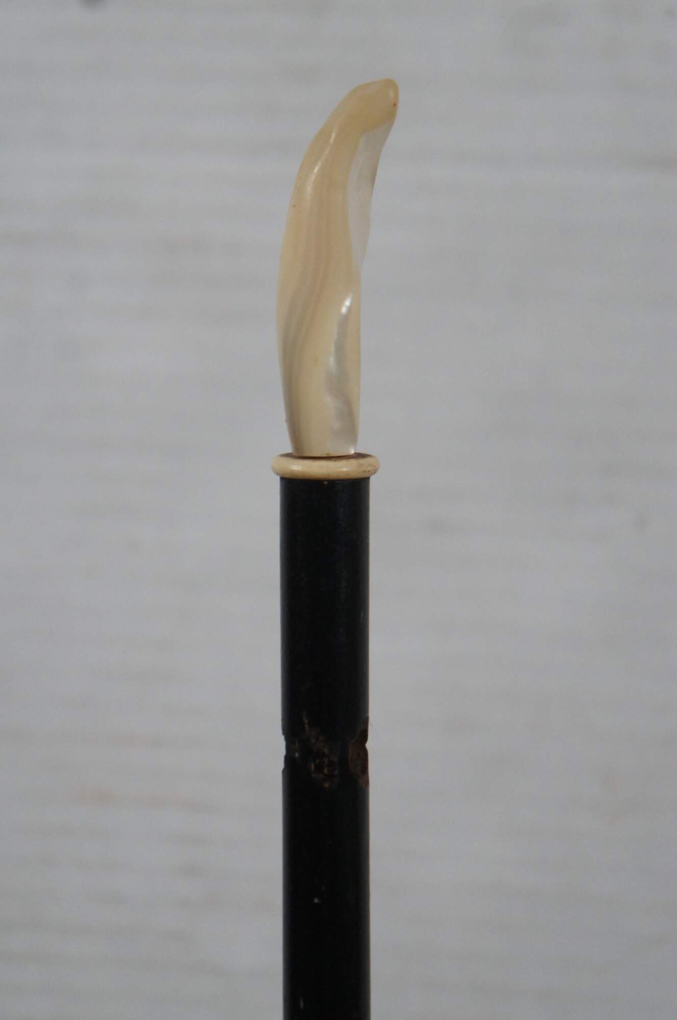 Late 19th century slim, wooden, black painted French walking stick / cane with horn ferrule and naturally shaped, polished mother-of-pearl knob. Hole drilled through upper part of shaft for a wrist strap.
