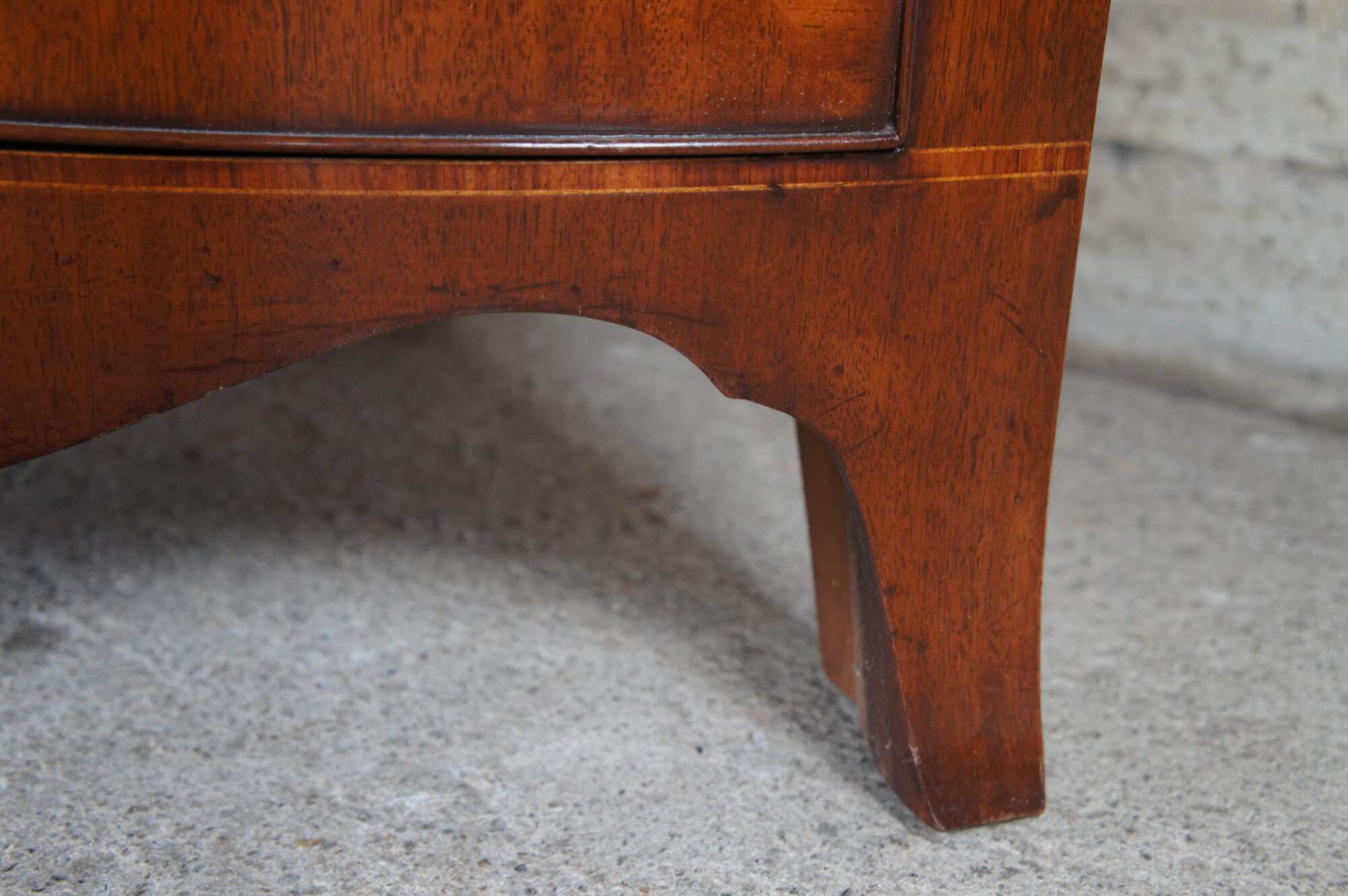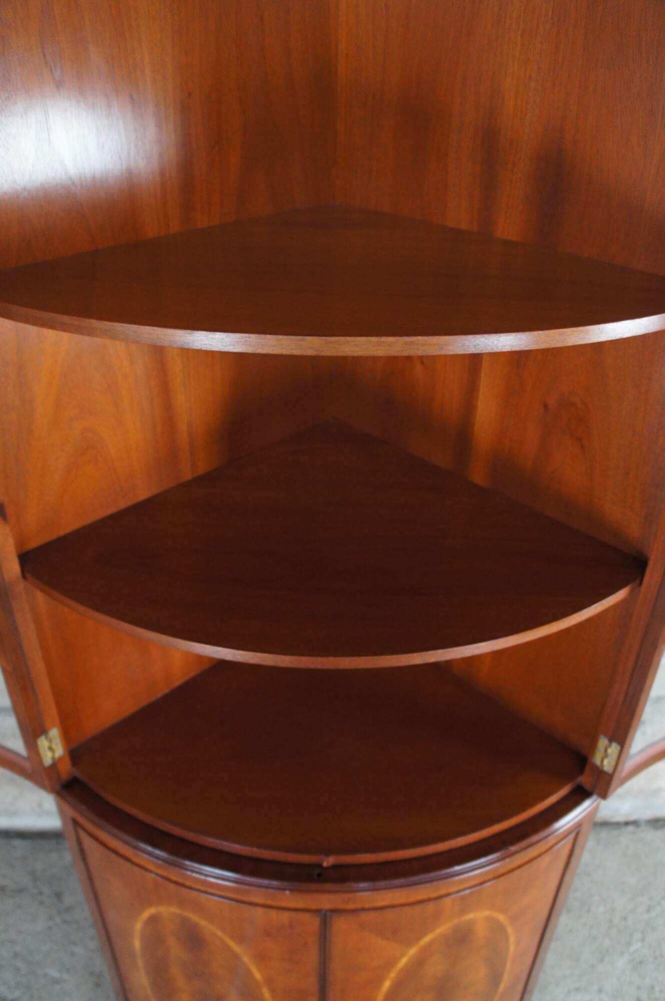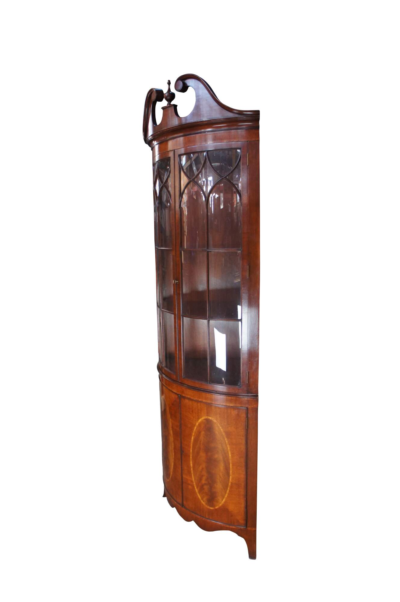 A petite English corner cabinet by Arthur Brett, circa 1980s. Features a curved form made from mahogany with a tall glass covered hutch, having ornate fretwork and two interior shelves. The base showcases two lower doors with crossbanded crotch mahogany panels and inlay. Opens to one removable shelf. The cabinet is supported by splayed legs between a serpentine apron. Crown is open pediment with turned trophy finial. Makers mark along backside. The cabinet breaks down intwo three pieces for ease of movement. Includes lock and key.
