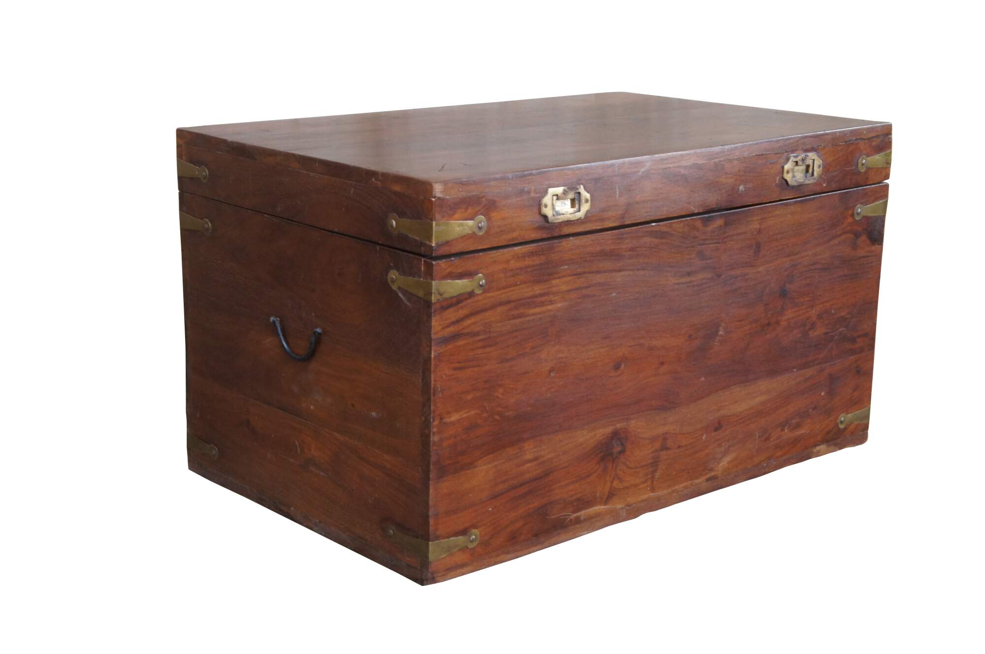 British Colonial style Camphor wood blanket storage chest or coffee table. Features a nice patina with brass accents and iron handles. Brass handles along the fron are recessed. Trunk has a stop along the back side to keep the top open. Circa 1980s