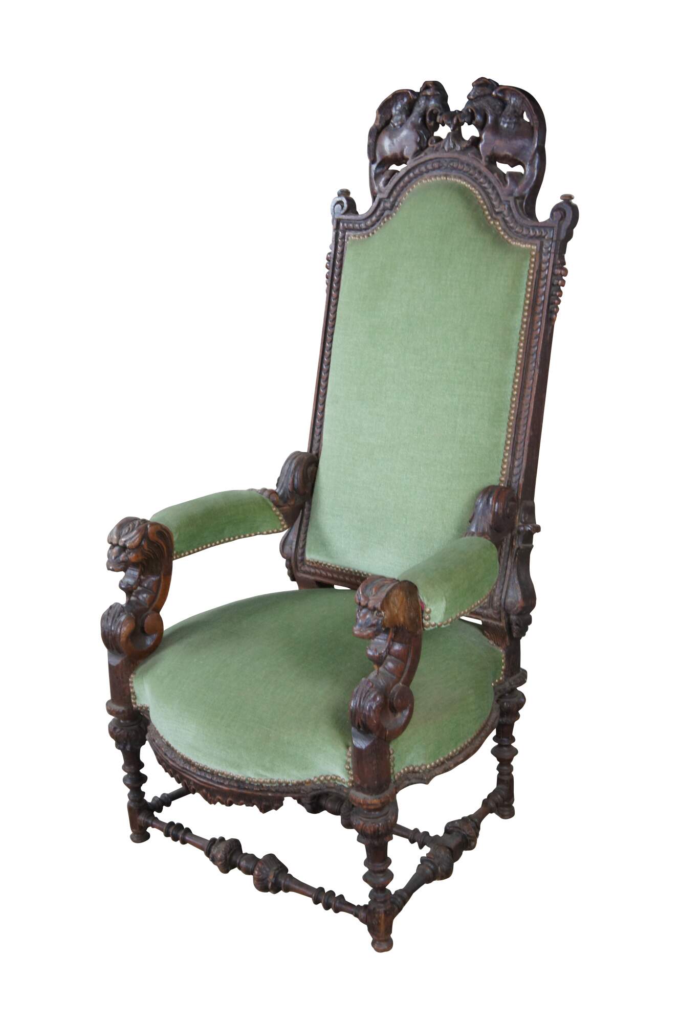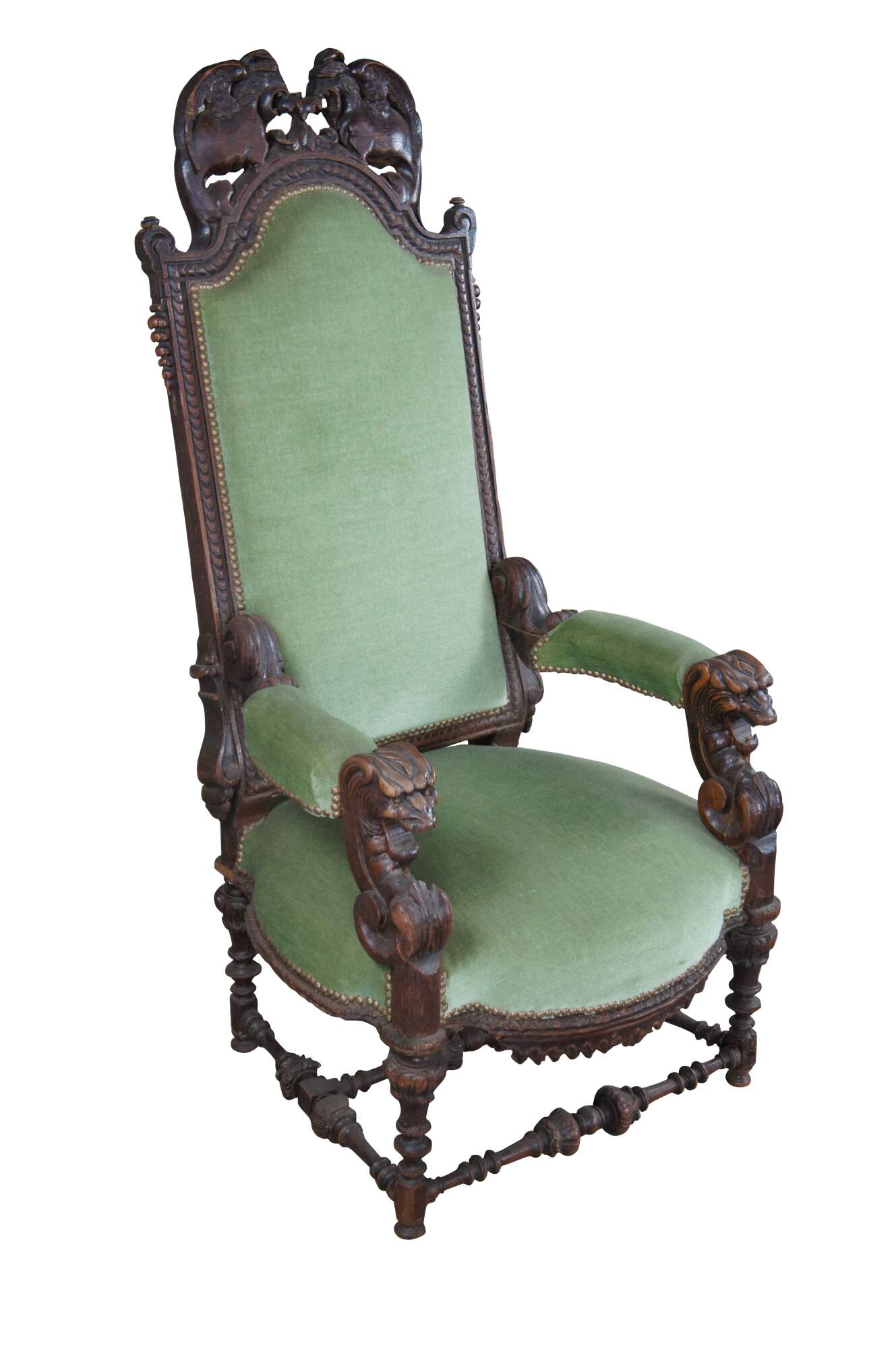 An antique Victorian arm chair, circa 1880s. Features a high back with figural Gothic flair. Crafted from oak with intricate carving thoroughout. Upholstered in a green velvet with brass nailhead trim.