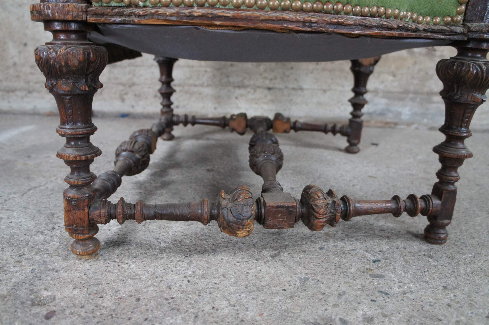 Fair; wear, distressing, scuffing, chipping and edge wear. some missing carvings, most notably the right side of the griffon on the arm.