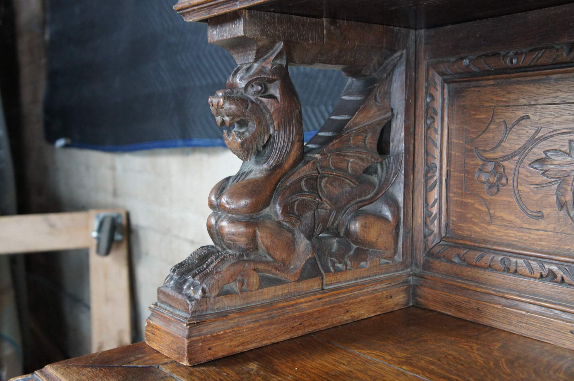 Exceptional Antique 19th Century Renaissance Revival Hunt Cabinet. Hand carved from oak with an upper display portion raised over a figural griffon carved backsplash. Features low relief carved doors with neoclassical motifs showcasing a basket of fruit over a quiver, foliate and leaves. Interior opens to two adjustable shelves. The outer stiles of the hutch are carved with figural spandrels over an acanthus and berry motif. Crown is centered by a prenounced gargoyle motif between a leaf and vine motif set between French medallions.