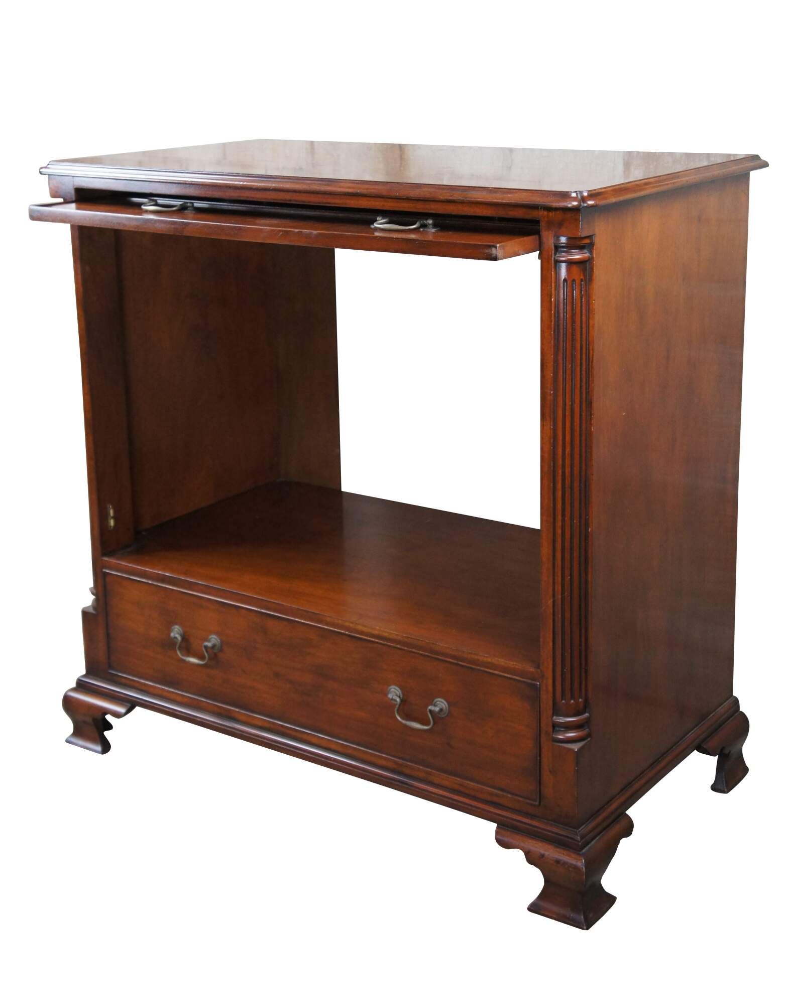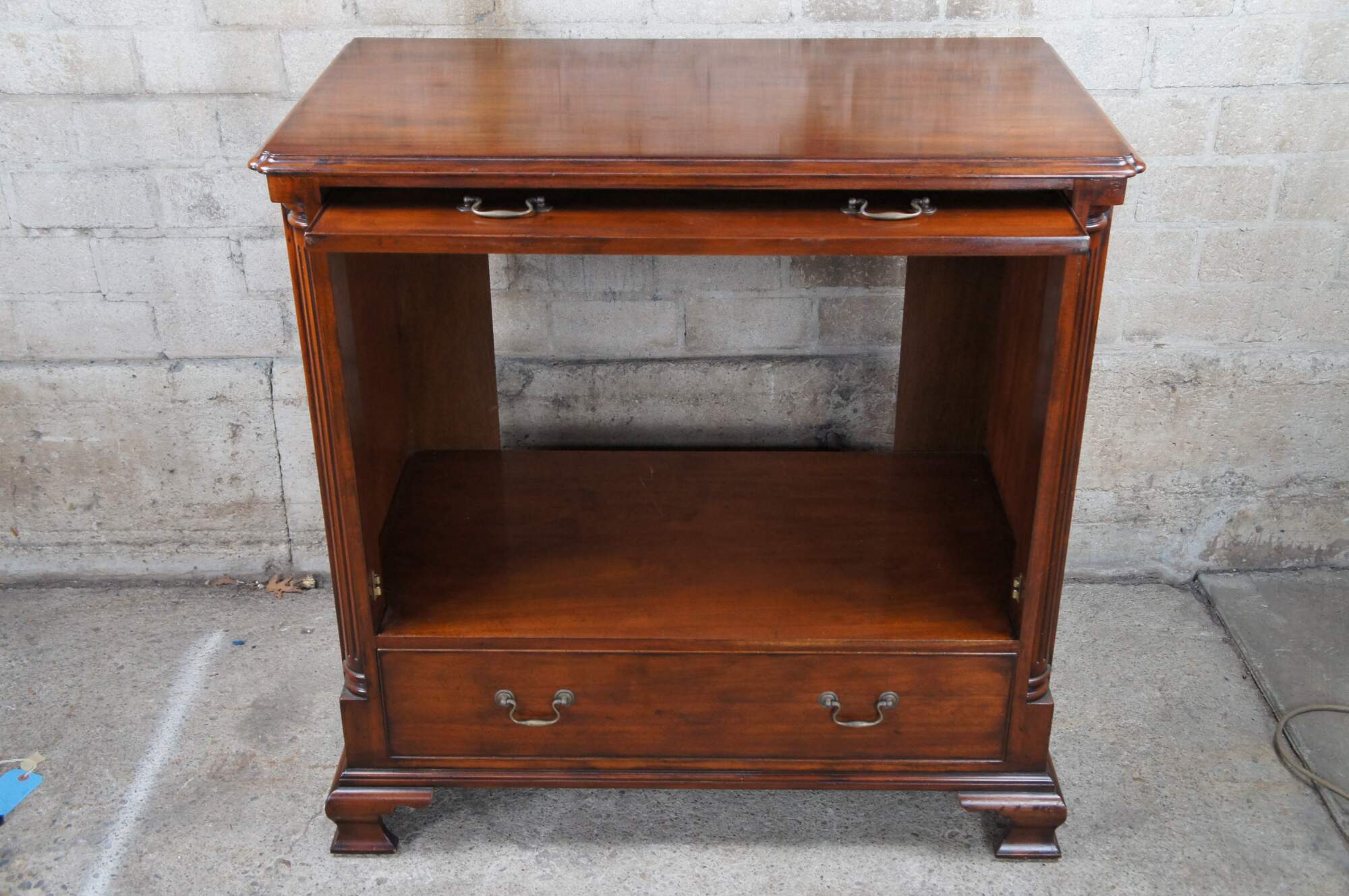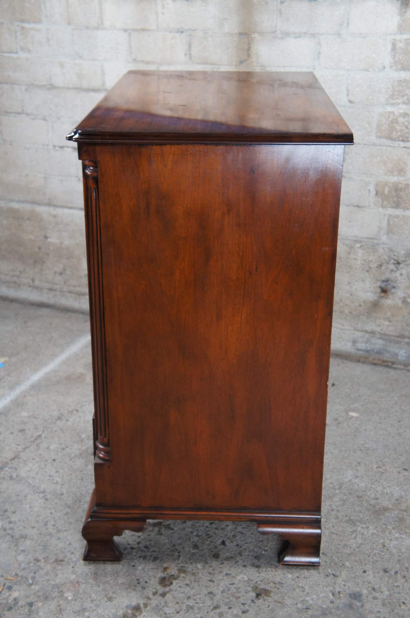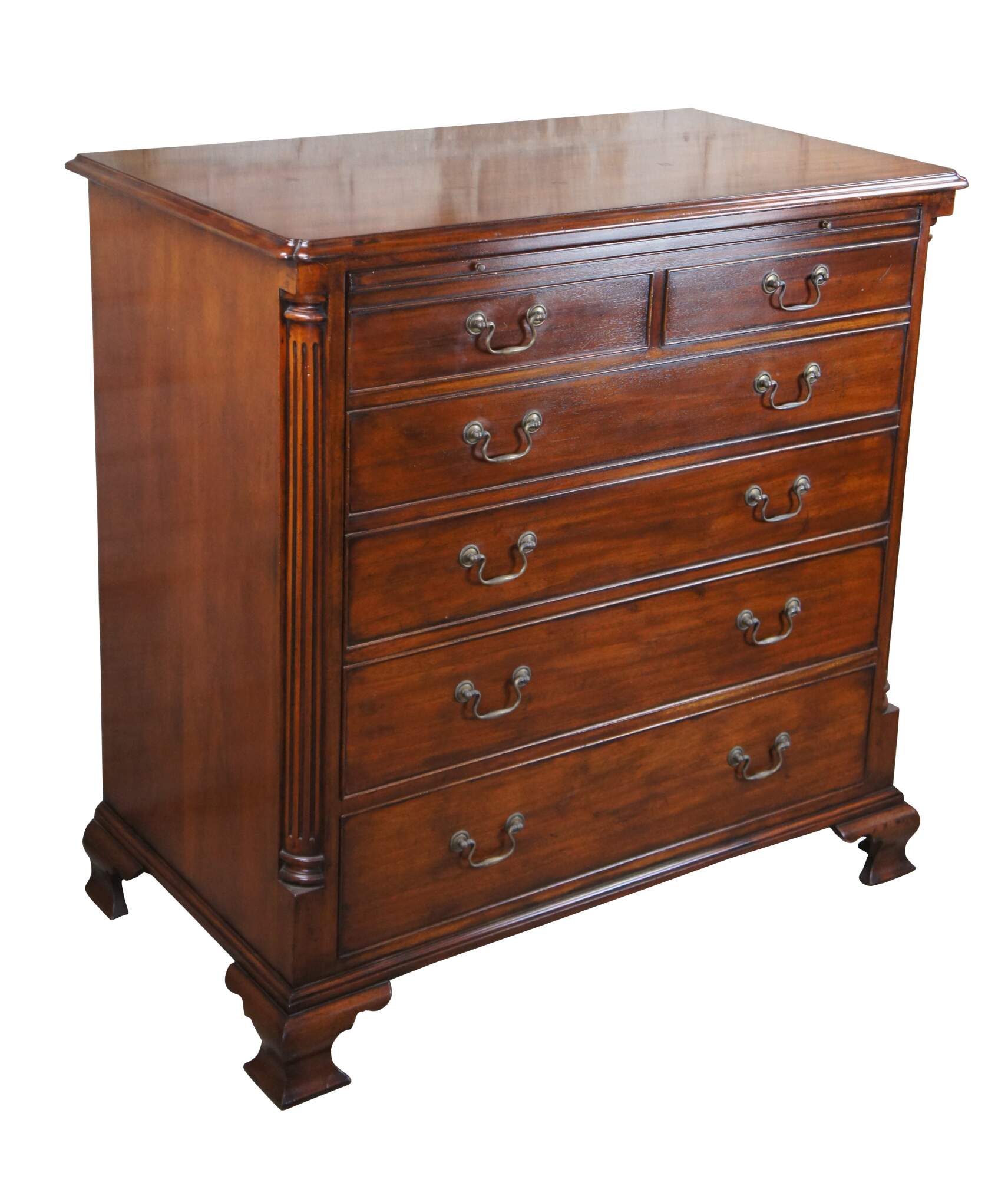 An exquisite 18th Century reproduction in the form of a mahogany bachelors chest by Arthur Brett. Features a faux 2 over 4 drawer graduated design which draws forward and slides back to reveal an interior compartment intended for a television. Interior compartment can also be used as a drybar or other accessory storage. The cabinet is fitted with one lower drawer and drop lid allowing for ease of use with electronics / setup boxes. The corners also known as "stiles" showcase quarter cut fluted columns. The case is supported by Ogee bracket feet. A truly exceptional example of craftsmaship and world class design. Makers mark along backside.