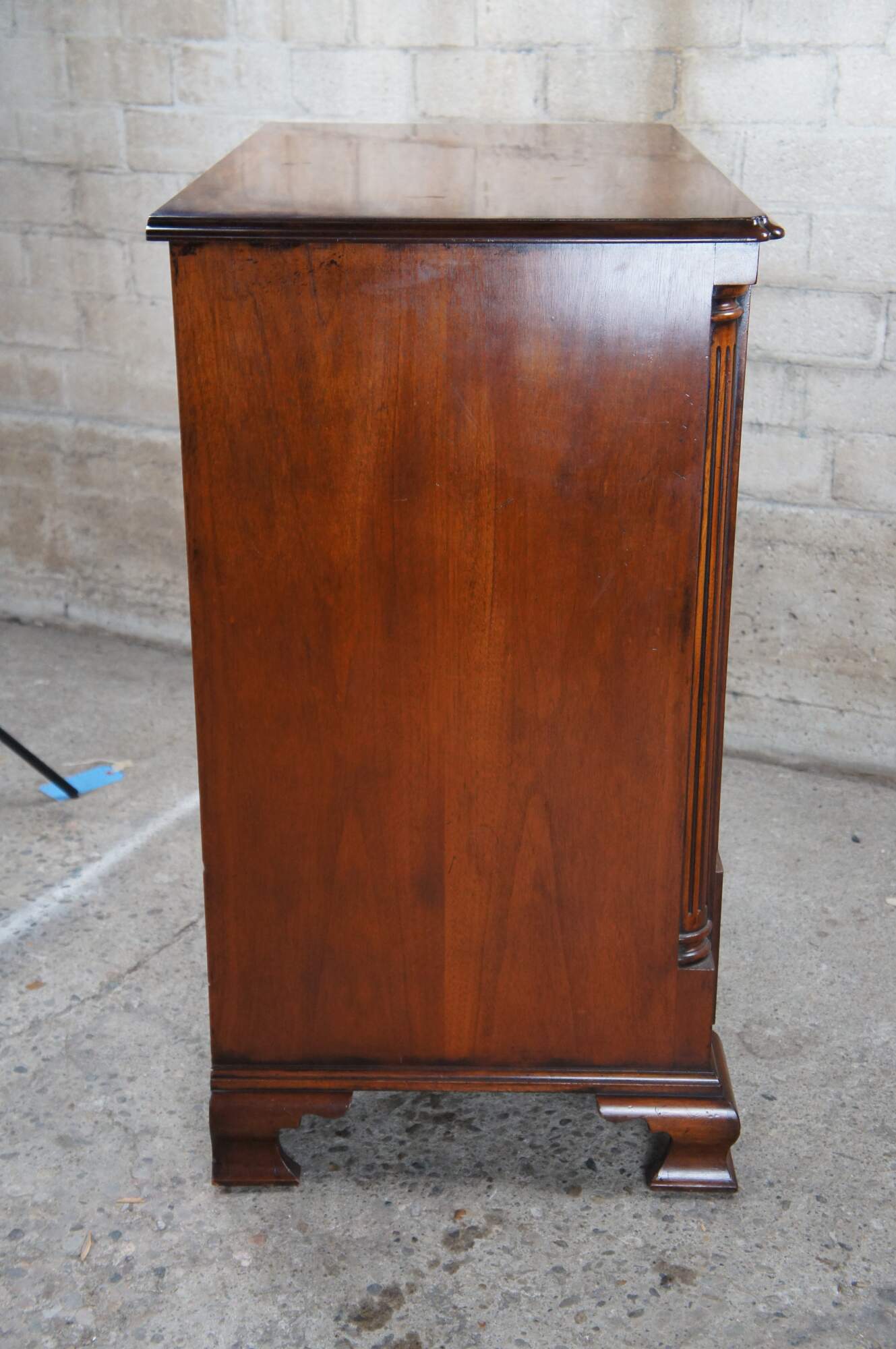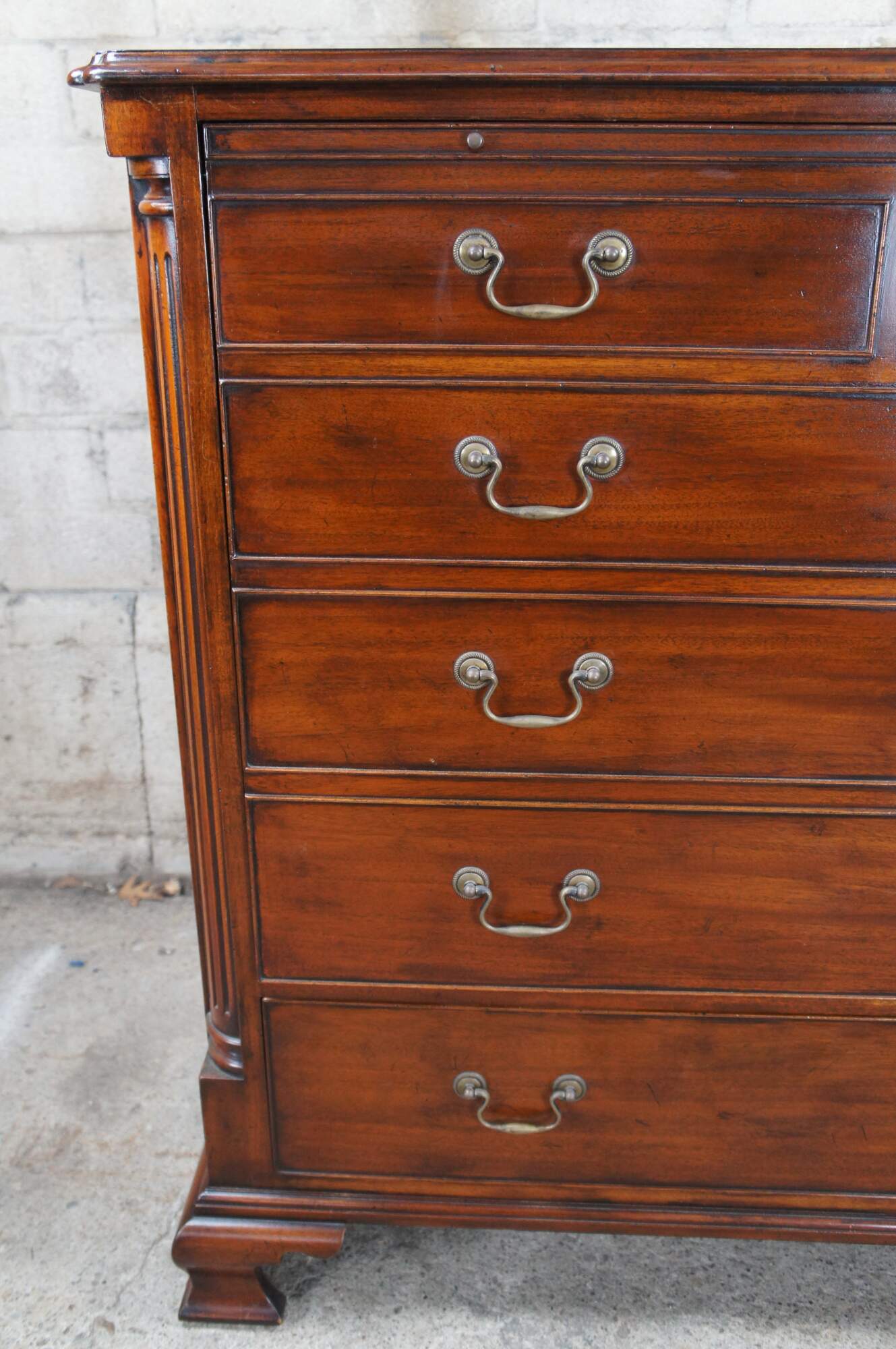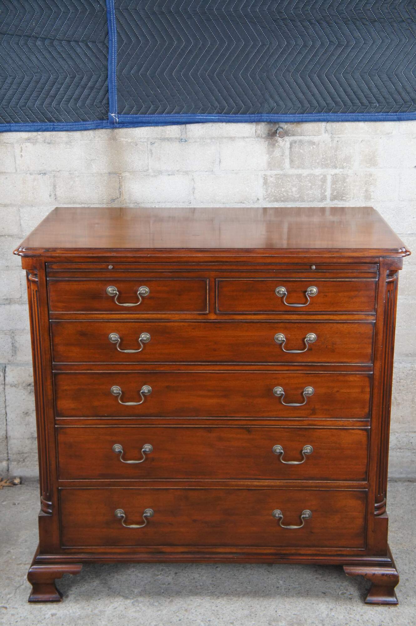 An exquisite 18th Century reproduction in the form of a mahogany bachelors chest by Arthur Brett. Features a faux 2 over 4 drawer graduated design which draws forward and slides back to reveal an interior compartment intended for a television. Interior compartment can also be used as a drybar or other accessory storage. The cabinet is fitted with one lower drawer and drop lid allowing for ease of use with electronics / setup boxes. The corners also known as "stiles" showcase quarter cut fluted columns. The case is supported by Ogee bracket feet. A truly exceptional example of craftsmaship and world class design. Makers mark along backside.