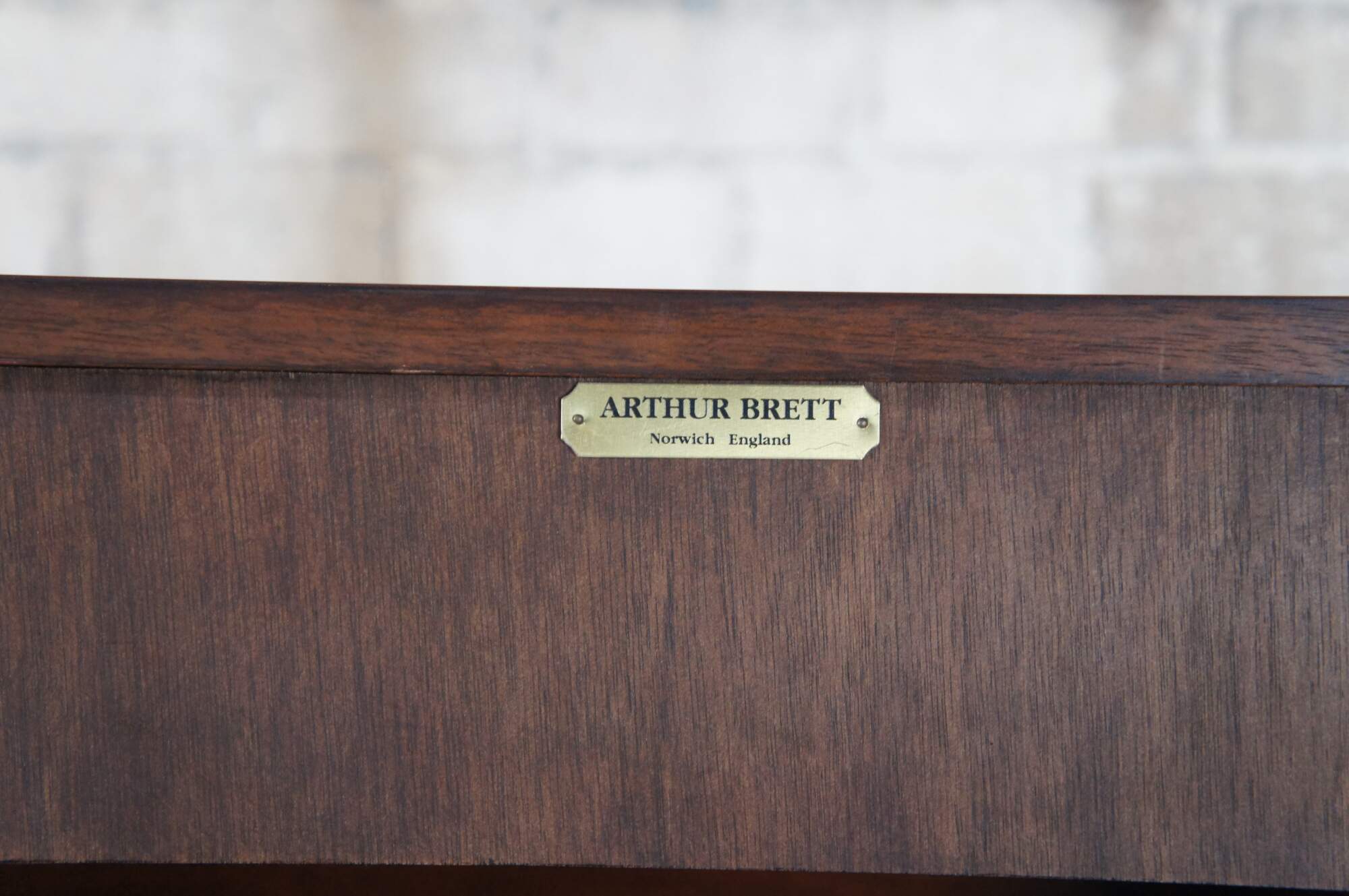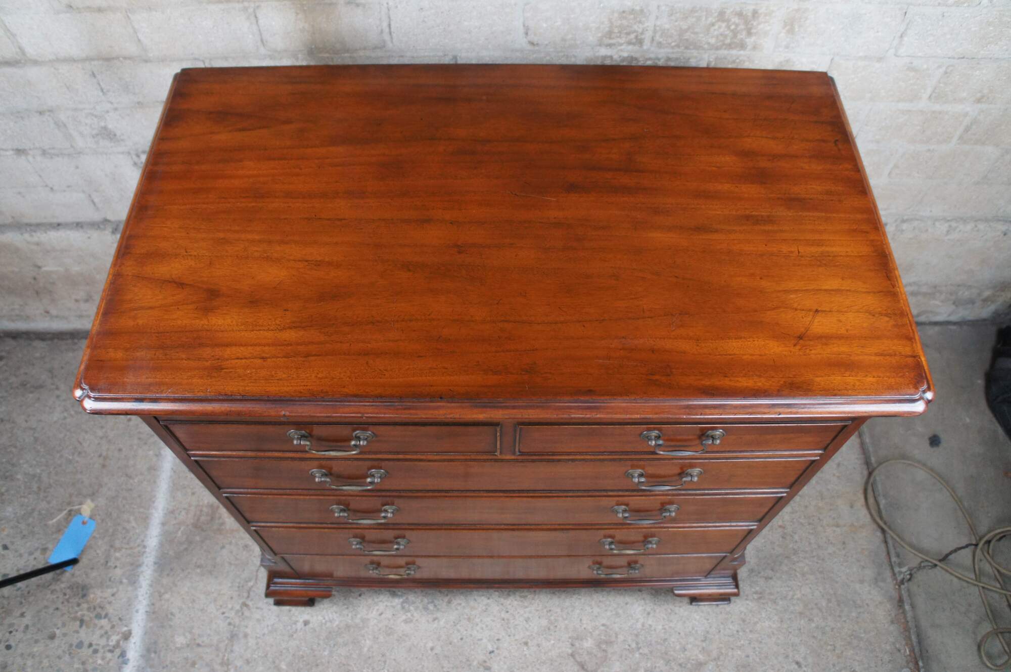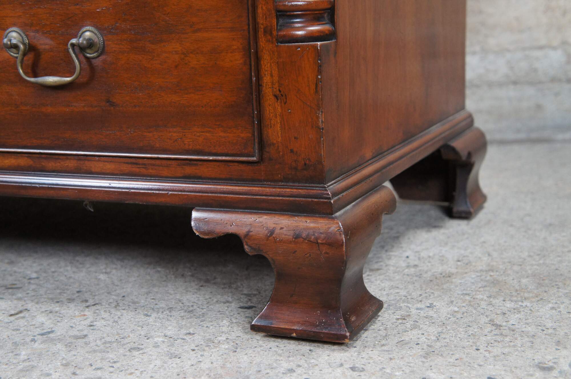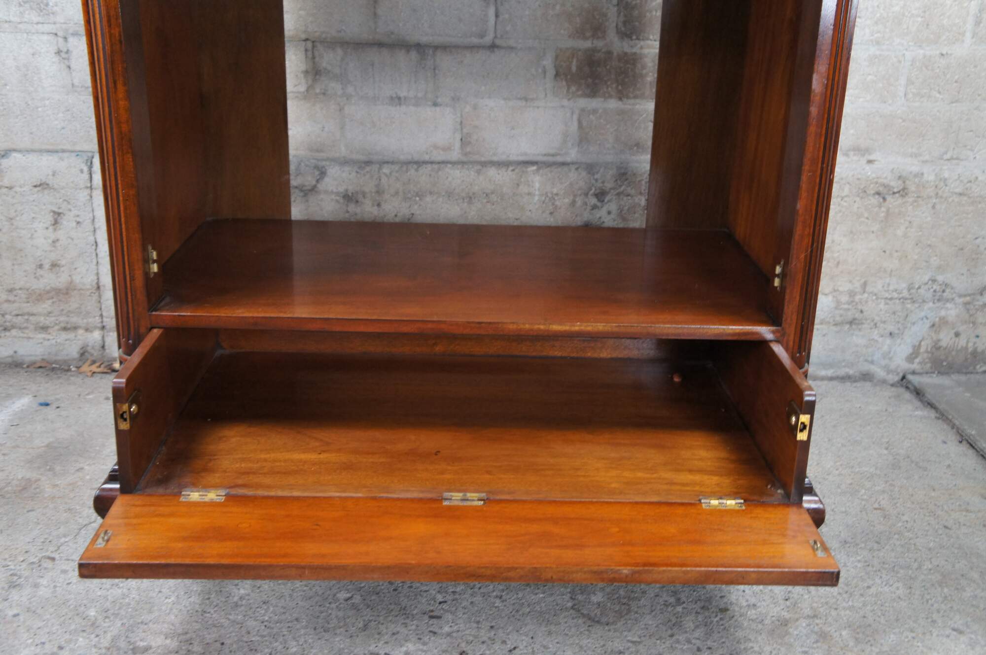 An exquisite 18th Century reproduction in the form of a mahogany bachelors chest by Arthur Brett. Features a faux 2 over 4 drawer graduated design which draws forward and slides back to reveal an interior compartment intended for a television. Interior compartment can also be used as a drybar or other accessory storage. The cabinet is fitted with one lower drawer and drop lid allowing for ease of use with electronics / setup boxes. The corners also known as "stiles" showcase quarter cut fluted columns. The case is supported by Ogee bracket feet. A truly exceptional example of craftsmaship and world class design. Makers mark along backside.