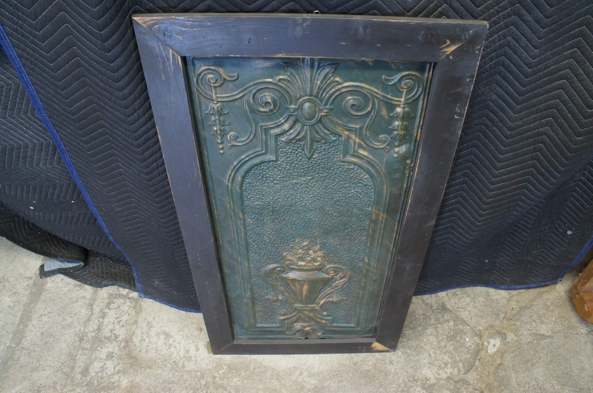 Vintage decorative embossed and hammered tin panel featuring a trophy urn with flowers, fleur de lis and acanthus accents.