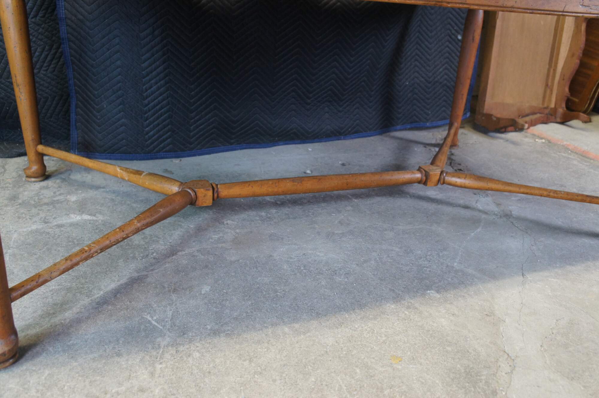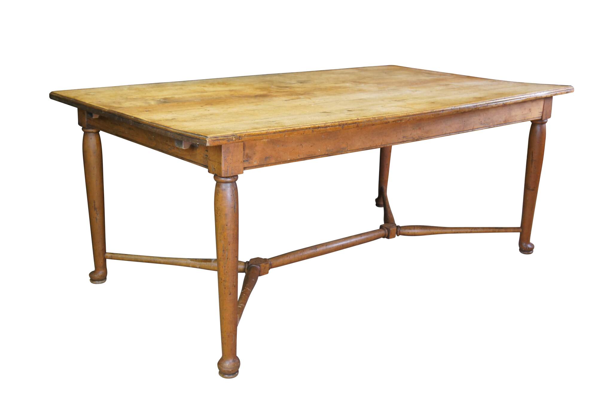 Antique primitive country farmhouse dining table. Made of pine featuring a plank top with slipper feet connected by trestle base stretcher.