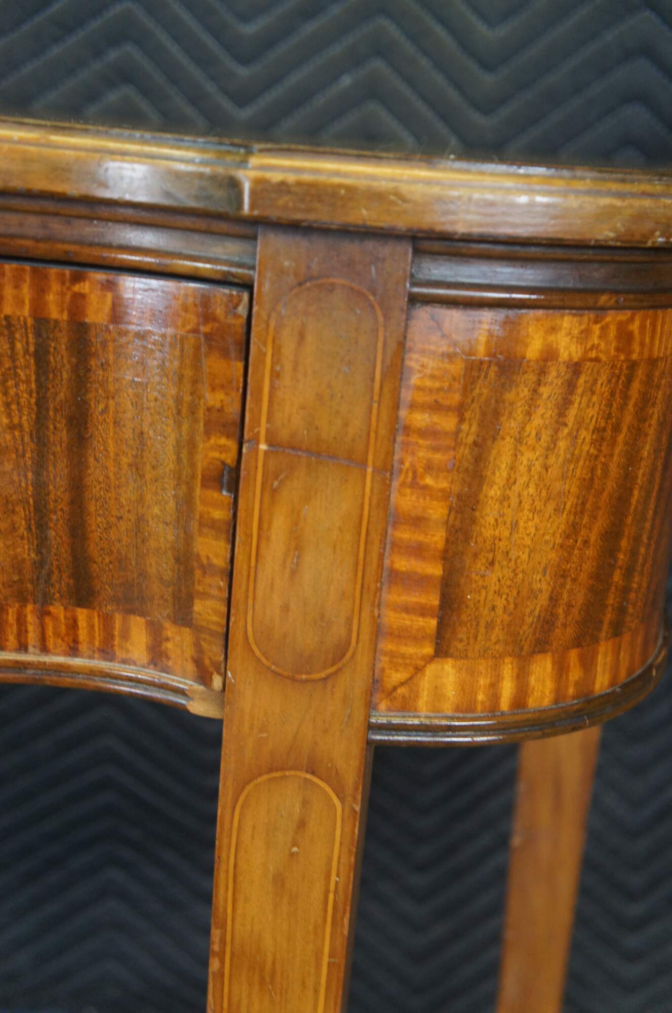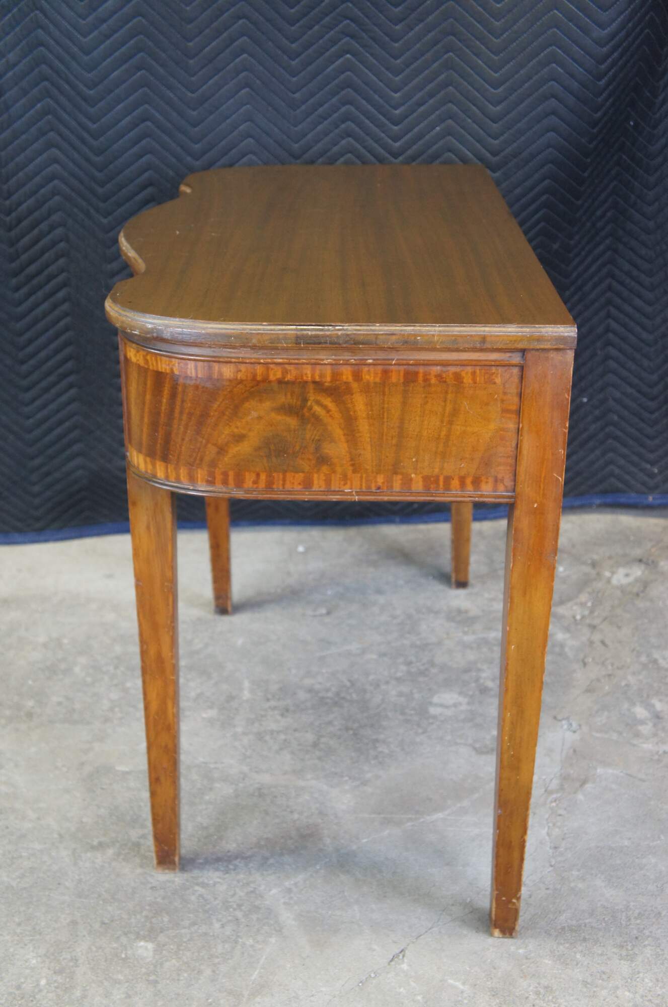 Antique Flame Mahogany console table featuring English Hepplewhite styling with serpentine form, inlaid accents and large drawer.
