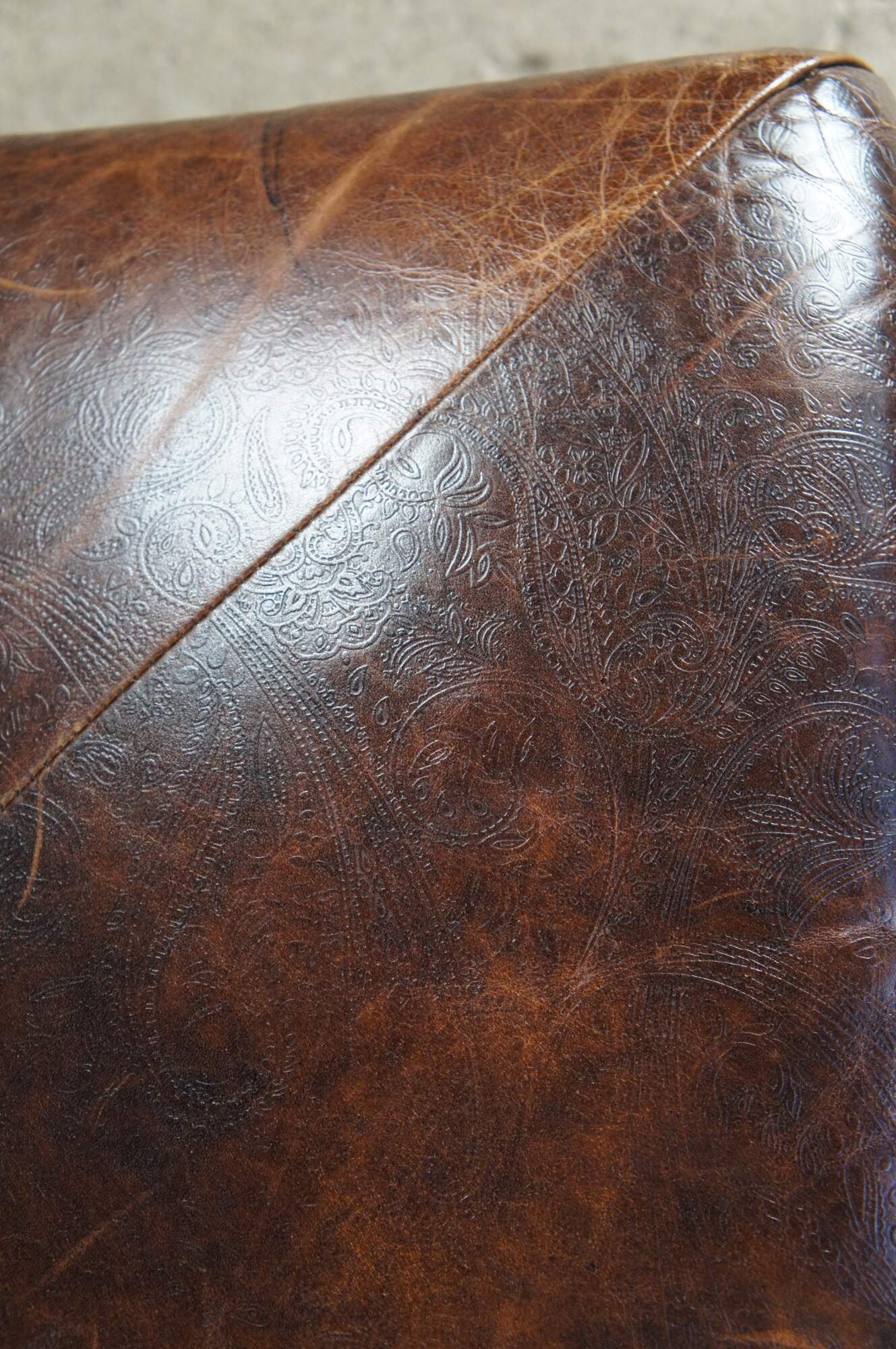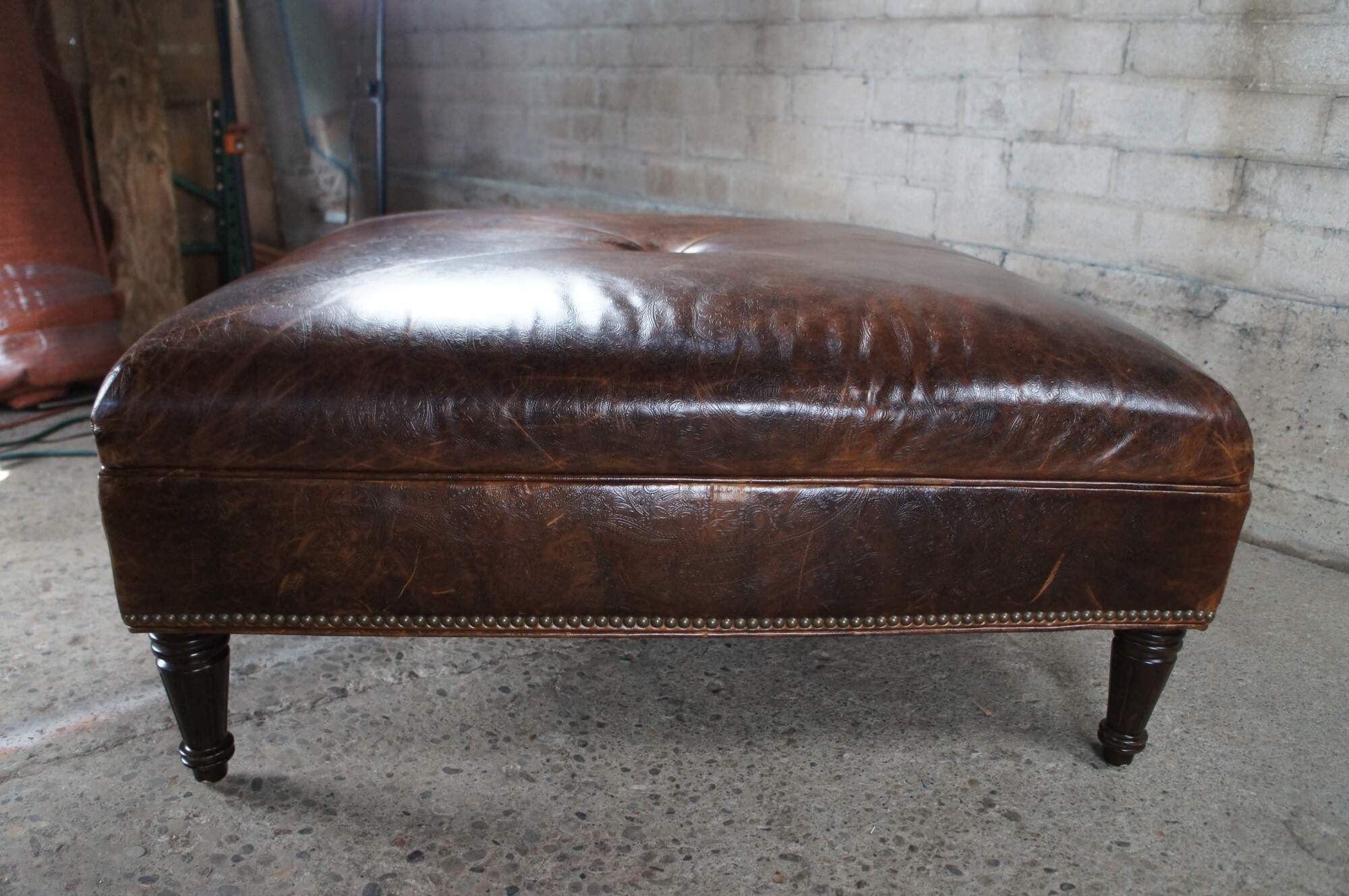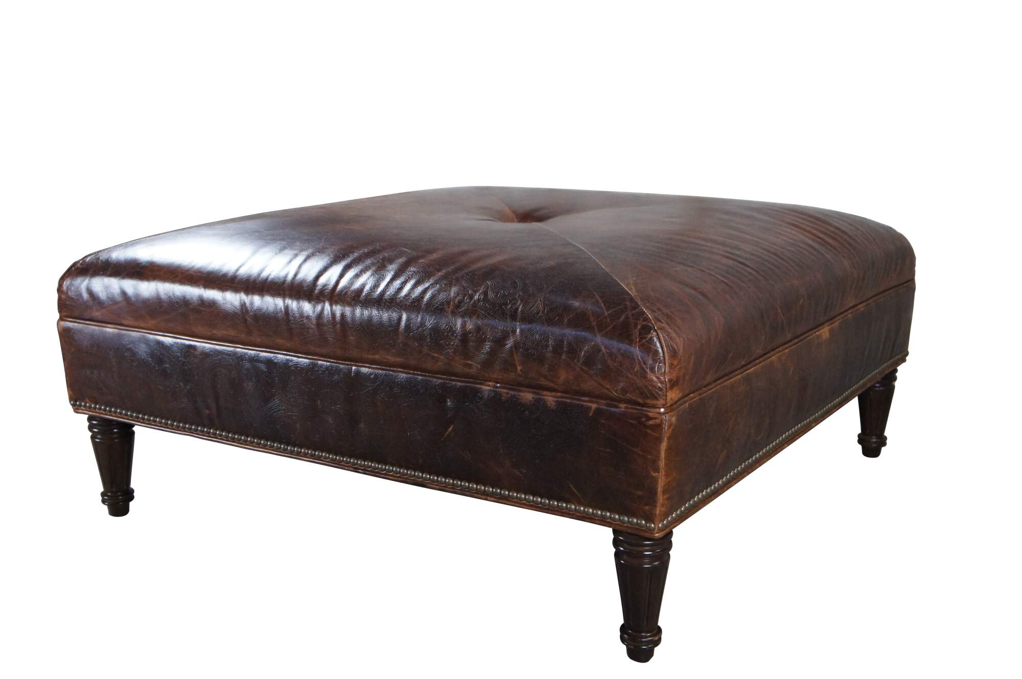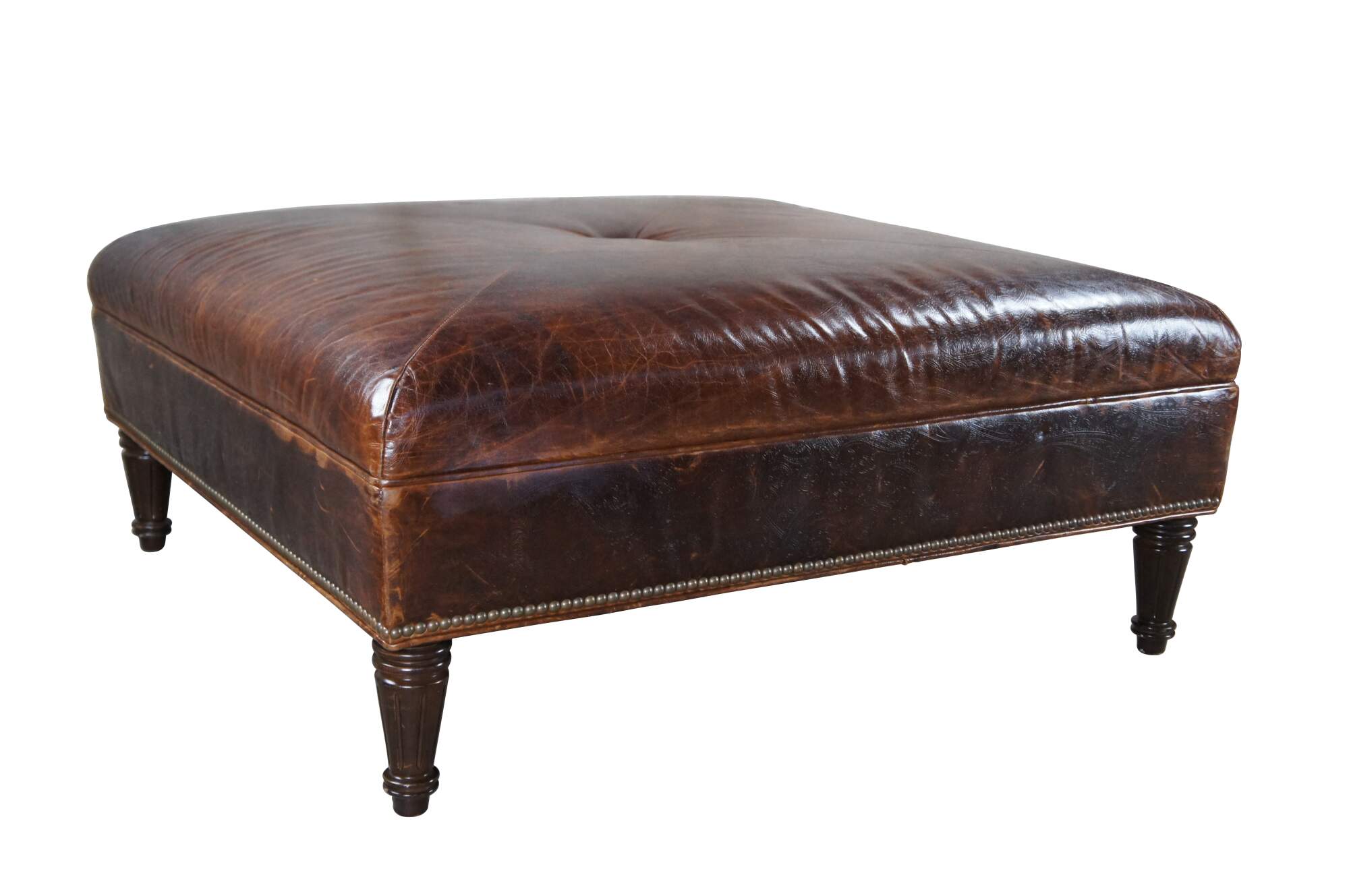 Vintage Vanguard brown leather square ottoman featuring mitered paisley and nailhead design with button tuft.