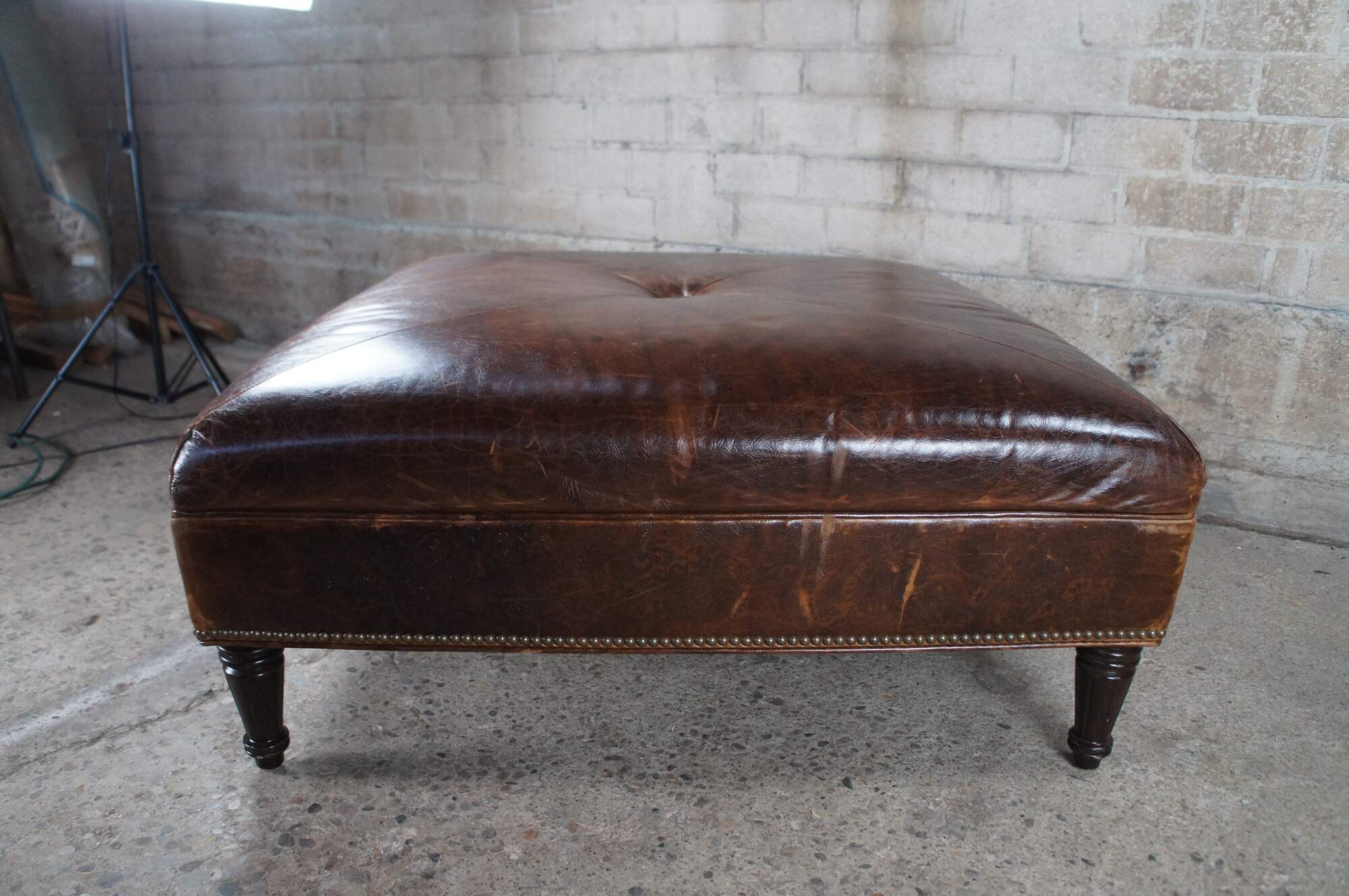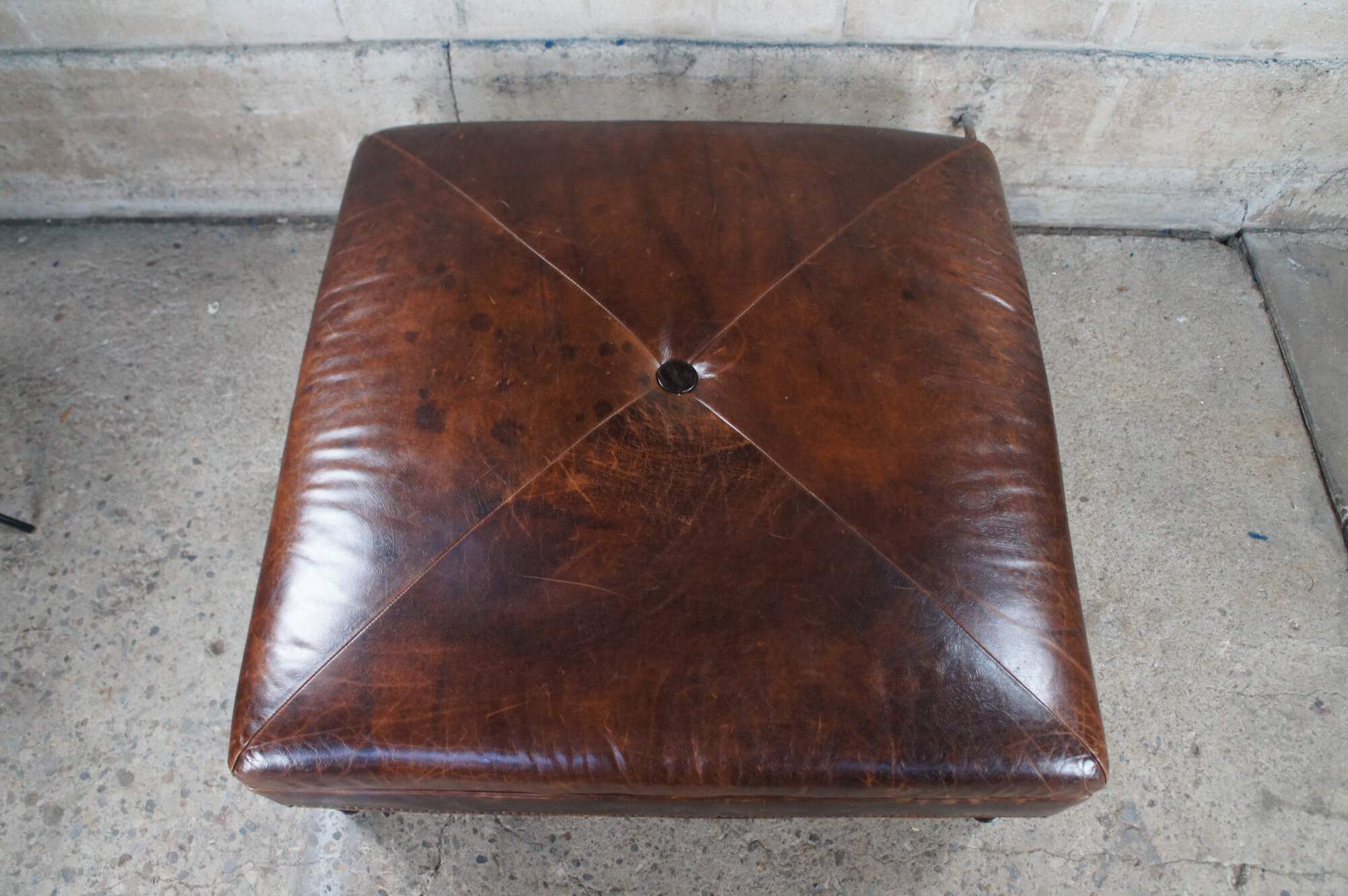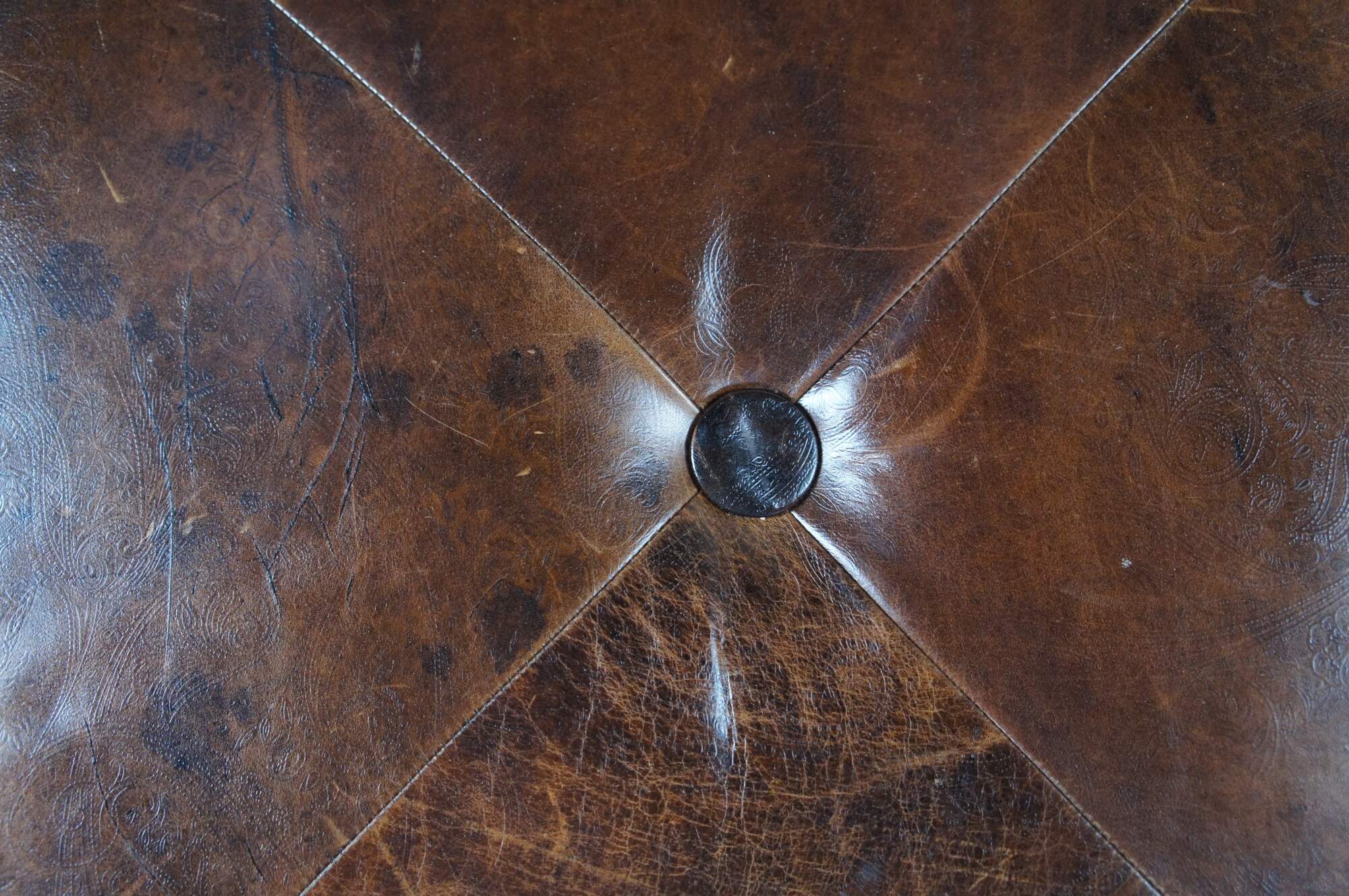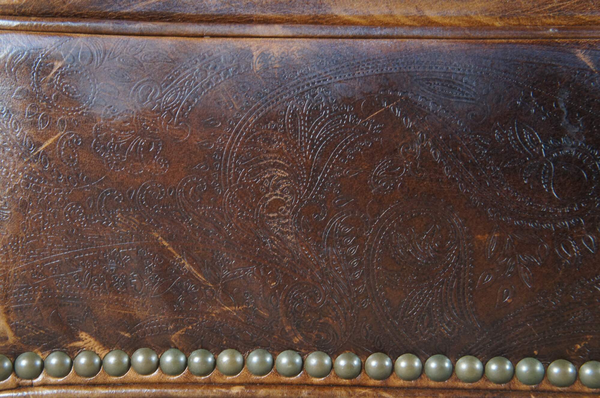 Vintage Vanguard brown leather square ottoman featuring mitered paisley and nailhead design with button tuft.
