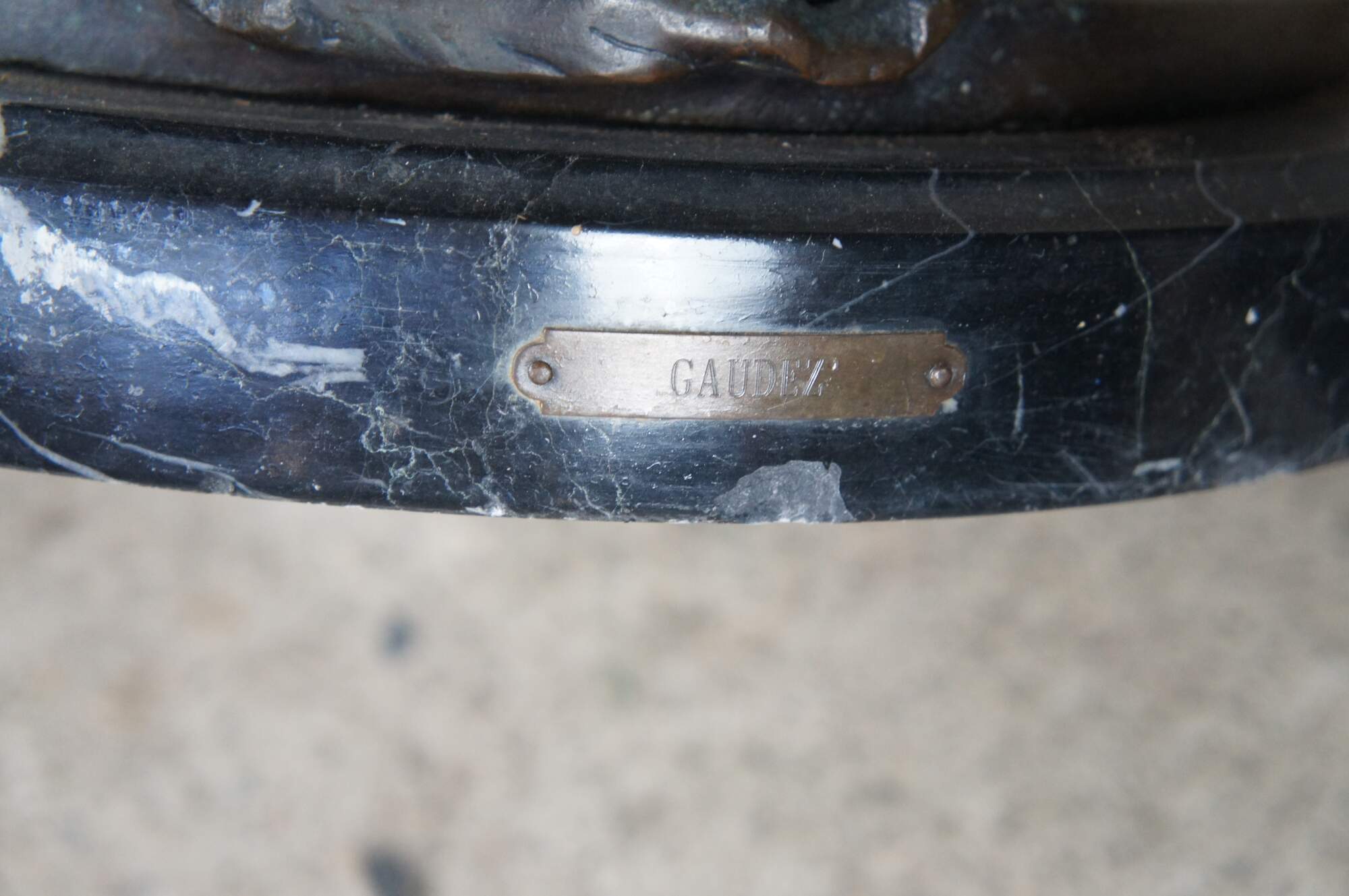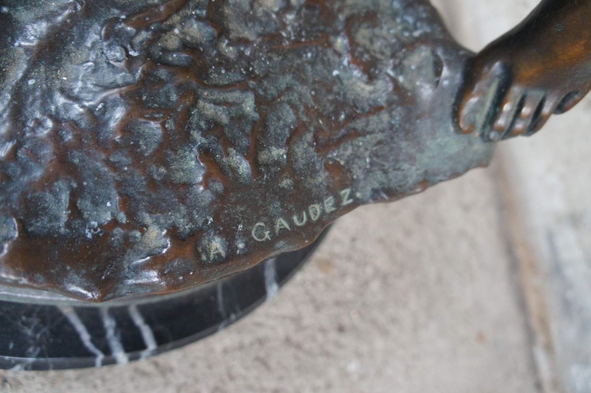 A remarkable French Bronze sculpture of Acteon by Adrein Etienne Gaudez. The statue is sculpted in lifelike detail, featuring Acteon with a bird in his outstretched arm, standing on one leg with a French horn in his other arm. Includes a neat Cartouche label surrounded by a bat and horn. The bronze is signed along the top of the base and rests on a marble plinth.