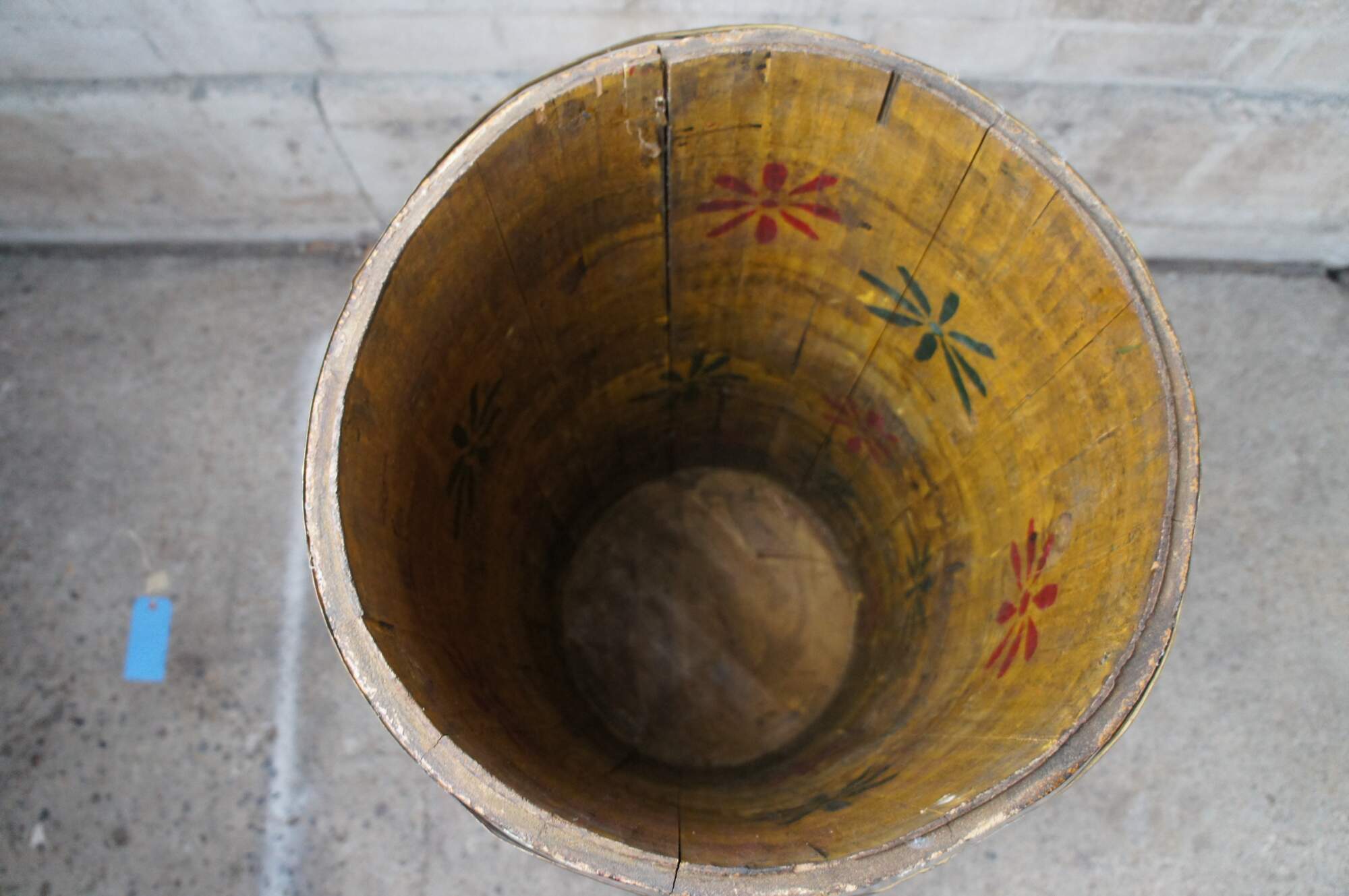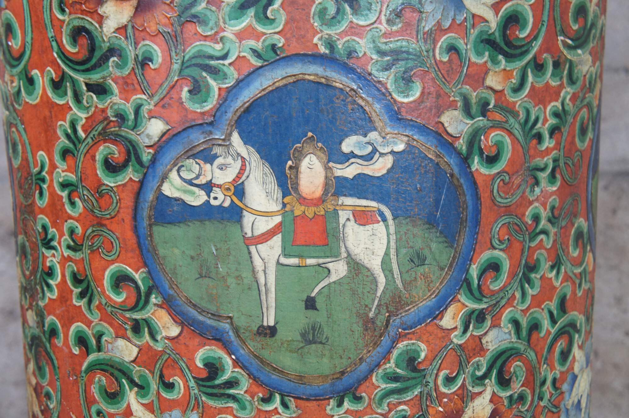 20th Century Tibetan hand painted cylindrical box, barrel, bin or umbrella stand. Features a vibrant polychrome pattern featuring foliate and beaded designs. Mountains and clouds can be seen at the base as well as a different figure at every quarter turn of the vessel. Originally used as a box with latch and lid. Without the top it will make a great cane or umbrella stand. Circa first half 20th century